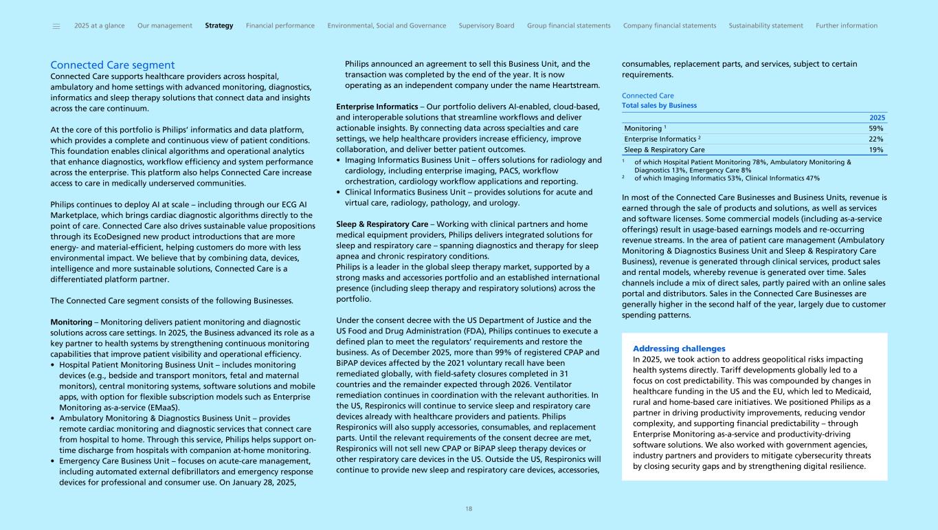 Connected Care segment Connected Care supports healthcare providers across hospital, ambulatory and home settings with advanced monitoring, diagnostics, informatics and sleep therapy solutions that connect data and insights across the care continuum. At the core of this portfolio is Philips’ informatics and data platform, which provides a complete and continuous view of patient conditions. This foundation enables clinical algorithms and operational analytics that enhance diagnostics, workflow efficiency and system performance across the enterprise. This platform also helps Connected Care increase access to care in medically underserved communities. Philips continues to deploy AI at scale – including through our ECG AI Marketplace, which brings cardiac diagnostic algorithms directly to the point of care. Connected Care also drives sustainable value propositions through its EcoDesigned new product introductions that are more energy- and material-efficient, helping customers do more with less environmental impact. We believe that by combining data, devices, intelligence and more sustainable solutions, Connected Care is a differentiated platform partner. The Connected Care segment consists of the following Businesses. Monitoring – Monitoring delivers patient monitoring and diagnostic solutions across care settings. In 2025, the Business advanced its role as a key partner to health systems by strengthening continuous monitoring capabilities that improve patient visibility and operational efficiency. • Hospital Patient Monitoring Business Unit – includes monitoring devices (e.g., bedside and transport monitors, fetal and maternal monitors), central monitoring systems, software solutions and mobile apps, with option for flexible subscription models such as Enterprise Monitoring as-a-service (EMaaS). • Ambulatory Monitoring & Diagnostics Business Unit – provides remote cardiac monitoring and diagnostic services that connect care from hospital to home. Through this service, Philips helps support on- time discharge from hospitals with companion at-home monitoring. • Emergency Care Business Unit – focuses on acute-care management, including automated external defibrillators and emergency response devices for professional and consumer use. On January 28, 2025, Philips announced an agreement to sell this Business Unit, and the transaction was completed by the end of the year. It is now operating as an independent company under the name Heartstream. Enterprise Informatics – Our portfolio delivers AI-enabled, cloud-based, and interoperable solutions that streamline workflows and deliver actionable insights. By connecting data across specialties and care settings, we help healthcare providers increase efficiency, improve collaboration, and deliver better patient outcomes. • Imaging Informatics Business Unit – offers solutions for radiology and cardiology, including enterprise imaging, PACS, workflow orchestration, cardiology workflow applications and reporting. • Clinical Informatics Business Unit – provides solutions for acute and virtual care, radiology, pathology, and urology. Sleep & Respiratory Care – Working with clinical partners and home medical equipment providers, Philips delivers integrated solutions for sleep and respiratory care – spanning diagnostics and therapy for sleep apnea and chronic respiratory conditions. Philips is a leader in the global sleep therapy market, supported by a strong masks and accessories portfolio and an established international presence (including sleep therapy and respiratory solutions) across the portfolio. Under the consent decree with the US Department of Justice and the US Food and Drug Administration (FDA), Philips continues to execute a defined plan to meet the regulators’ requirements and restore the business. As of December 2025, more than 99% of registered CPAP and BiPAP devices affected by the 2021 voluntary recall have been remediated globally, with field-safety closures completed in 31 countries and the remainder expected through 2026. Ventilator remediation continues in coordination with the relevant authorities. In the US, Respironics will continue to service sleep and respiratory care devices already with healthcare providers and patients. Philips Respironics will also supply accessories, consumables, and replacement parts. Until the relevant requirements of the consent decree are met, Respironics will not sell new CPAP or BiPAP sleep therapy devices or other respiratory care devices in the US. Outside the US, Respironics will continue to provide new sleep and respiratory care devices, accessories, consumables, replacement parts, and services, subject to certain requirements. Connected Care Total sales by Business Monitoring 1 59% Enterprise Informatics 2 22% Sleep & Respiratory Care 19% 2025 1 of which Hospital Patient Monitoring 78%, Ambulatory Monitoring & Diagnostics 13%, Emergency Care 8% 2 of which Imaging Informatics 53%, Clinical Informatics 47% In most of the Connected Care Businesses and Business Units, revenue is earned through the sale of products and solutions, as well as services and software licenses. Some commercial models (including as-a-service offerings) result in usage-based earnings models and re-occurring revenue streams. In the area of patient care management (Ambulatory Monitoring & Diagnostics Business Unit and Sleep & Respiratory Care Business), revenue is generated through clinical services, product sales and rental models, whereby revenue is generated over time. Sales channels include a mix of direct sales, partly paired with an online sales portal and distributors. Sales in the Connected Care Businesses are generally higher in the second half of the year, largely due to customer spending patterns. Addressing challenges In 2025, we took action to address geopolitical risks impacting health systems directly. Tariff developments globally led to a focus on cost predictability. This was comp