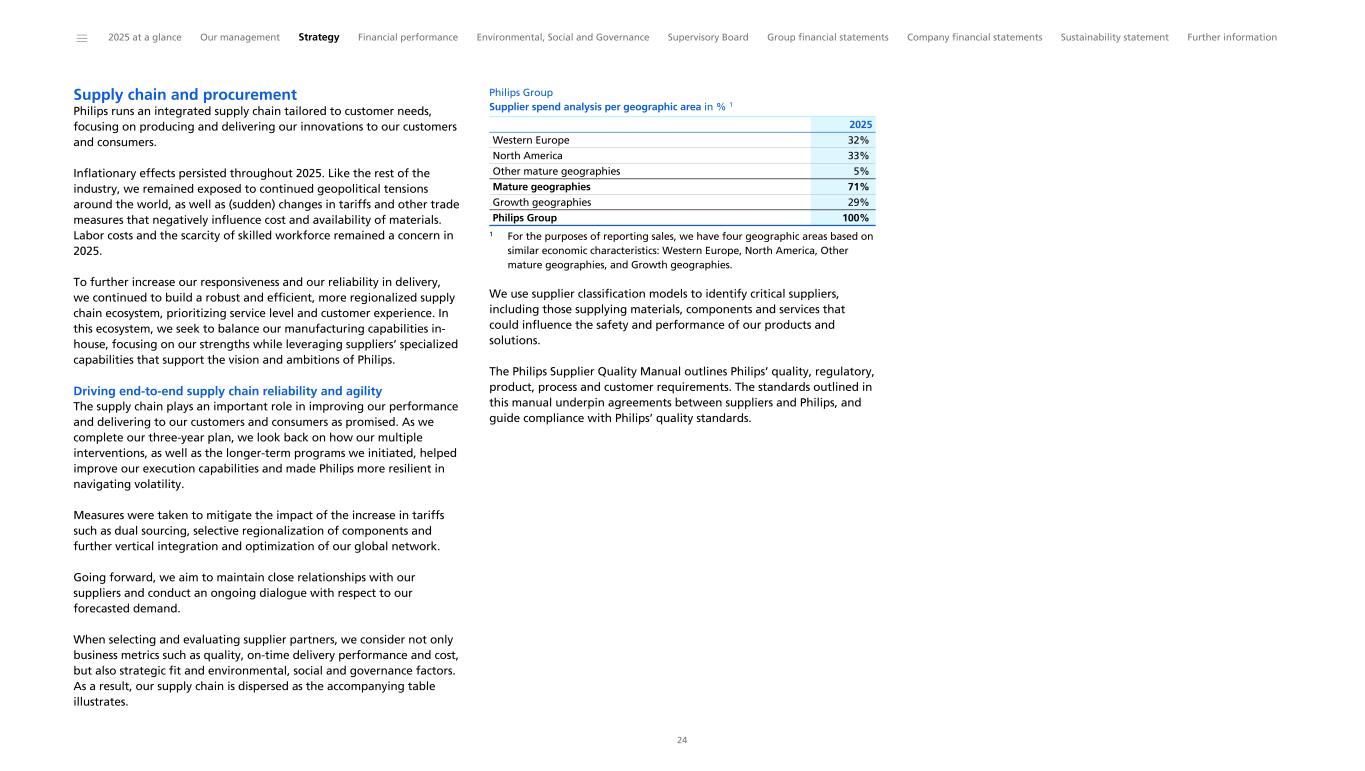 Supply chain and procurement Philips runs an integrated supply chain tailored to customer needs, focusing on producing and delivering our innovations to our customers and consumers. Inflationary effects persisted throughout 2025. Like the rest of the industry, we remained exposed to continued geopolitical tensions around the world, as well as (sudden) changes in tariffs and other trade measures that negatively influence cost and availability of materials. Labor costs and the scarcity of skilled workforce remained a concern in 2025. To further increase our responsiveness and our reliability in delivery, we continued to build a robust and efficient, more regionalized supply chain ecosystem, prioritizing service level and customer experience. In this ecosystem, we seek to balance our manufacturing capabilities in- house, focusing on our strengths while leveraging suppliers’ specialized capabilities that support the vision and ambitions of Philips. Driving end-to-end supply chain reliability and agility The supply chain plays an important role in improving our performance and delivering to our customers and consumers as promised. As we complete our three-year plan, we look back on how our multiple interventions, as well as the longer-term programs we initiated, helped improve our execution capabilities and made Philips more resilient in navigating volatility. Measures were taken to mitigate the impact of the increase in tariffs such as dual sourcing, selective regionalization of components and further vertical integration and optimization of our global network. Going forward, we aim to maintain close relationships with our suppliers and conduct an ongoing dialogue with respect to our forecasted demand. When selecting and evaluating supplier partners, we consider not only business metrics such as quality, on-time delivery performance and cost, but also strategic fit and environmental, social and governance factors. As a result, our supply chain is dispersed as the accompanying table illustrates. Philips Group Supplier spend analysis per geographic area in % 1 Western Europe 32% North America 33% Other mature geographies 5% Mature geographies 71% Growth geographies 29% Philips Group 100% 2025 1 For the purposes of reporting sales, we have four geographic areas based on similar economic characteristics: Western Europe, North America, Other mature geographies, and Growth geographies. We use supplier classification models to identify critical suppliers, including those supplying materials, components and services that could influence the safety and performance of our products and solutions. The Philips Supplier Quality Manual outlines Philips’ quality, regulatory, product, process and customer requirements. The standards outlined in this manual underpin agreements between suppliers and Philips, and guide compliance with Philips’ quality standards. ______ 2025 at a glance Our management Strategy Financial performance Environmental, Social and Governance Supervisory Board Group financial statements Company financial statements Sustainability statement Further information 24