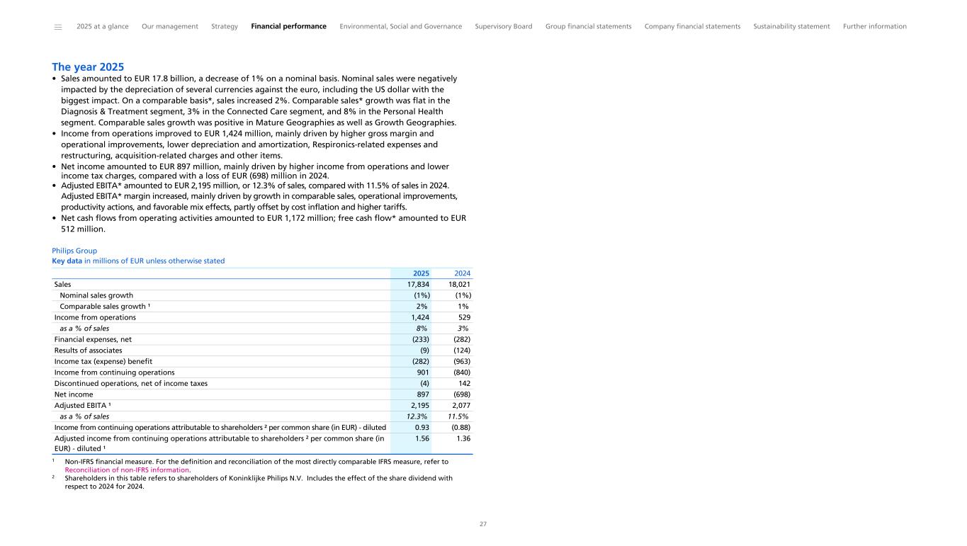 The year 2025 • Sales amounted to EUR 17.8 billion, a decrease of 1% on a nominal basis. Nominal sales were negatively impacted by the depreciation of several currencies against the euro, including the US dollar with the biggest impact. On a comparable basis*, sales increased 2%. Comparable sales* growth was flat in the Diagnosis & Treatment segment, 3% in the Connected Care segment, and 8% in the Personal Health segment. Comparable sales growth was positive in Mature Geographies as well as Growth Geographies. • Income from operations improved to EUR 1,424 million, mainly driven by higher gross margin and operational improvements, lower depreciation and amortization, Respironics-related expenses and restructuring, acquisition-related charges and other items. • Net income amounted to EUR 897 million, mainly driven by higher income from operations and lower income tax charges, compared with a loss of EUR (698) million in 2024. • Adjusted EBITA* amounted to EUR 2,195 million, or 12.3% of sales, compared with 11.5% of sales in 2024. Adjusted EBITA* margin increased, mainly driven by growth in comparable sales, operational improvements, productivity actions, and favorable mix effects, partly offset by cost inflation and higher tariffs. • Net cash flows from operating activities amounted to EUR 1,172 million; free cash flow* amounted to EUR 512 million. Philips Group Key data in millions of EUR unless otherwise stated Sales 17,834 18,021 Nominal sales growth (1%) (1%) Comparable sales growth ¹ 2% 1% Income from operations 1,424 529 as a % of sales 8% 3% Financial expenses, net (233) (282) Results of associates (9) (124) Income tax (expense) benefit (282) (963) Income from continuing operations 901 (840) Discontinued operations, net of income taxes (4) 142 Net income 897 (698) Adjusted EBITA ¹ 2,195 2,077 as a % of sales 12.3% 11.5% Income from continuing operations attributable to shareholders ² per common share (in EUR) - diluted 0.93 (0.88) Adjusted income from continuing operations attributable to shareholders ² per common share (in EUR) - diluted ¹ 1.56 1.36 2025 2024 1 Non-IFRS financial measure. For the definition and reconciliation of the most directly comparable IFRS measure, refer to Reconciliation of non-IFRS information. 2 Shareholders in this table refers to shareholders of Koninklijke Philips N.V. Includes the effect of the share dividend with respect to 2024 for 2024. ______ 2025 at a glance Our management Strategy Financial performance Environmental, Social and Governance Supervisory Board Group financial statements Company financial statements Sustainability statement Further information 27