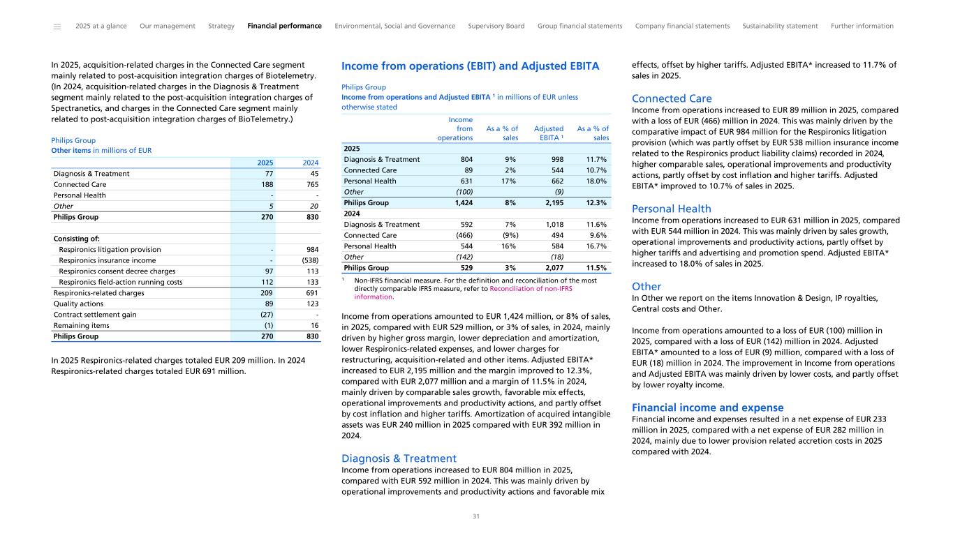 In 2025, acquisition-related charges in the Connected Care segment mainly related to post-acquisition integration charges of Biotelemetry. (In 2024, acquisition-related charges in the Diagnosis & Treatment segment mainly related to the post-acquisition integration charges of Spectranetics, and charges in the Connected Care segment mainly related to post-acquisition integration charges of BioTelemetry.) Philips Group Other items in millions of EUR Diagnosis & Treatment 77 45 Connected Care 188 765 Personal Health - - Other 5 20 Philips Group 270 830 Consisting of: Respironics litigation provision - 984 Respironics insurance income - (538) Respironics consent decree charges 97 113 Respironics field-action running costs 112 133 Respironics-related charges 209 691 Quality actions 89 123 Contract settlement gain (27) - Remaining items (1) 16 Philips Group 270 830 2025 2024 In 2025 Respironics-related charges totaled EUR 209 million. In 2024 Respironics-related charges totaled EUR 691 million. Income from operations (EBIT) and Adjusted EBITA Philips Group Income from operations and Adjusted EBITA 1 in millions of EUR unless otherwise stated 2025 Diagnosis & Treatment 804 9% 998 11.7% Connected Care 89 2% 544 10.7% Personal Health 631 17% 662 18.0% Other (100) (9) Philips Group 1,424 8% 2,195 12.3% 2024 Diagnosis & Treatment 592 7% 1,018 11.6% Connected Care (466) (9%) 494 9.6% Personal Health 544 16% 584 16.7% Other (142) (18) Philips Group 529 3% 2,077 11.5% Income from operations As a % of sales Adjusted EBITA ¹ As a % of sales 1 Non-IFRS financial measure. For the definition and reconciliation of the most directly comparable IFRS measure, refer to Reconciliation of non-IFRS information. Income from operations amounted to EUR 1,424 million, or 8% of sales, in 2025, compared with EUR 529 million, or 3% of sales, in 2024, mainly driven by higher gross margin, lower depreciation and amortization, lower Respironics-related expenses, and lower charges for restructuring, acquisition-related and other items. Adjusted EBITA* increased to EUR 2,195 million and the margin improved to 12.3%, compared with EUR 2,077 million and a margin of 11.5% in 2024, mainly driven by comparable sales growth, favorable mix effects, operational improvements and productivity actions, and partly offset by cost inflation and higher tariffs. Amortization of acquired intangible assets was EUR 240 million in 2025 compared with EUR 392 million in 2024. Diagnosis & Treatment Income from operations increased to EUR 804 million in 2025, compared with EUR 592 million in 2024. This was mainly driven by operational improvements and productivity actions and favorable mix effects, offset by higher tariffs. Adjusted EBITA* increased to 11.7% of sales in 2025. Connected Care Income from operations increased to EUR 89 million in 2025, compared with a loss of EUR (466) million in 2024. This was mainly driven by the comparative impact of EUR 984 million for the Respironics litigation provision (which was partly offset by EUR 538 million insurance income related to the Respironics product liability claims) recorded in 2024, higher comparable sales, operational improvements and productivity actions, partly offset by cost inflation and higher tariffs. Adjusted EBITA* improved to 10.7% of sales in 2025. Personal Health Income from operations increased to EUR 631 million in 2025, compared with EUR 544 million in 2024. This was mainly driven by sales growth, operational improvements and productivity actions, partly offset by higher tariffs and advertising and promotion spend. Adjusted EBITA* increased to 18.0% of sales in 2025. Other In Other we report on the items Innovation & Design, IP royalties, Central costs and Other. Income from operations amounted to a loss of EUR (100) million in 2025, compared with a loss of EUR (142) million in 2024. Adjusted EBITA* amounted to a loss of EUR (9) million, compared with a loss of EUR (18) million in 2024. The improvement in Income from operations and Adjusted EBITA was mainly driven by lower costs, and partly offset by lower royalty income. Financial income and expense Financial income and expenses resulted in a net expense of EUR 233 million in 2025, compared with a net expense of EUR 282 million in 2024, mainly due to lower provision related accretion costs in 2025 compared with 2024. ______ 2025 at a glance Our management Strategy Financial performance Environmental, Social and Governance Supervisory Board Group financial statements Company financial statements Sustainability statement Further information 31