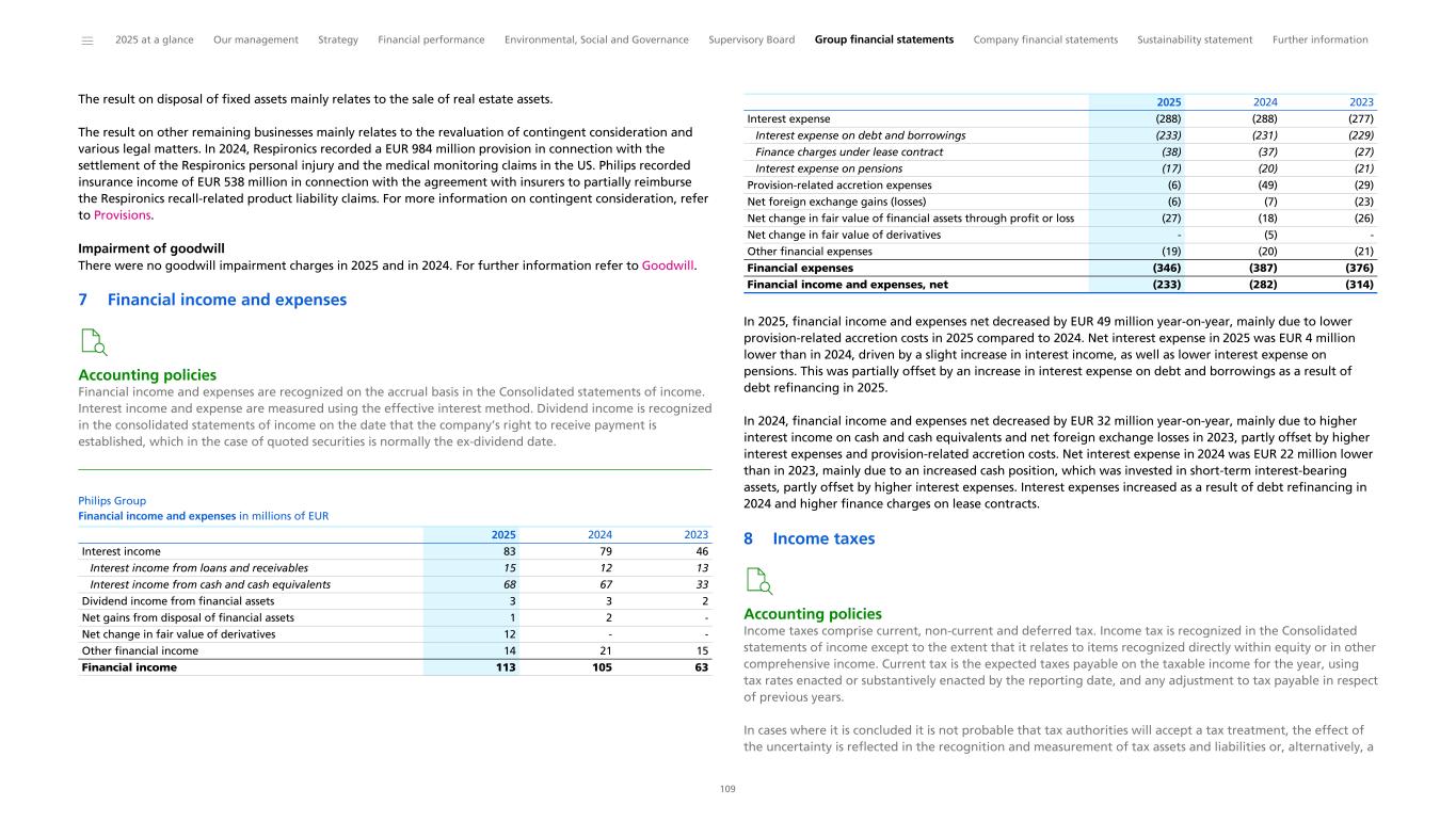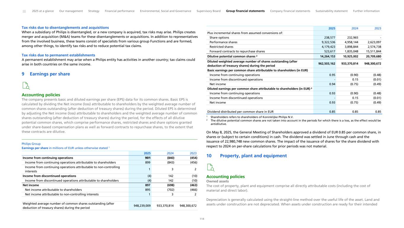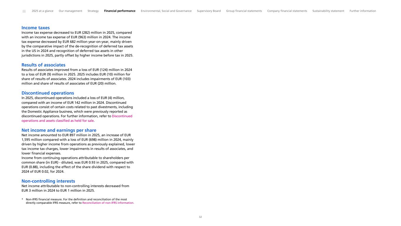Income taxes Income tax expense decreased to EUR (282) million in 2025, compared with an income tax expense of EUR (963) million in 2024. The income tax expense decreased by EUR 682 million year-on-year, mainly driven by the comparative impact of the de-recognition of deferred tax assets in the US in 2024 and recognition of deferred tax assets in other jurisdictions in 2025, partly offset by higher income before tax in 2025. Results of associates Results of associates improved from a loss of EUR (124) million in 2024 to a loss of EUR (9) million in 2025. 2025 includes EUR (10) million for share of results of associates. 2024 includes impairments of EUR (103) million and share of results of associates of EUR (20) million. Discontinued operations In 2025, discontinued operations included a loss of EUR (4) million, compared with an income of EUR 142 million in 2024. Discontinued operations consist of certain costs related to past divestments, including the Domestic Appliance business, which were previously reported as discontinued operations. For further information, refer to Discontinued operations and assets classified as held for sale. Net income and earnings per share Net income amounted to EUR 897 million in 2025, an increase of EUR 1,595 million compared with a loss of EUR (698) million in 2024, mainly driven by higher income from operations as previously explained, lower tax income tax charges, lower impairments in results of associates, and lower financial expenses. Income from continuing operations attributable to shareholders per common share (in EUR) - diluted, was EUR 0.93 in 2025, compared with EUR (0.88), including the effect of the share dividend with respect to 2024 of EUR 0.02, for 2024. Non-controlling interests Net income attributable to non-controlling interests decreased from EUR 3 million in 2024 to EUR 1 million in 2025. * Non-IFRS financial measure. For the definition and reconciliation of the most directly comparable IFRS measure, refer to Reconciliation of non-IFRS information. ______ 2025 at a glance Our management Strategy Financial performance Environmental, Social and Governance Supervisory Board Group financial statements Company financial statements Sustainability statement Further information 32