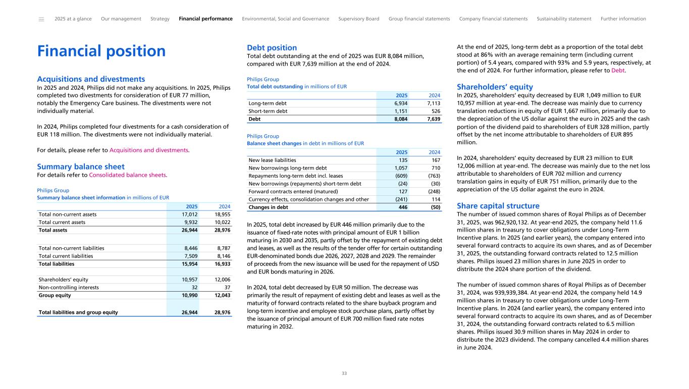 Financial position Acquisitions and divestments In 2025 and 2024, Philips did not make any acquisitions. In 2025, Philips completed two divestments for consideration of EUR 77 million, notably the Emergency Care business. The divestments were not individually material. In 2024, Philips completed four divestments for a cash consideration of EUR 118 million. The divestments were not individually material. For details, please refer to Acquisitions and divestments. Summary balance sheet For details refer to Consolidated balance sheets. Philips Group Summary balance sheet information in millions of EUR Total non-current assets 17,012 18,955 Total current assets 9,932 10,022 Total assets 26,944 28,976 Total non-current liabilities 8,446 8,787 Total current liabilities 7,509 8,146 Total liabilities 15,954 16,933 Shareholders’ equity 10,957 12,006 Non-controlling interests 32 37 Group equity 10,990 12,043 Total liabilities and group equity 26,944 28,976 2025 2024 Debt position Total debt outstanding at the end of 2025 was EUR 8,084 million, compared with EUR 7,639 million at the end of 2024. Philips Group Total debt outstanding in millions of EUR Long-term debt 6,934 7,113 Short-term debt 1,151 526 Debt 8,084 7,639 2025 2024 Philips Group Balance sheet changes in debt in millions of EUR New lease liabilities 135 167 New borrowings long-term debt 1,057 710 Repayments long-term debt incl. leases (609) (763) New borrowings (repayments) short-term debt (24) (30) Forward contracts entered (matured) 127 (248) Currency effects, consolidation changes and other (241) 114 Changes in debt 446 (50) 2025 2024 In 2025, total debt increased by EUR 446 million primarily due to the issuance of fixed-rate notes with principal amount of EUR 1 billion maturing in 2030 and 2035, partly offset by the repayment of existing debt and leases, as well as the results of the tender offer for certain outstanding EUR-denominated bonds due 2026, 2027, 2028 and 2029. The remainder of proceeds from the new issuance will be used for the repayment of USD and EUR bonds maturing in 2026. In 2024, total debt decreased by EUR 50 million. The decrease was primarily the result of repayment of existing debt and leases as well as the maturity of forward contracts related to the share buyback program and long-term incentive and employee stock purchase plans, partly offset by the issuance of principal amount of EUR 700 million fixed rate notes maturing in 2032. At the end of 2025, long-term debt as a proportion of the total debt stood at 86% with an average remaining term (including current portion) of 5.4 years, compared with 93% and 5.9 years, respectively, at the end of 2024. For further information, please refer to Debt. Shareholders’ equity In 2025, shareholders’ equity decreased by EUR 1,049 million to EUR 10,957 million at year-end. The decrease was mainly due to currency translation reductions in equity of EUR 1,667 million, primarily due to the depreciation of the US dollar against the euro in 2025 and the cash portion of the dividend paid to shareholders of EUR 328 million, partly offset by the net income attributable to shareholders of EUR 895 million. In 2024, shareholders’ equity decreased by EUR 23 million to EUR 12,006 million at year-end. The decrease was mainly due to the net loss attributable to shareholders of EUR 702 million and currency translation gains in equity of EUR 751 million, primarily due to the appreciation of the US dollar against the euro in 2024. Share capital structure The number of issued common shares of Royal Philips as of December 31, 2025, was 962,920,132. At year-end 2025, the company held 11.6 million shares in treasury to cover obligations under Long-Term Incentive plans. In 2025 (and earlier years), the company entered into several forward contracts to acquire its own shares, and as of December 31, 2025, the outstanding forward contracts related to 12.5 million shares. Philips issued 23 million shares in June 2025 in order to distribute the 2024 share portion of the dividend. The number of issued common shares of Royal Philips as of December 31, 2024, was 939,939,384. At year-end 2024, the company held 14.9 million shares in treasury to cover obligations under Long-Term Incentive plans. In 2024 (and earlier years), the company entered into several forward contracts to acquire its own shares, and as of December 31, 2024, the outstanding forward contracts related to 6.5 million shares. Philips issued 30.9 million shares in May 2024 in order to distribute the 2023 dividend. The company cancelled 4.4 million shares in June 2024. ______ 2025 at a glance Our management Strategy Financial performance Environmental, Social and Governance Supervisory Board Group financial statements Company financial statements Sustainability statement Further information 33