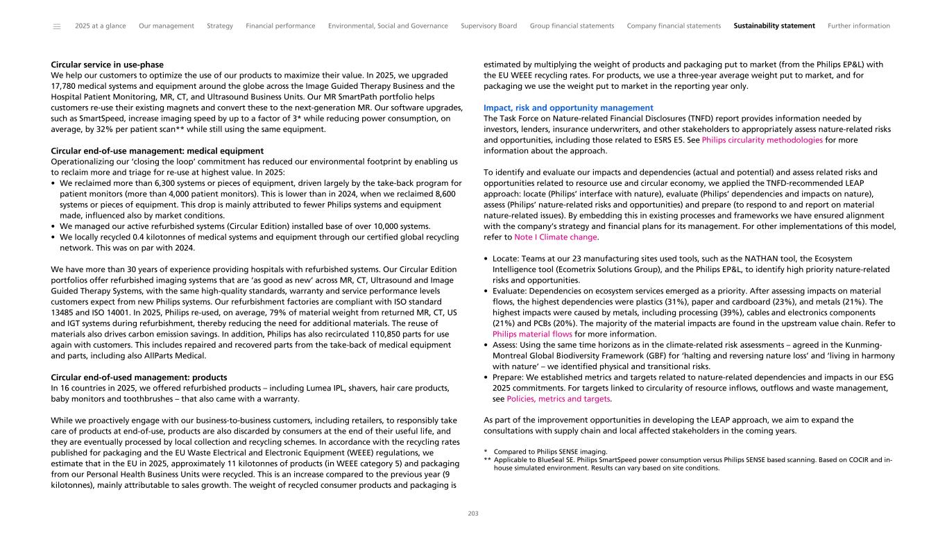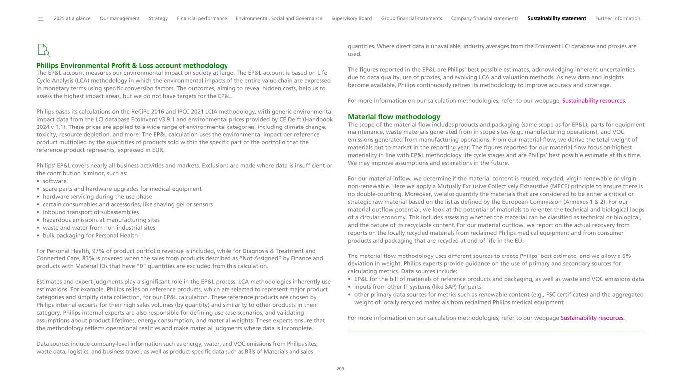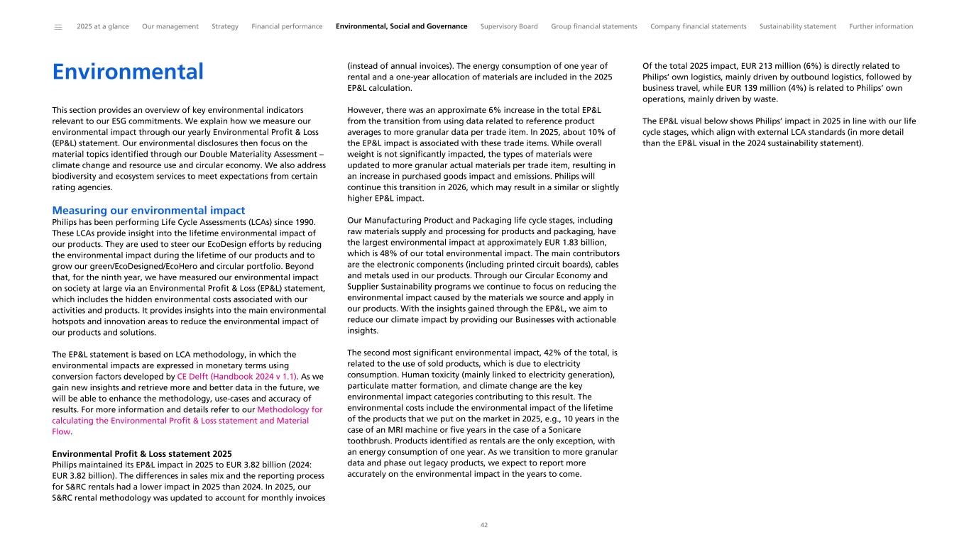 Environmental This section provides an overview of key environmental indicators relevant to our ESG commitments. We explain how we measure our environmental impact through our yearly Environmental Profit & Loss (EP&L) statement. Our environmental disclosures then focus on the material topics identified through our Double Materiality Assessment – climate change and resource use and circular economy. We also address biodiversity and ecosystem services to meet expectations from certain rating agencies. Measuring our environmental impact Philips has been performing Life Cycle Assessments (LCAs) since 1990. These LCAs provide insight into the lifetime environmental impact of our products. They are used to steer our EcoDesign efforts by reducing the environmental impact during the lifetime of our products and to grow our green/EcoDesigned/EcoHero and circular portfolio. Beyond that, for the ninth year, we have measured our environmental impact on society at large via an Environmental Profit & Loss (EP&L) statement, which includes the hidden environmental costs associated with our activities and products. It provides insights into the main environmental hotspots and innovation areas to reduce the environmental impact of our products and solutions. The EP&L statement is based on LCA methodology, in which the environmental impacts are expressed in monetary terms using conversion factors developed by CE Delft (Handbook 2024 v 1.1). As we gain new insights and retrieve more and better data in the future, we will be able to enhance the methodology, use-cases and accuracy of results. For more information and details refer to our Methodology for calculating the Environmental Profit & Loss statement and Material Flow. Environmental Profit & Loss statement 2025 Philips maintained its EP&L impact in 2025 to EUR 3.82 billion (2024: EUR 3.82 billion). The differences in sales mix and the reporting process for S&RC rentals had a lower impact in 2025 than 2024. In 2025, our S&RC rental methodology was updated to account for monthly invoices (instead of annual invoices). The energy consumption of one year of rental and a one-year allocation of materials are included in the 2025 EP&L calculation. However, there was an approximate 6% increase in the total EP&L from the transition from using data related to reference product averages to more granular data per trade item. In 2025, about 10% of the EP&L impact is associated with these trade items. While overall weight is not significantly impacted, the types of materials were updated to more granular actual materials per trade item, resulting in an increase in purchased goods impact and emissions. Philips will continue this transition in 2026, which may result in a similar or slightly higher EP&L impact. Our Manufacturing Product and Packaging life cycle stages, including raw materials supply and processing for products and packaging, have the largest environmental impact at approximately EUR 1.83 billion, which is 48% of our total environmental impact. The main contributors are the electronic components (including printed circuit boards), cables and metals used in our products. Through our Circular Economy and Supplier Sustainability programs we continue to focus on reducing the environmental impact caused by the materials we source and apply in our products. With the insights gained through the EP&L, we aim to reduce our climate impact by providing our Businesses with actionable insights. The second most significant environmental impact, 42% of the total, is related to the use of sold products, which is due to electricity consumption. Human toxicity (mainly linked to electricity generation), particulate matter formation, and climate change are the key environmental impact categories contributing to this result. The environmental costs include the environmental impact of the lifetime of the products that we put on the market in 2025, e.g., 10 years in the case of an MRI machine or five years in the case of a Sonicare toothbrush. Products identified as rentals are the only exception, with an energy consumption of one year. As we transition to more granular data and phase out legacy products, we expect to report more accurately on the environmental impact in the years to come. Of the total 2025 impact, EUR 213 million (6%) is directly related to Philips’ own logistics, mainly driven by outbound logistics, followed by business travel, while EUR 139 million (4%) is related to Philips’ own operations, mainly driven by waste. The EP&L visual below shows Philips’ impact in 2025 in line with our life cycle stages, which align with external LCA standards (in more detail than the EP&L visual in the 2024 sustainability statement). ______ 2025 at a glance Our management Strategy Financial performance Environmental, Social and Governance Supervisory Board Group financial statements Company financial statements Sustainability statement Further information 42