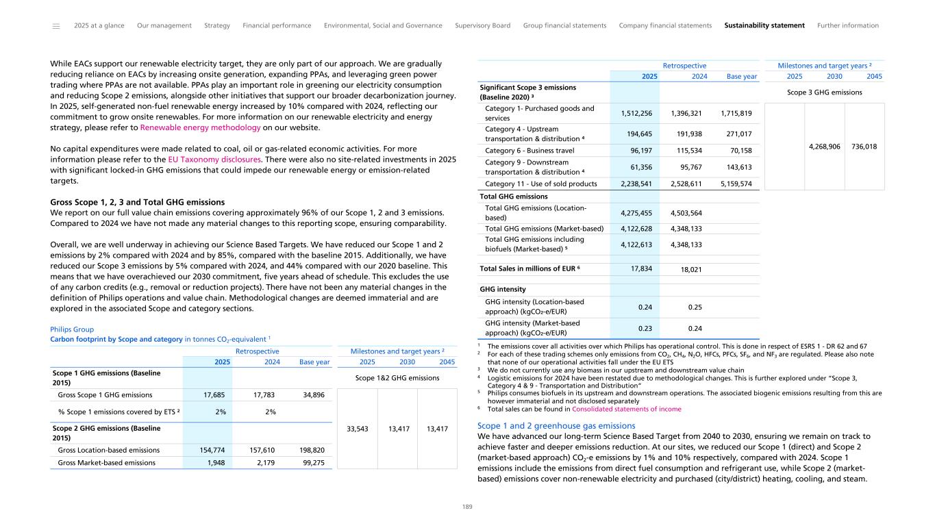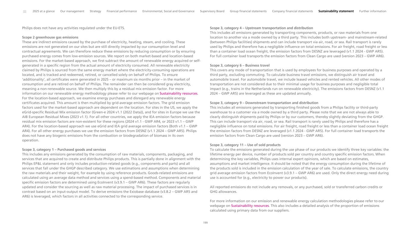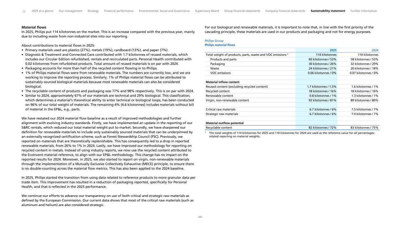 Environmental This section provides an overview of key environmental indicators relevant to our ESG commitments. We explain how we measure our environmental impact through our yearly Environmental Profit & Loss (EP&L) statement. Our environmental disclosures then focus on the material topics identified through our Double Materiality Assessment – climate change and resource use and circular economy. We also address biodiversity and ecosystem services to meet expectations from certain rating agencies. Measuring our environmental impact Philips has been performing Life Cycle Assessments (LCAs) since 1990. These LCAs provide insight into the lifetime environmental impact of our products. They are used to steer our EcoDesign efforts by reducing the environmental impact during the lifetime of our products and to grow our green/EcoDesigned/EcoHero and circular portfolio. Beyond that, for the ninth year, we have measured our environmental impact on society at large via an Environmental Profit & Loss (EP&L) statement, which includes the hidden environmental costs associated with our activities and products. It provides insights into the main environmental hotspots and innovation areas to reduce the environmental impact of our products and solutions. The EP&L statement is based on LCA methodology, in which the environmental impacts are expressed in monetary terms using conversion factors developed by CE Delft (Handbook 2024 v 1.1). As we gain new insights and retrieve more and better data in the future, we will be able to enhance the methodology, use-cases and accuracy of results. For more information and details refer to our Methodology for calculating the Environmental Profit & Loss statement and Material Flow. Environmental Profit & Loss statement 2025 Philips maintained its EP&L impact in 2025 to EUR 3.82 billion (2024: EUR 3.82 billion). The differences in sales mix and the reporting process for S&RC rentals had a lower impact in 2025 than 2024. In 2025, our S&RC rental methodology was updated to account for monthly invoices (instead of annual invoices). The energy consumption of one year of rental and a one-year allocation of materials are included in the 2025 EP&L calculation. However, there was an approximate 6% increase in the total EP&L from the transition from using data related to reference product averages to more granular data per trade item. In 2025, about 10% of the EP&L impact is associated with these trade items. While overall weight is not significantly impacted, the types of materials were updated to more granular actual materials per trade item, resulting in an increase in purchased goods impact and emissions. Philips will continue this transition in 2026, which may result in a similar or slightly higher EP&L impact. Our Manufacturing Product and Packaging life cycle stages, including raw materials supply and processing for products and packaging, have the largest environmental impact at approximately EUR 1.83 billion, which is 48% of our total environmental impact. The main contributors are the electronic components (including printed circuit boards), cables and metals used in our products. Through our Circular Economy and Supplier Sustainability programs we continue to focus on reducing the environmental impact caused by the materials we source and apply in our products. With the insights gained through the EP&L, we aim to reduce our climate impact by providing our Businesses with actionable insights. The second most significant environmental impact, 42% of the total, is related to the use of sold products, which is due to electricity consumption. Human toxicity (mainly linked to electricity generation), particulate matter formation, and climate change are the key environmental impact categories contributing to this result. The environmental costs include the environmental impact of the lifetime of the products that we put on the market in 2025, e.g., 10 years in the case of an MRI machine or five years in the case of a Sonicare toothbrush. Products identified as rentals are the only exception, with an energy consumption of one year. As we transition to more granular data and phase out legacy products, we expect to report more accurately on the environmental impact in the years to come. Of the total 2025 impact, EUR 213 million (6%) is directly related to Philips’ own logistics, mainly driven by outbound logistics, followed by business travel, while EUR 139 million (4%) is related to Philips’ own operations, mainly driven by waste. The EP&L visual below shows Philips’ impact in 2025 in line with our life cycle stages, which align with external LCA standards (in more detail than the EP&L visual in the 2024 sustainability statement). ______ 2025 at a glance Our management Strategy Financial performance Environmental, Social and Governance Supervisory Board Group financial statements Company financial statements Sustainability statement Further information 42