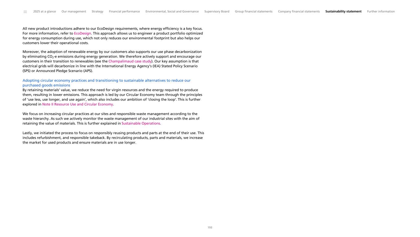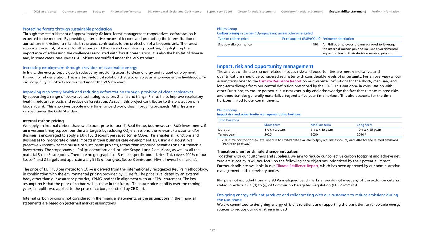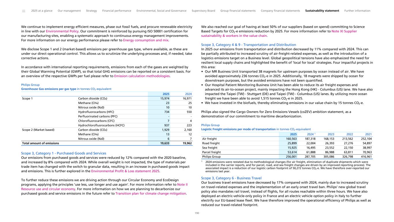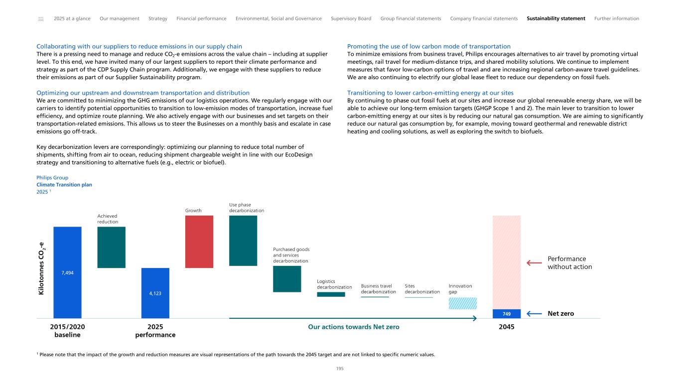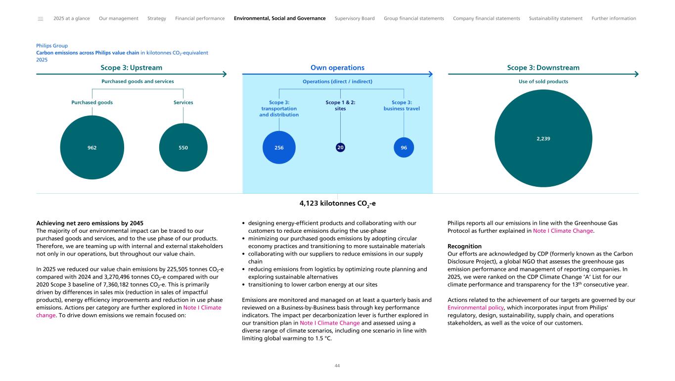 Philips Group Carbon emissions across Philips value chain in kilotonnes CO2-equivalent 2025 Achieving net zero emissions by 2045 The majority of our environmental impact can be traced to our purchased goods and services, and to the use phase of our products. Therefore, we are teaming up with internal and external stakeholders not only in our operations, but throughout our value chain. In 2025 we reduced our value chain emissions by 225,505 tonnes CO2-e compared with 2024 and 3,270,496 tonnes CO2-e compared with our 2020 Scope 3 baseline of 7,360,182 tonnes CO2-e. This is primarily driven by differences in sales mix (reduction in sales of impactful products), energy efficiency improvements and reduction in use phase emissions. Actions per category are further explored in Note I Climate change. To drive down emissions we remain focused on: • designing energy-efficient products and collaborating with our customers to reduce emissions during the use-phase • minimizing our purchased goods emissions by adopting circular economy practices and transitioning to more sustainable materials • collaborating with our suppliers to reduce emissions in our supply chain • reducing emissions from logistics by optimizing route planning and exploring sustainable alternatives • transitioning to lower carbon energy at our sites Emissions are monitored and managed on at least a quarterly basis and reviewed on a Business-by-Business basis through key performance indicators. The impact per decarbonization lever is further explored in our transition plan in Note I Climate Change and assessed using a diverse range of climate scenarios, including one scenario in line with limiting global warming to 1.5 °C. Philips reports all our emissions in line with the Greenhouse Gas Protocol as further explained in Note I Climate Change. Recognition Our efforts are acknowledged by CDP (formerly known as the Carbon Disclosure Project), a global NGO that assesses the greenhouse gas emission performance and management of reporting companies. In 2025, we were ranked on the CDP Climate Change ’A’ List for our climate performance and transparency for the 13th consecutive year. Actions related to the achievement of our targets are governed by our Environmental policy, which incorporates input from Philips' regulatory, design, sustainability, supply chain, and operations stakeholders, as well as the voice of our customers. ______ 2025 at a glance Our management Strategy Financial performance Environmental, Social and Governance Supervisory Board Group financial statements Company financial statements Sustainability statement Further information 44