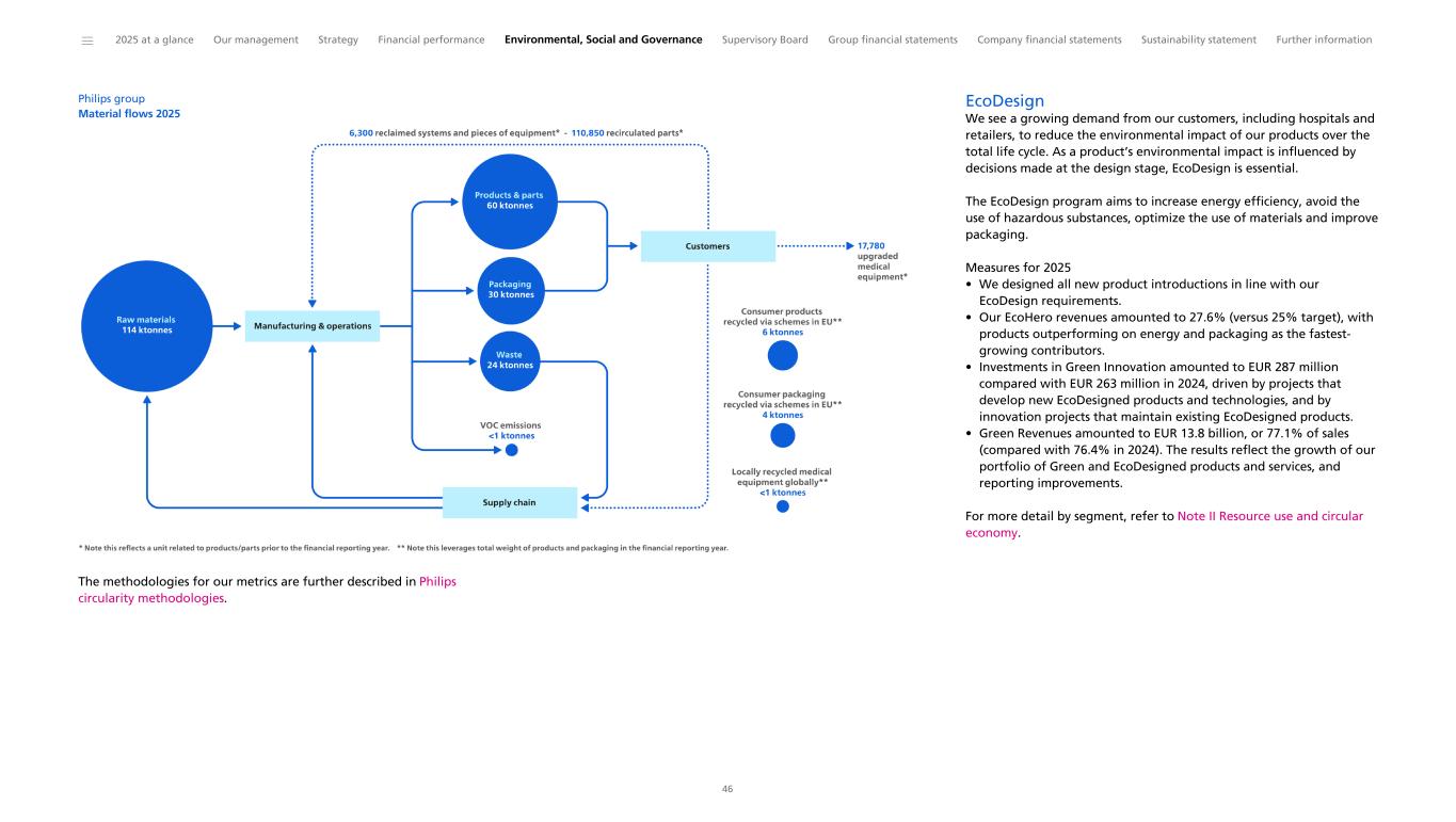 Philips group Material flows 2025 The methodologies for our metrics are further described in Philips circularity methodologies. EcoDesign We see a growing demand from our customers, including hospitals and retailers, to reduce the environmental impact of our products over the total life cycle. As a product’s environmental impact is influenced by decisions made at the design stage, EcoDesign is essential. The EcoDesign program aims to increase energy efficiency, avoid the use of hazardous substances, optimize the use of materials and improve packaging. Measures for 2025 • We designed all new product introductions in line with our EcoDesign requirements. • Our EcoHero revenues amounted to 27.6% (versus 25% target), with products outperforming on energy and packaging as the fastest- growing contributors. • Investments in Green Innovation amounted to EUR 287 million compared with EUR 263 million in 2024, driven by projects that develop new EcoDesigned products and technologies, and by innovation projects that maintain existing EcoDesigned products. • Green Revenues amounted to EUR 13.8 billion, or 77.1% of sales (compared with 76.4% in 2024). The results reflect the growth of our portfolio of Green and EcoDesigned products and services, and reporting improvements. For more detail by segment, refer to Note II Resource use and circular economy. ______ 2025 at a glance Our management Strategy Financial performance Environmental, Social and Governance Supervisory Board Group financial statements Company financial statements Sustainability statement Further information 46