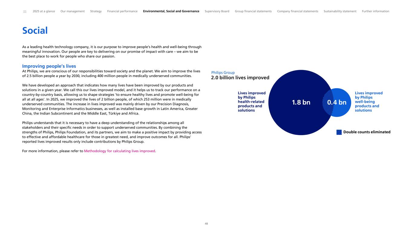 Social As a leading health technology company, it is our purpose to improve people’s health and well-being through meaningful innovation. Our people are key to delivering on our promise of impact with care – we aim to be the best place to work for people who share our passion. Improving people’s lives At Philips, we are conscious of our responsibilities toward society and the planet. We aim to improve the lives of 2.5 billion people a year by 2030, including 400 million people in medically underserved communities. We have developed an approach that indicates how many lives have been improved by our products and solutions in a given year. We call this our lives improved model, and it helps us to track our performance on a country-by-country basis, allowing us to shape strategies 'to ensure healthy lives and promote well-being for all at all ages'. In 2025, we improved the lives of 2 billion people, of which 253 million were in medically underserved communities. The increase in lives improved was mainly driven by our Precision Diagnosis, Monitoring and Enterprise Informatics businesses, as well as installed base growth in Latin America, Greater China, the Indian Subcontinent and the Middle East, Türkiye and Africa. Philips understands that it is necessary to have a deep understanding of the relationships among all stakeholders and their specific needs in order to support underserved communities. By combining the strengths of Philips, Philips Foundation, and its partners, we aim to make a positive impact by providing access to effective and affordable healthcare for those in greatest need, and improve outcomes for all. Philips' reported lives improved results only include contributions by Philips Group. For more information, please refer to Methodology for calculating lives improved. ______ 2025 at a glance Our management Strategy Financial performance Environmental, Social and Governance Supervisory Board Group financial statements Company financial statements Sustainability statement Further information 48
