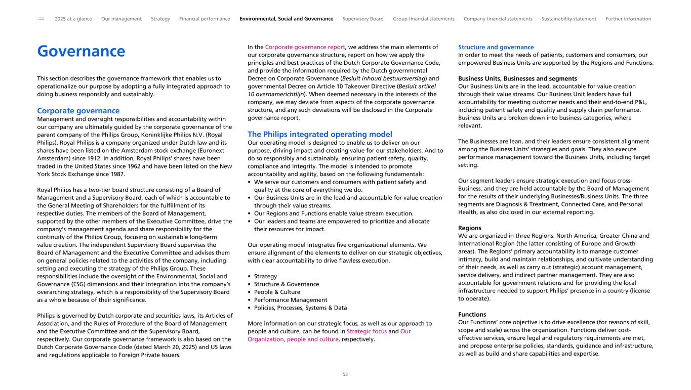 Governance This section describes the governance framework that enables us to operationalize our purpose by adopting a fully integrated approach to doing business responsibly and sustainably. Corporate governance Management and oversight responsibilities and accountability within our company are ultimately guided by the corporate governance of the parent company of the Philips Group, Koninklijke Philips N.V. (Royal Philips). Royal Philips is a company organized under Dutch law and its shares have been listed on the Amsterdam stock exchange (Euronext Amsterdam) since 1912. In addition, Royal Philips’ shares have been traded in the United States since 1962 and have been listed on the New York Stock Exchange since 1987. Royal Philips has a two-tier board structure consisting of a Board of Management and a Supervisory Board, each of which is accountable to the General Meeting of Shareholders for the fulfillment of its respective duties. The members of the Board of Management, supported by the other members of the Executive Committee, drive the company’s management agenda and share responsibility for the continuity of the Philips Group, focusing on sustainable long-term value creation. The independent Supervisory Board supervises the Board of Management and the Executive Committee and advises them on general policies related to the activities of the company, including setting and executing the strategy of the Philips Group. These responsibilities include the oversight of the Environmental, Social and Governance (ESG) dimensions and their integration into the company’s overarching strategy, which is a responsibility of the Supervisory Board as a whole because of their significance. Philips is governed by Dutch corporate and securities laws, its Articles of Association, and the Rules of Procedure of the Board of Management and the Executive Committee and of the Supervisory Board, respectively. Our corporate governance framework is also based on the Dutch Corporate Governance Code (dated March 20, 2025) and US laws and regulations applicable to Foreign Private Issuers. In the Corporate governance report, we address the main elements of our corporate governance structure, report on how we apply the principles and best practices of the Dutch Corporate Governance Code, and provide the information required by the Dutch governmental Decree on Corporate Governance (Besluit inhoud bestuursverslag) and governmental Decree on Article 10 Takeover Directive (Besluit artikel 10 overnamerichtlijn). When deemed necessary in the interests of the company, we may deviate from aspects of the corporate governance structure, and any such deviations will be disclosed in the Corporate governance report. The Philips integrated operating model Our operating model is designed to enable us to deliver on our purpose, driving impact and creating value for our stakeholders. And to do so responsibly and sustainably, ensuring patient safety, quality, compliance and integrity. The model is intended to promote accountability and agility, based on the following fundamentals: • We serve our customers and consumers with patient safety and quality at the core of everything we do. • Our Business Units are in the lead and accountable for value creation through their value streams. • Our Regions and Functions enable value stream execution. • Our leaders and teams are empowered to prioritize and allocate their resources for impact. Our operating model integrates five organizational elements. We ensure alignment of the elements to deliver on our strategic objectives, with clear accountability to drive flawless execution. • Strategy • Structure & Governance • People & Culture • Performance Management • Policies, Processes, Systems & Data More information on our strategic focus, as well as our approach to people and culture, can be found in Strategic focus and Our Organization, people and culture, respectively. Structure and governance In order to meet the needs of patients, customers and consumers, our empowered Business Units are supported by the Regions and Functions. Business Units, Businesses and segments Our Business Units are in the lead, accountable for value creation through their value streams. Our Business Unit leaders have full accountability for meeting customer needs and their end-to-end P&L, including patient safety and quality and supply chain performance. Business Units are broken down into business categories, where relevant. The Businesses are lean, and their leaders ensure consistent alignment among the Business Units’ strategies and goals. They also execute performance management toward the Business Units, including target setting. Our segment leaders ensure strategic execution and focus cross- Business, and they are held accountable by the Board of Management for the results of their underlying Businesses/Business Units. The three segments are Diagnosis & Treatment, Connected Care, and Personal Health, as also disclosed in our external reporting. Regions We are organized in three Regions: North America, Greater China and International Region (the latter consisting of Europe and Growth areas). The Regions’ primary accountability is to manage customer intimacy, build and maintain relationships, and cultivate understanding of their needs, as well as carry out (strategic) account management, service delivery, and indirect partner management. They are also accountable for government relations and for providing the local infrastructure needed to support Philips’ presence in a country (license to operate). Functions Our Functions’ core objective is to drive excellence (for reasons of skill, scope and scale) across the organization. Functions deliver cost- effective services, ensure legal and regulatory requirements are met, and propose enterprise policies, standards, guidance and infrastructure, as well as build and share capabilities and expertise. ______ 2025 at a glance Our management Stra