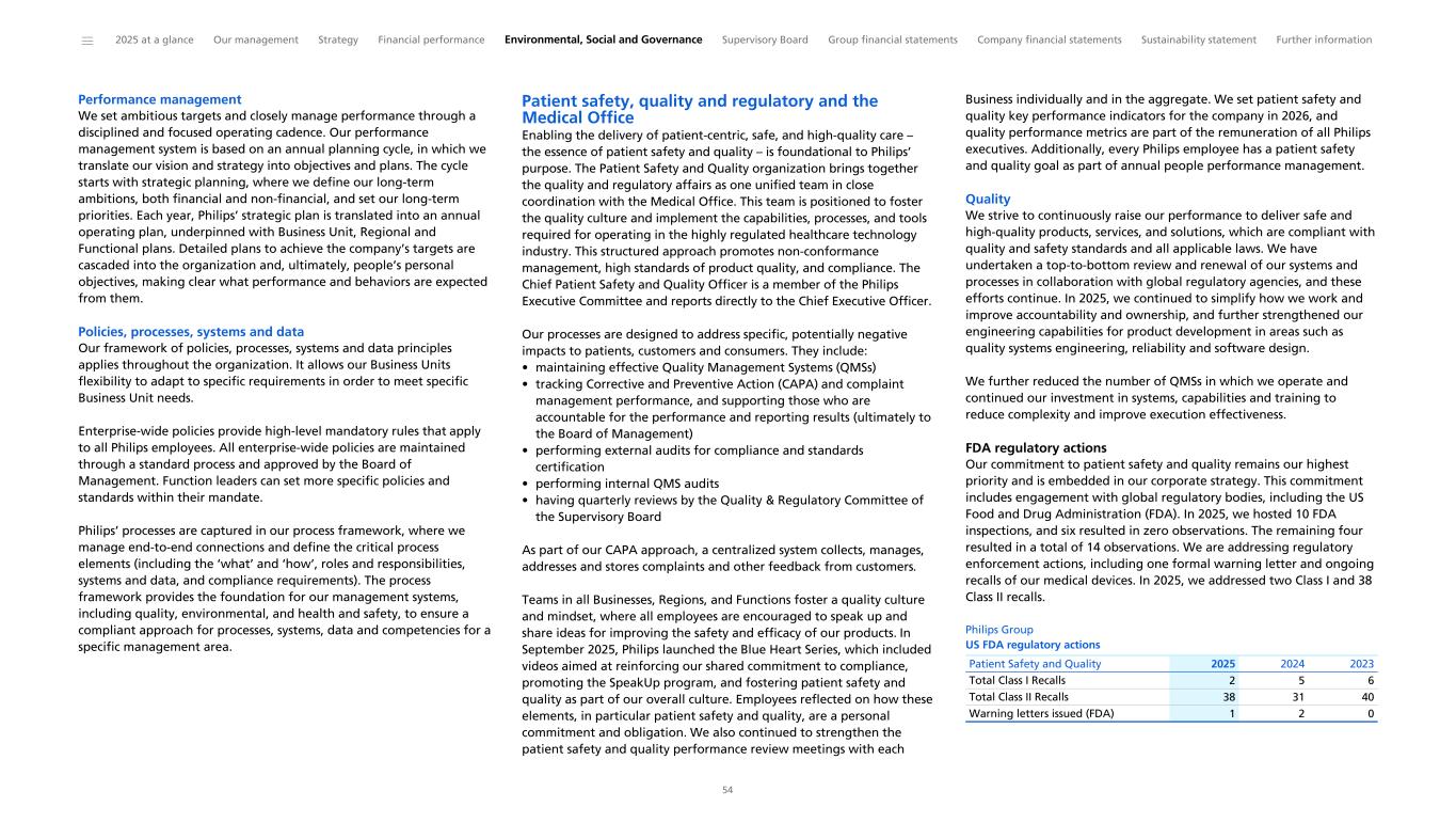 Performance management We set ambitious targets and closely manage performance through a disciplined and focused operating cadence. Our performance management system is based on an annual planning cycle, in which we translate our vision and strategy into objectives and plans. The cycle starts with strategic planning, where we define our long-term ambitions, both financial and non-financial, and set our long-term priorities. Each year, Philips’ strategic plan is translated into an annual operating plan, underpinned with Business Unit, Regional and Functional plans. Detailed plans to achieve the company’s targets are cascaded into the organization and, ultimately, people’s personal objectives, making clear what performance and behaviors are expected from them. Policies, processes, systems and data Our framework of policies, processes, systems and data principles applies throughout the organization. It allows our Business Units flexibility to adapt to specific requirements in order to meet specific Business Unit needs. Enterprise-wide policies provide high-level mandatory rules that apply to all Philips employees. All enterprise-wide policies are maintained through a standard process and approved by the Board of Management. Function leaders can set more specific policies and standards within their mandate. Philips’ processes are captured in our process framework, where we manage end-to-end connections and define the critical process elements (including the ‘what’ and ‘how’, roles and responsibilities, systems and data, and compliance requirements). The process framework provides the foundation for our management systems, including quality, environmental, and health and safety, to ensure a compliant approach for processes, systems, data and competencies for a specific management area. Patient safety, quality and regulatory and the Medical Office Enabling the delivery of patient-centric, safe, and high-quality care – the essence of patient safety and quality – is foundational to Philips’ purpose. The Patient Safety and Quality organization brings together the quality and regulatory affairs as one unified team in close coordination with the Medical Office. This team is positioned to foster the quality culture and implement the capabilities, processes, and tools required for operating in the highly regulated healthcare technology industry. This structured approach promotes non-conformance management, high standards of product quality, and compliance. The Chief Patient Safety and Quality Officer is a member of the Philips Executive Committee and reports directly to the Chief Executive Officer. Our processes are designed to address specific, potentially negative impacts to patients, customers and consumers. They include: • maintaining effective Quality Management Systems (QMSs) • tracking Corrective and Preventive Action (CAPA) and complaint management performance, and supporting those who are accountable for the performance and reporting results (ultimately to the Board of Management) • performing external audits for compliance and standards certification • performing internal QMS audits • having quarterly reviews by the Quality & Regulatory Committee of the Supervisory Board As part of our CAPA approach, a centralized system collects, manages, addresses and stores complaints and other feedback from customers. Teams in all Businesses, Regions, and Functions foster a quality culture and mindset, where all employees are encouraged to speak up and share ideas for improving the safety and efficacy of our products. In September 2025, Philips launched the Blue Heart Series, which included videos aimed at reinforcing our shared commitment to compliance, promoting the SpeakUp program, and fostering patient safety and quality as part of our overall culture. Employees reflected on how these elements, in particular patient safety and quality, are a personal commitment and obligation. We also continued to strengthen the patient safety and quality performance review meetings with each Business individually and in the aggregate. We set patient safety and quality key performance indicators for the company in 2026, and quality performance metrics are part of the remuneration of all Philips executives. Additionally, every Philips employee has a patient safety and quality goal as part of annual people performance management. Quality We strive to continuously raise our performance to deliver safe and high-quality products, services, and solutions, which are compliant with quality and safety standards and all applicable laws. We have undertaken a top-to-bottom review and renewal of our systems and processes in collaboration with global regulatory agencies, and these efforts continue. In 2025, we continued to simplify how we work and improve accountability and ownership, and further strengthened our engineering capabilities for product development in areas such as quality systems engineering, reliability and software design. We further reduced the number of QMSs in which we operate and continued our investment in systems, capabilities and training to reduce complexity and improve execution effectiveness. FDA regulatory actions Our commitment to patient safety and quality remains our highest priority and is embedded in our corporate strategy. This commitment includes engagement with global regulatory bodies, including the US Food and Drug Administration (FDA). In 2025, we hosted 10 FDA inspections, and six resulted in zero observations. The remaining four resulted in a total of 14 observations. We are addressing regulatory enforcement actions, including one formal warning letter and ongoing recalls of our medical devices. In 2025, we addressed two Class I and 38 Class II recalls. Philips Group US FDA regulatory actions Patient Safety and Quality 2025 2024 2023 Total Class I Recalls 2 5 6 Total Class II Recalls 38 31 40 Warning letters issued (FDA) 1 2 0 ______ 2025 at a glance Our mana