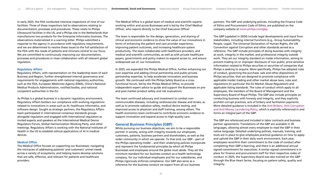 In early 2025, the FDA conducted intensive inspections of nine of our facilities. Three of these inspections led to observations relating to documentation, processes and procedures. These relate to Philips Ultrasound facilities in the US, and a Philips site in the Netherlands that manufactures two products for the Enterprise Informatics business. The observations materialized in a warning letter. Philips submitted a response to the agency in accordance with regulatory requirements, and we are determined to resolve these issues to the full satisfaction of the FDA with the needs of patients and clinicians central to our focus. We are committed to continuously improving our documentation, processes and procedures in close collaboration with all relevant global regulators. Regulatory Affairs Regulatory Affairs, with representation on the leadership team of each Business and Region, further strengthened internal governance and requirements for engagements with national regulatory authorities, such as the FDA, European Medicines Agency (EMA), China's National Medical Products Administration, notified bodies, and national competent authorities in the EU. As Philips is a global business in a dynamic regulatory environment, Regulatory Affairs bolsters our compliance with evolving regulations related to innovations in areas such as AI, healthcare informatics, and software design. Sought as strategic partners, the Regulatory Affairs team participated in international consensus standards groups alongside regulators and engaged with international regulators as invited experts and speakers at the International Medical Device Regulators Forum, Global Harmonization Working Party, and other meetings. Regulatory Affairs is working with the National Institutes of Health in the US to establish ethical applications of AI in medical devices. Medical Office The Medical Office focuses on supporting our Businesses; navigating the intricacies of addressing patients’ and customers’ unmet needs across a variety of ecosystems; and helping teams develop solutions that are safe, effective, and relevant for patients and healthcare providers. The Medical Office is a global team of medical and scientific experts working within and across Businesses and is led by the Chief Medical Officer, who reports directly to the Chief Executive Officer. The team is responsible for the design, generation, and sharing of clinical and economic evidence to show the value of our innovations in terms of enhancing the patient and care provider experience, improving patient outcomes, and increasing healthcare system productivity. The team collaborates with healthcare providers, and medical and scientific communities, as well as with private healthcare payers, governments and policy makers to expand access to, and ensure widespread use of, our innovations. In 2025, we expanded the Philips Medical Office, further enhancing our own expertise and adding clinical partnership and public-private partnership expertise, to help accelerate innovation and business growth. We continued with the Philips Safety Board as a cross- functional forum, led by the Philips Medical Office, to provide independent expert advice to guide and support the Businesses on pre- and post-market product safety and risk evaluations. The team continued advocacy and investment to combat non- communicable diseases, including cardiovascular disease and stroke, as well as to promote radiation safety, medical device testing, and improved access to physician and staff training, among others. The health economics team continued to contribute economic evidence to support innovation and expand access to high-quality care. General Business Principles (GBP) While pursuing our business objectives, we aim to be a responsible partner in society, acting with integrity towards our employees, customers, patients, business partners and shareholders, as well as the wider community in which we operate. To that end, our GBP – part of the Philips operating model – and their underlying policies incorporate and represent the fundamental principles by which all Philips Businesses and employees around the globe must abide. They set the minimum standard for our business conduct as a health technology company, for our individual employees and for our subsidiaries, and Philips rigorously enforces compliance. Our GBP also serve as a reference for the business conduct we expect from all our business partners. The GBP and underlying policies, including the Finance Code of Ethics and Procurement Code of Ethics, are published on the company website at www.philips.com/gbp. The GBP (updated in 2024) include legal developments and input from stakeholders, including internal Functions (e.g., Group Sustainability, People, Legal). The Universal Declaration of Human Rights, the UN Convention against Corruption and other standards served as a reference. The GBP include principles of doing business with integrity at work, integrity in the market, and professional integrity outside work. They set our integrity standard on inside information, aiming to prevent trading on or improper disclosure of non-public, price-sensitive information related to Philips securities or securities of companies that Philips is seeking to acquire. More specifically, Philips has adopted rules of conduct, governing the purchase, sale and other dispositions of Philips securities, that are designed to promote compliance with applicable insider trading and other market abuse laws, rules and regulations (in particular the EU Market Abuse Regulation) and applicable listing standards. The rules of conduct which apply to all employees, the members of the Board of Management and the Supervisory Board of Royal Philips. The GBP also include principles on conducting business with honesty and integrity, and they explicitly prohibit corrupt practices, acts of bribery and facilitation payments. More detailed guidance is included in the Anti-Bribery,
