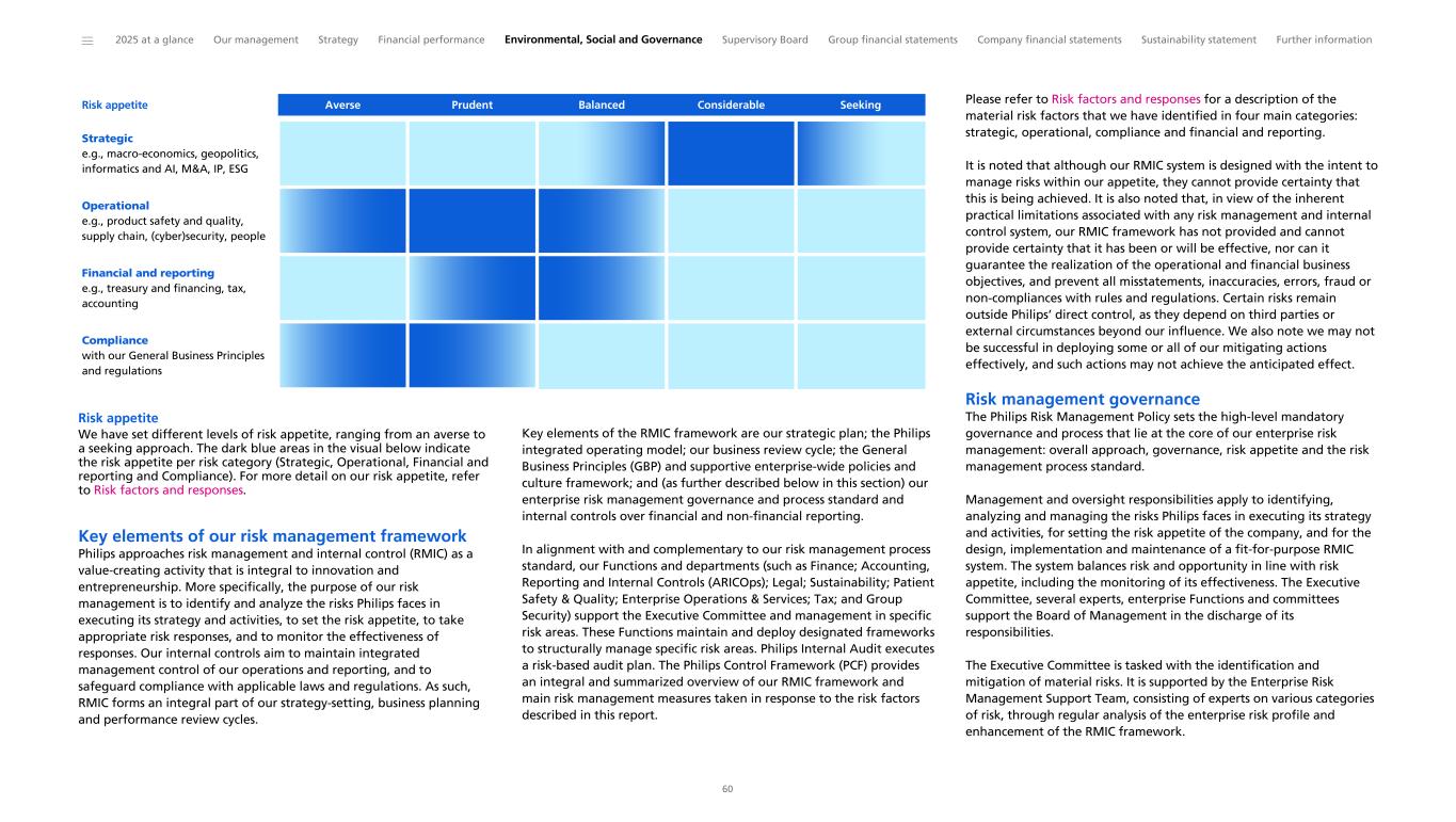 Risk appetite Averse Prudent Balanced Considerable Seeking Strategic e.g., macro-economics, geopolitics, informatics and AI, M&A, IP, ESG Operational e.g., product safety and quality, supply chain, (cyber)security, people Financial and reporting e.g., treasury and financing, tax, accounting Compliance with our General Business Principles and regulations Risk appetite We have set different levels of risk appetite, ranging from an averse to a seeking approach. The dark blue areas in the visual below indicate the risk appetite per risk category (Strategic, Operational, Financial and reporting and Compliance). For more detail on our risk appetite, refer to Risk factors and responses. Key elements of our risk management framework Philips approaches risk management and internal control (RMIC) as a value-creating activity that is integral to innovation and entrepreneurship. More specifically, the purpose of our risk management is to identify and analyze the risks Philips faces in executing its strategy and activities, to set the risk appetite, to take appropriate risk responses, and to monitor the effectiveness of responses. Our internal controls aim to maintain integrated management control of our operations and reporting, and to safeguard compliance with applicable laws and regulations. As such, RMIC forms an integral part of our strategy-setting, business planning and performance review cycles. Key elements of the RMIC framework are our strategic plan; the Philips integrated operating model; our business review cycle; the General Business Principles (GBP) and supportive enterprise-wide policies and culture framework; and (as further described below in this section) our enterprise risk management governance and process standard and internal controls over financial and non-financial reporting. In alignment with and complementary to our risk management process standard, our Functions and departments (such as Finance; Accounting, Reporting and Internal Controls (ARICOps); Legal; Sustainability; Patient Safety & Quality; Enterprise Operations & Services; Tax; and Group Security) support the Executive Committee and management in specific risk areas. These Functions maintain and deploy designated frameworks to structurally manage specific risk areas. Philips Internal Audit executes a risk-based audit plan. The Philips Control Framework (PCF) provides an integral and summarized overview of our RMIC framework and main risk management measures taken in response to the risk factors described in this report. Please refer to Risk factors and responses for a description of the material risk factors that we have identified in four main categories: strategic, operational, compliance and financial and reporting. It is noted that although our RMIC system is designed with the intent to manage risks within our appetite, they cannot provide certainty that this is being achieved. It is also noted that, in view of the inherent practical limitations associated with any risk management and internal control system, our RMIC framework has not provided and cannot provide certainty that it has been or will be effective, nor can it guarantee the realization of the operational and financial business objectives, and prevent all misstatements, inaccuracies, errors, fraud or non-compliances with rules and regulations. Certain risks remain outside Philips’ direct control, as they depend on third parties or external circumstances beyond our influence. We also note we may not be successful in deploying some or all of our mitigating actions effectively, and such actions may not achieve the anticipated effect. Risk management governance The Philips Risk Management Policy sets the high-level mandatory governance and process that lie at the core of our enterprise risk management: overall approach, governance, risk appetite and the risk management process standard. Management and oversight responsibilities apply to identifying, analyzing and managing the risks Philips faces in executing its strategy and activities, for setting the risk appetite of the company, and for the design, implementation and maintenance of a fit-for-purpose RMIC system. The system balances risk and opportunity in line with risk appetite, including the monitoring of its effectiveness. The Executive Committee, several experts, enterprise Functions and committees support the Board of Management in the discharge of its responsibilities. The Executive Committee is tasked with the identification and mitigation of material risks. It is supported by the Enterprise Risk Management Support Team, consisting of experts on various categories of risk, through regular analysis of the enterprise risk profile and enhancement of the RMIC framework. ______ 2025 at a glance Our management Strategy Financial performance Environmental, Social and Governance Supervisory Board Group financial statements Company financial statements Sustainability statement Further information 60