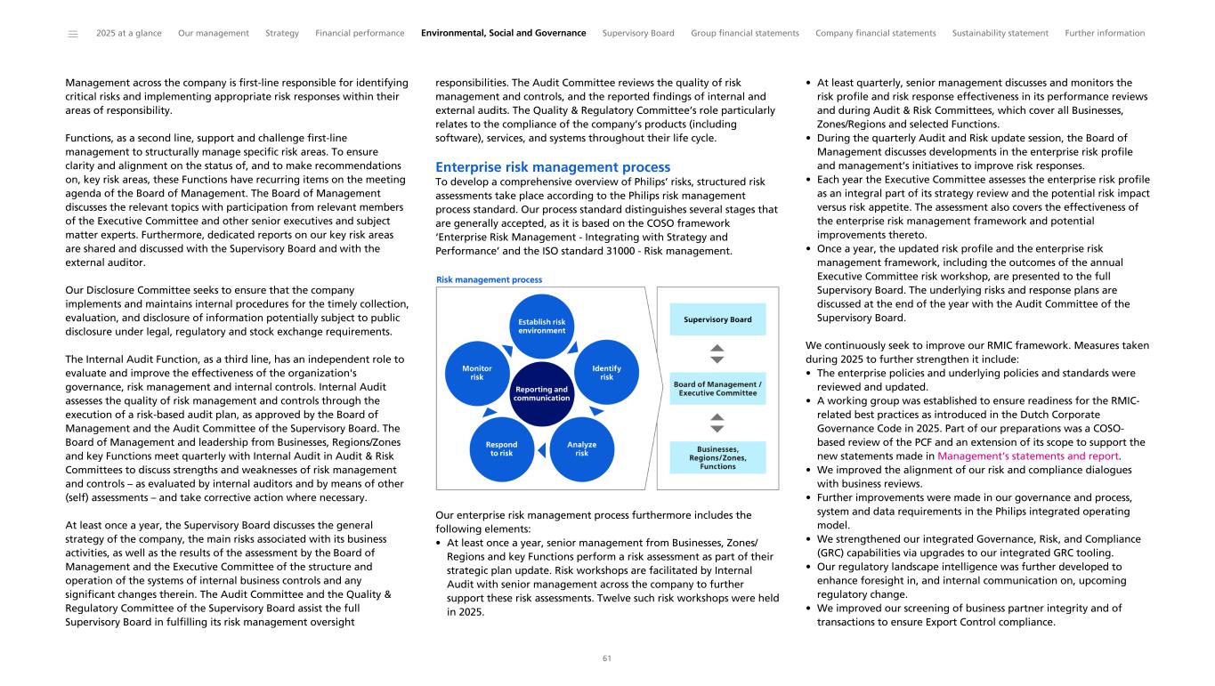 Management across the company is first-line responsible for identifying critical risks and implementing appropriate risk responses within their areas of responsibility. Functions, as a second line, support and challenge first-line management to structurally manage specific risk areas. To ensure clarity and alignment on the status of, and to make recommendations on, key risk areas, these Functions have recurring items on the meeting agenda of the Board of Management. The Board of Management discusses the relevant topics with participation from relevant members of the Executive Committee and other senior executives and subject matter experts. Furthermore, dedicated reports on our key risk areas are shared and discussed with the Supervisory Board and with the external auditor. Our Disclosure Committee seeks to ensure that the company implements and maintains internal procedures for the timely collection, evaluation, and disclosure of information potentially subject to public disclosure under legal, regulatory and stock exchange requirements. The Internal Audit Function, as a third line, has an independent role to evaluate and improve the effectiveness of the organization's governance, risk management and internal controls. Internal Audit assesses the quality of risk management and controls through the execution of a risk-based audit plan, as approved by the Board of Management and the Audit Committee of the Supervisory Board. The Board of Management and leadership from Businesses, Regions/Zones and key Functions meet quarterly with Internal Audit in Audit & Risk Committees to discuss strengths and weaknesses of risk management and controls – as evaluated by internal auditors and by means of other (self) assessments – and take corrective action where necessary. At least once a year, the Supervisory Board discusses the general strategy of the company, the main risks associated with its business activities, as well as the results of the assessment by the Board of Management and the Executive Committee of the structure and operation of the systems of internal business controls and any significant changes therein. The Audit Committee and the Quality & Regulatory Committee of the Supervisory Board assist the full Supervisory Board in fulfilling its risk management oversight responsibilities. The Audit Committee reviews the quality of risk management and controls, and the reported findings of internal and external audits. The Quality & Regulatory Committee’s role particularly relates to the compliance of the company’s products (including software), services, and systems throughout their life cycle. Enterprise risk management process To develop a comprehensive overview of Philips’ risks, structured risk assessments take place according to the Philips risk management process standard. Our process standard distinguishes several stages that are generally accepted, as it is based on the COSO framework ‘Enterprise Risk Management - Integrating with Strategy and Performance’ and the ISO standard 31000 - Risk management. Our enterprise risk management process furthermore includes the following elements: • At least once a year, senior management from Businesses, Zones/ Regions and key Functions perform a risk assessment as part of their strategic plan update. Risk workshops are facilitated by Internal Audit with senior management across the company to further support these risk assessments. Twelve such risk workshops were held in 2025. • At least quarterly, senior management discusses and monitors the risk profile and risk response effectiveness in its performance reviews and during Audit & Risk Committees, which cover all Businesses, Zones/Regions and selected Functions. • During the quarterly Audit and Risk update session, the Board of Management discusses developments in the enterprise risk profile and management’s initiatives to improve risk responses. • Each year the Executive Committee assesses the enterprise risk profile as an integral part of its strategy review and the potential risk impact versus risk appetite. The assessment also covers the effectiveness of the enterprise risk management framework and potential improvements thereto. • Once a year, the updated risk profile and the enterprise risk management framework, including the outcomes of the annual Executive Committee risk workshop, are presented to the full Supervisory Board. The underlying risks and response plans are discussed at the end of the year with the Audit Committee of the Supervisory Board. We continuously seek to improve our RMIC framework. Measures taken during 2025 to further strengthen it include: • The enterprise policies and underlying policies and standards were reviewed and updated. • A working group was established to ensure readiness for the RMIC- related best practices as introduced in the Dutch Corporate Governance Code in 2025. Part of our preparations was a COSO- based review of the PCF and an extension of its scope to support the new statements made in Management’s statements and report. • We improved the alignment of our risk and compliance dialogues with business reviews. • Further improvements were made in our governance and process, system and data requirements in the Philips integrated operating model. • We strengthened our integrated Governance, Risk, and Compliance (GRC) capabilities via upgrades to our integrated GRC tooling. • Our regulatory landscape intelligence was further developed to enhance foresight in, and internal communication on, upcoming regulatory change. • We improved our screening of business partner integrity and of transactions to ensure Export Control compliance. ______ 2025 at a glance Our management Strategy Financial performance Environmental, Social and Governance Supervisory Board Group financial statements Company financial statements Sustainability statement Further information 61