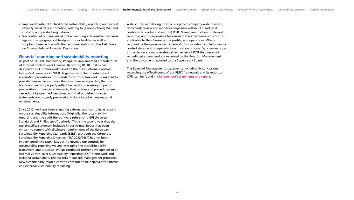 • Improved master data facilitated sustainability reporting and several other types of data automation, relating to (among others) VAT and customs, and product regulations. • We continued our analysis of global warming and weather scenarios against the geographical footprint of our facilities as well as suppliers’ base, in line with the recommendations of the Task Force on Climate-Related Financial Disclosures. Financial reporting and sustainability reporting As part of its RMIC framework, Philips has implemented a standard set of Internal Controls over Financial Reporting (ICFR). Philips has designed its ICFR framework based on the COSO Internal Control- Integrated Framework (2013). Together with Philips' established accounting procedures, this standard control framework is designed to provide reasonable assurance that assets are safeguarded, that the books and records properly reflect transactions necessary to permit preparation of financial statements, that policies and procedures are carried out by qualified personnel, and that published financial statements are properly prepared and do not contain any material misstatements. Since 2012, we have been engaging external auditors to issue reports on our sustainability information. Originally, the sustainability reporting and the audit thereof were referencing GRI Universal Standards and Philips-specific criteria. This is the second year that the sustainability statement included in our Annual Report has been written to comply with disclosure requirements of the European Sustainability Reporting Standards (ESRS), although the Corporate Sustainability Reporting Directive ((EU) 2022/2464) has not been implemented into Dutch law yet. To develop our controls for sustainability reporting we are leveraging the established ICFR framework and processes. Philips continued further development of an Internal Control over Sustainability Reporting (ICSR) framework and included sustainability-related risks in our risk management processes. New sustainability-related controls continue to be deployed for internal and external sustainability reporting. A structured monitoring process is deployed company-wide to assess, document, review and monitor compliance within ICFR and (as it continues to evolve and mature) ICSR. Management of each relevant reporting unit is responsible for assessing the effectiveness of controls applicable to their business, risk profile, and operations. Where required by the governance framework, this includes completing an in- control statement or equivalent certification process. Deficiencies noted in the design and/or operating effectiveness of ICFR that were not remediated at year-end are reviewed by the Board of Management and the outcome is reported to the Supervisory Board. The Board of Management’s statements, including its conclusions regarding the effectiveness of our RMIC framework and its report on ICFR, can be found in Management’s statements and report. ______ 2025 at a glance Our management Strategy Financial performance Environmental, Social and Governance Supervisory Board Group financial statements Company financial statements Sustainability statement Further information 62