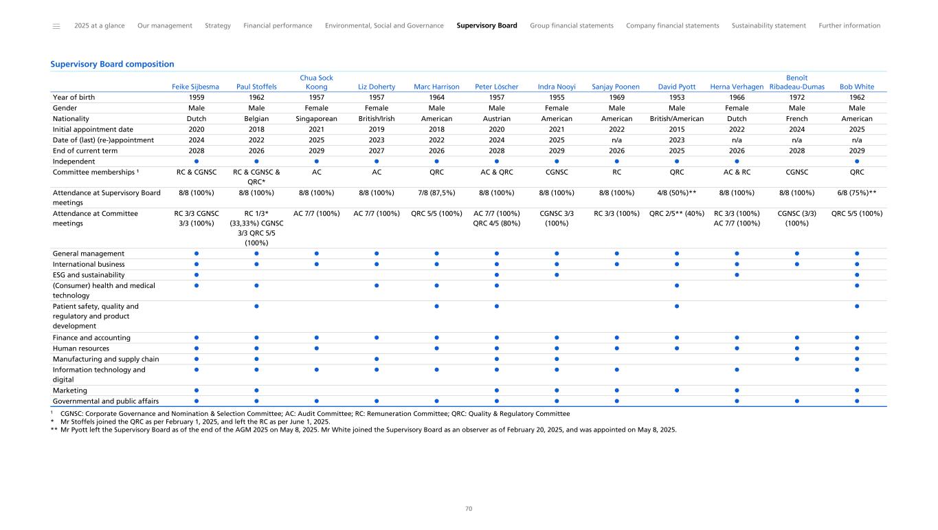 Supervisory Board composition Year of birth 1959 1962 1957 1957 1964 1957 1955 1969 1953 1966 1972 1962 Gender Male Male Female Female Male Male Female Male Male Female Male Male Nationality Dutch Belgian Singaporean British/Irish American Austrian American American British/American Dutch French American Initial appointment date 2020 2018 2021 2019 2018 2020 2021 2022 2015 2022 2024 2025 Date of (last) (re-)appointment 2024 2022 2025 2023 2022 2024 2025 n/a 2023 n/a n/a n/a End of current term 2028 2026 2029 2027 2026 2028 2029 2026 2025 2026 2028 2029 Independent l l l l l l l l l l l Committee memberships ¹ RC & CGNSC RC & CGNSC & QRC* AC AC QRC AC & QRC CGNSC RC QRC AC & RC CGNSC QRC Attendance at Supervisory Board meetings 8/8 (100%) 8/8 (100%) 8/8 (100%) 8/8 (100%) 7/8 (87,5%) 8/8 (100%) 8/8 (100%) 8/8 (100%) 4/8 (50%)** 8/8 (100%) 8/8 (100%) 6/8 (75%)** Attendance at Committee meetings RC 3/3 CGNSC 3/3 (100%) RC 1/3* (33,33%) CGNSC 3/3 QRC 5/5 (100%) AC 7/7 (100%) AC 7/7 (100%) QRC 5/5 (100%) AC 7/7 (100%) QRC 4/5 (80%) CGNSC 3/3 (100%) RC 3/3 (100%) QRC 2/5** (40%) RC 3/3 (100%) AC 7/7 (100%) CGNSC (3/3) (100%) QRC 5/5 (100%) General management l l l l l l l l l l l l International business l l l l l l l l l l l l ESG and sustainability l l l l l (Consumer) health and medical technology l l l l l l l Patient safety, quality and regulatory and product development l l l l l Finance and accounting l l l l l l l l l l l l Human resources l l l l l l l l l l l Manufacturing and supply chain l l l l l l l Information technology and digital l l l l l l l l l l Marketing l l l l l l l l Governmental and public affairs l l l l l l l l l l l Feike Sijbesma Paul Stoffels Chua Sock Koong Liz Doherty Marc Harrison Peter Löscher Indra Nooyi Sanjay Poonen David Pyott Herna Verhagen Benoît Ribadeau-Dumas Bob White 1 CGNSC: Corporate Governance and Nomination & Selection Committee; AC: Audit Committee; RC: Remuneration Committee; QRC: Quality & Regulatory Committee * Mr Stoffels joined the QRC as per February 1, 2025, and left the RC as per June 1, 2025. ** Mr Pyott left the Supervisory Board as of the end of the AGM 2025 on May 8, 2025. Mr White joined the Supervisory Board as an observer as of February 20, 2025, and was appointed on May 8, 2025. ______ 2025 at a glance Our management Strategy Financial performance Environmental, Social and Governance Supervisory Board Group financial statements Company financial statements Sustainability statement Further information 70