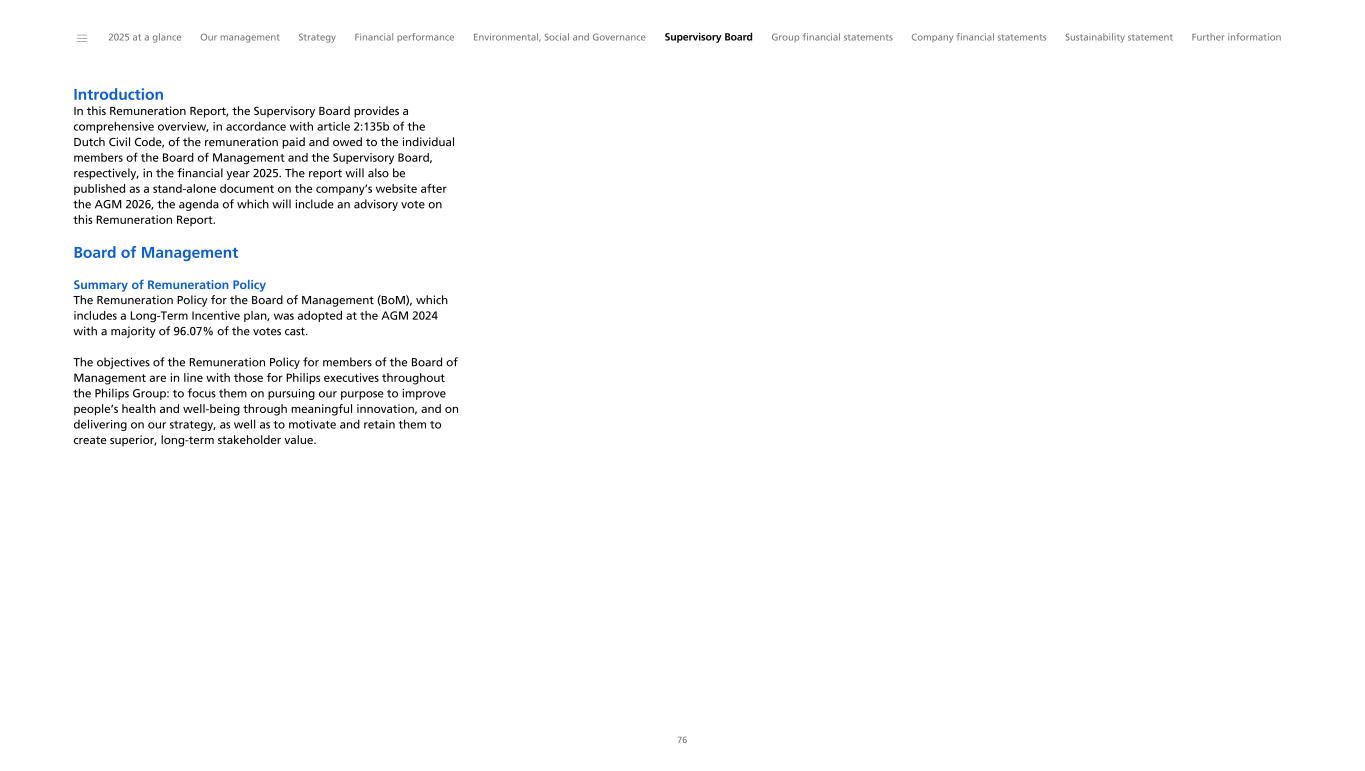 Introduction In this Remuneration Report, the Supervisory Board provides a comprehensive overview, in accordance with article 2:135b of the Dutch Civil Code, of the remuneration paid and owed to the individual members of the Board of Management and the Supervisory Board, respectively, in the financial year 2025. The report will also be published as a stand-alone document on the company’s website after the AGM 2026, the agenda of which will include an advisory vote on this Remuneration Report. Board of Management Summary of Remuneration Policy The Remuneration Policy for the Board of Management (BoM), which includes a Long-Term Incentive plan, was adopted at the AGM 2024 with a majority of 96.07% of the votes cast. The objectives of the Remuneration Policy for members of the Board of Management are in line with those for Philips executives throughout the Philips Group: to focus them on pursuing our purpose to improve people’s health and well-being through meaningful innovation, and on delivering on our strategy, as well as to motivate and retain them to create superior, long-term stakeholder value. ______ 2025 at a glance Our management Strategy Financial performance Environmental, Social and Governance Supervisory Board Group financial statements Company financial statements Sustainability statement Further information 76