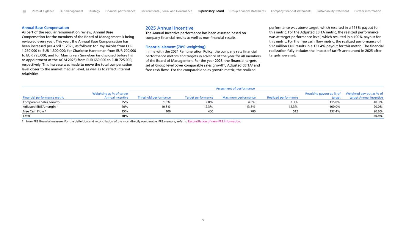Annual Base Compensation As part of the regular remuneration review, Annual Base Compensation for the members of the Board of Management is being reviewed every year. This year, the Annual Base Compensation has been increased per April 1, 2025, as follows: for Roy Jakobs from EUR 1,250,000 to EUR 1,300,000; for Charlotte Hanneman from EUR 700,000 to EUR 725,000; and for Marnix van Ginneken (as disclosed before his re-appointment at the AGM 2025) from EUR 660,000 to EUR 725,000, respectively. This increase was made to move the total compensation level closer to the market median level, as well as to reflect internal relativities. 2025 Annual Incentive The Annual Incentive performance has been assessed based on company financial results as well as non-financial results. Financial element (70% weighting) In line with the 2024 Remuneration Policy, the company sets financial performance metrics and targets in advance of the year for all members of the Board of Management. For the year 2025, the financial targets set at Group level cover comparable sales growth1, Adjusted EBITA1 and free cash flow1. For the comparable sales growth metric, the realized performance was above target, which resulted in a 115% payout for this metric. For the Adjusted EBITA metric, the realized performance was at target performance level, which resulted in a 100% payout for this metric. For the free cash flow metric, the realized performance of 512 million EUR results in a 137.4% payout for this metric. The financial realization fully includes the impact of tariffs announced in 2025 after targets were set. Comparable Sales Growth ¹ 35% 1.0% 2.0% 4.0% 2.3% 115.0% 40.3% Adjusted EBITA margin ¹ 20% 10.8% 12.3% 13.8% 12.3% 100.0% 20.0% Free Cash Flow ¹ 15% 100 400 700 512 137.4% 20.6% Total 70% 80.9% Financial performance metric Weighting as % of target Annual Incentive Assessment of performance Weighted pay-out as % of target Annual IncentiveThreshold performance Target performance Maximum performance Realized performance Resulting payout as % of target 1 Non-IFRS financial measure. For the definition and reconciliation of the most directly comparable IFRS measure, refer to Reconciliation of non-IFRS information. ______ 2025 at a glance Our management Strategy Financial performance Environmental, Social and Governance Supervisory Board Group financial statements Company financial statements Sustainability statement Further information 79