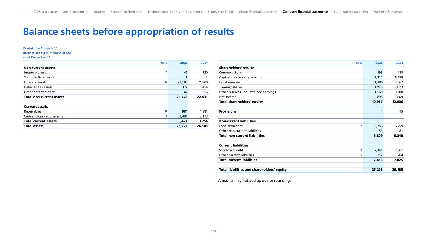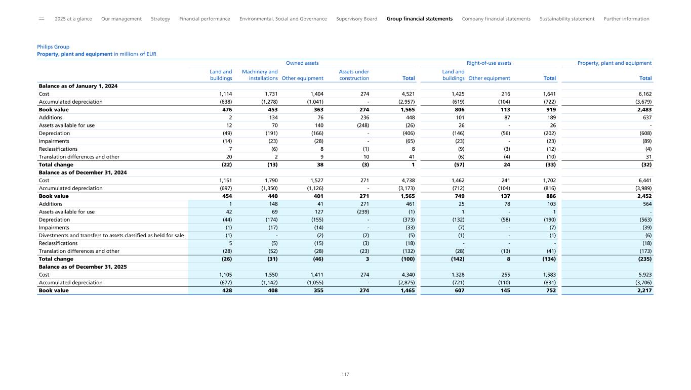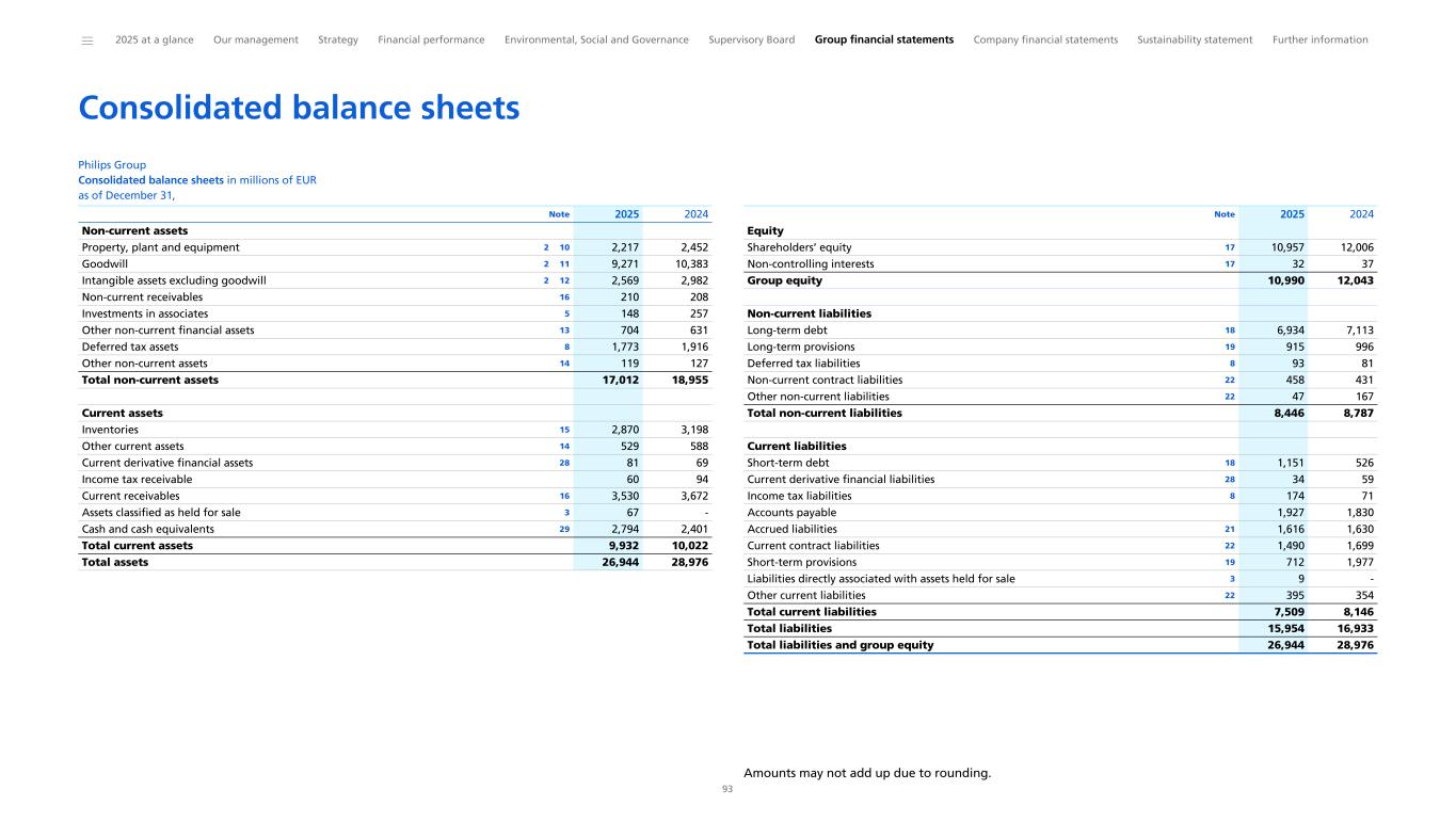 Consolidated balance sheets Philips Group Consolidated balance sheets in millions of EUR as of December 31, Non-current assets Property, plant and equipment 2 10 2,217 2,452 Goodwill 2 11 9,271 10,383 Intangible assets excluding goodwill 2 12 2,569 2,982 Non-current receivables 16 210 208 Investments in associates 5 148 257 Other non-current financial assets 13 704 631 Deferred tax assets 8 1,773 1,916 Other non-current assets 14 119 127 Total non-current assets 17,012 18,955 Current assets Inventories 15 2,870 3,198 Other current assets 14 529 588 Current derivative financial assets 28 81 69 Income tax receivable 60 94 Current receivables 16 3,530 3,672 Assets classified as held for sale 3 67 - Cash and cash equivalents 29 2,794 2,401 Total current assets 9,932 10,022 Total assets 26,944 28,976 Note 2025 2024 Equity Shareholders’ equity 17 10,957 12,006 Non-controlling interests 17 32 37 Group equity 10,990 12,043 Non-current liabilities Long-term debt 18 6,934 7,113 Long-term provisions 19 915 996 Deferred tax liabilities 8 93 81 Non-current contract liabilities 22 458 431 Other non-current liabilities 22 47 167 Total non-current liabilities 8,446 8,787 Current liabilities Short-term debt 18 1,151 526 Current derivative financial liabilities 28 34 59 Income tax liabilities 8 174 71 Accounts payable 1,927 1,830 Accrued liabilities 21 1,616 1,630 Current contract liabilities 22 1,490 1,699 Short-term provisions 19 712 1,977 Liabilities directly associated with assets held for sale 3 9 - Other current liabilities 22 395 354 Total current liabilities 7,509 8,146 Total liabilities 15,954 16,933 Total liabilities and group equity 26,944 28,976 Note 2025 2024 Amounts may not add up due to rounding. ______ 2025 at a glance Our management Strategy Financial performance Environmental, Social and Governance Supervisory Board Group financial statements Company financial statements Sustainability statement Further information 93