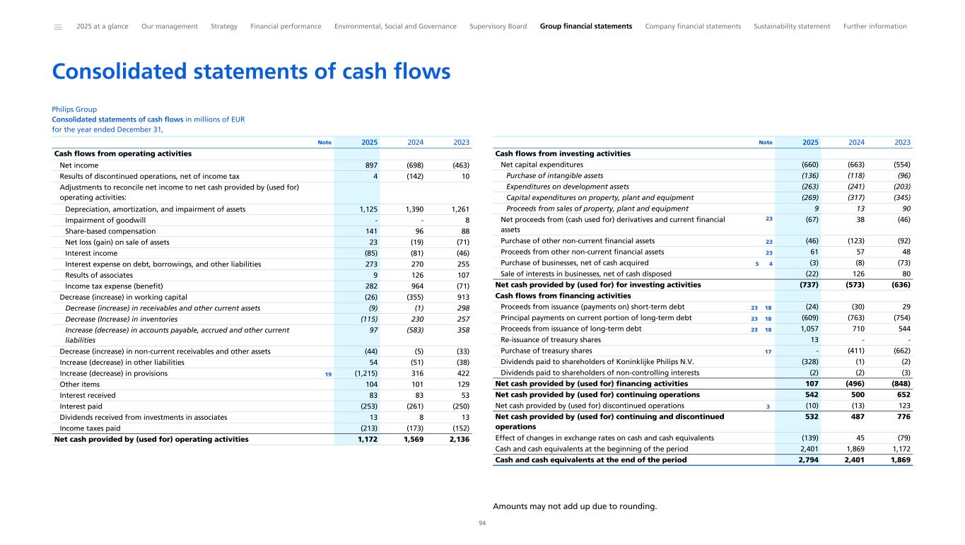 Consolidated statements of cash flows Philips Group Consolidated statements of cash flows in millions of EUR for the year ended December 31, Cash flows from operating activities Net income 897 (698) (463) Results of discontinued operations, net of income tax 4 (142) 10 Adjustments to reconcile net income to net cash provided by (used for) operating activities: Depreciation, amortization, and impairment of assets 1,125 1,390 1,261 Impairment of goodwill - - 8 Share-based compensation 141 96 88 Net loss (gain) on sale of assets 23 (19) (71) Interest income (85) (81) (46) Interest expense on debt, borrowings, and other liabilities 273 270 255 Results of associates 9 126 107 Income tax expense (benefit) 282 964 (71) Decrease (increase) in working capital (26) (355) 913 Decrease (increase) in receivables and other current assets (9) (1) 298 Decrease (Increase) in inventories (115) 230 257 Increase (decrease) in accounts payable, accrued and other current liabilities 97 (583) 358 Decrease (increase) in non-current receivables and other assets (44) (5) (33) Increase (decrease) in other liabilities 54 (51) (38) Increase (decrease) in provisions 19 (1,215) 316 422 Other items 104 101 129 Interest received 83 83 53 Interest paid (253) (261) (250) Dividends received from investments in associates 13 8 13 Income taxes paid (213) (173) (152) Net cash provided by (used for) operating activities 1,172 1,569 2,136 Note 2025 2024 2023 Cash flows from investing activities Net capital expenditures (660) (663) (554) Purchase of intangible assets (136) (118) (96) Expenditures on development assets (263) (241) (203) Capital expenditures on property, plant and equipment (269) (317) (345) Proceeds from sales of property, plant and equipment 9 13 90 Net proceeds from (cash used for) derivatives and current financial assets 23 (67) 38 (46) Purchase of other non-current financial assets 23 (46) (123) (92) Proceeds from other non-current financial assets 23 61 57 48 Purchase of businesses, net of cash acquired 5 4 (3) (8) (73) Sale of interests in businesses, net of cash disposed (22) 126 80 Net cash provided by (used for) for investing activities (737) (573) (636) Cash flows from financing activities Proceeds from issuance (payments on) short-term debt 23 18 (24) (30) 29 Principal payments on current portion of long-term debt 23 18 (609) (763) (754) Proceeds from issuance of long-term debt 23 18 1,057 710 544 Re-issuance of treasury shares 13 - - Purchase of treasury shares 17 - (411) (662) Dividends paid to shareholders of Koninklijke Philips N.V. (328) (1) (2) Dividends paid to shareholders of non-controlling interests (2) (2) (3) Net cash provided by (used for) financing activities 107 (496) (848) Net cash provided by (used for) continuing operations 542 500 652 Net cash provided by (used for) discontinued operations 3 (10) (13) 123 Net cash provided by (used for) continuing and discontinued operations 532 487 776 Effect of changes in exchange rates on cash and cash equivalents (139) 45 (79) Cash and cash equivalents at the beginning of the period 2,401 1,869 1,172 Cash and cash equivalents at the end of the period 2,794 2,401 1,869 Note 2025 2024 2023 Amounts may not add up due to rounding. ______ 2025 at a glance Our management Strategy Financial performance Environmental, Social and Governance Supervisory Board Group financial statements Company financial statements Sustainability statement Further information 94
