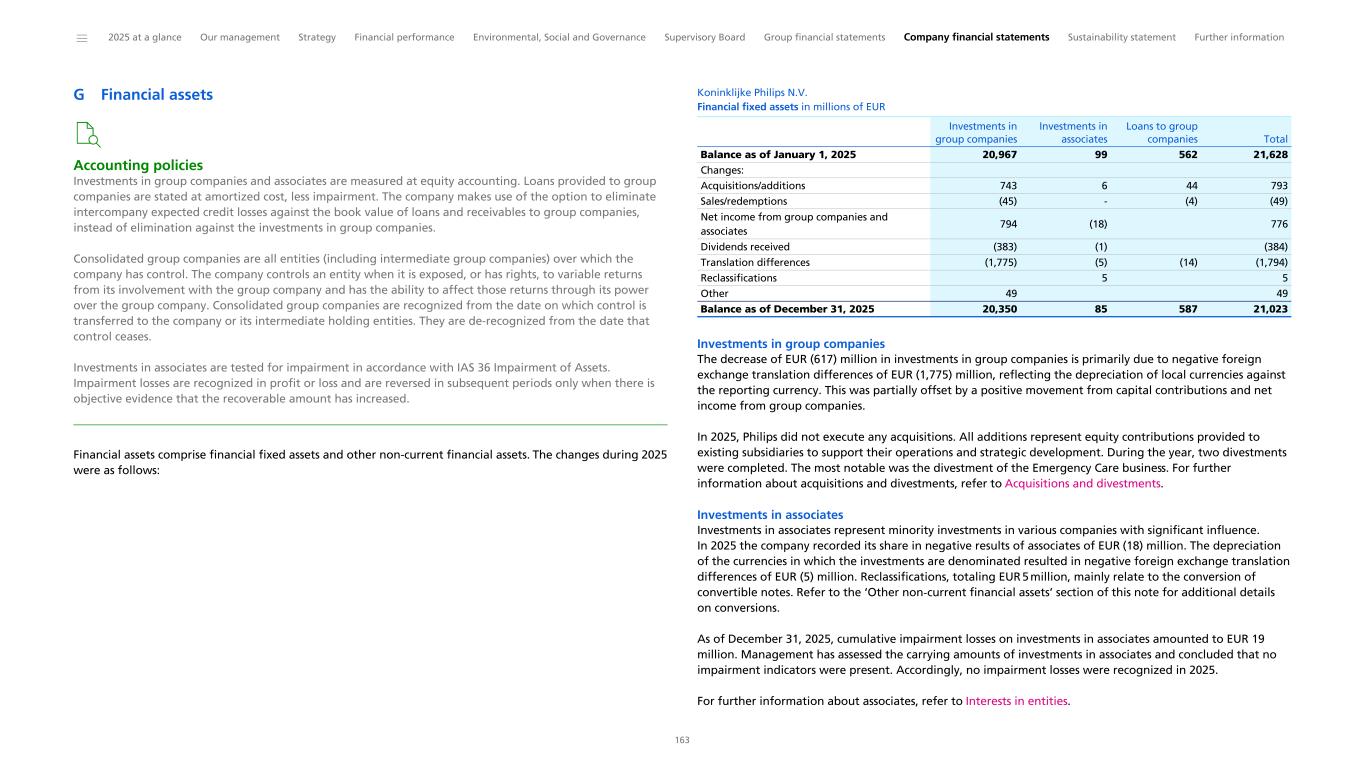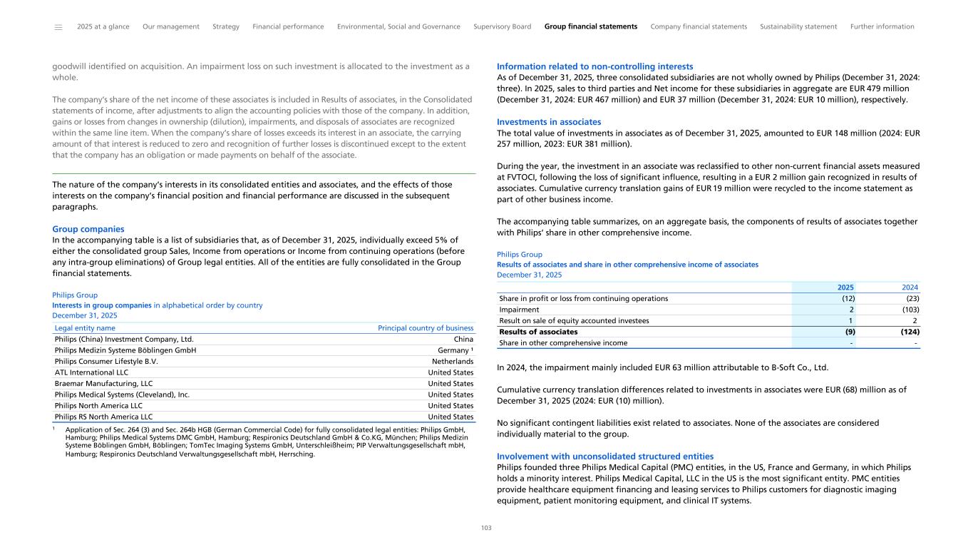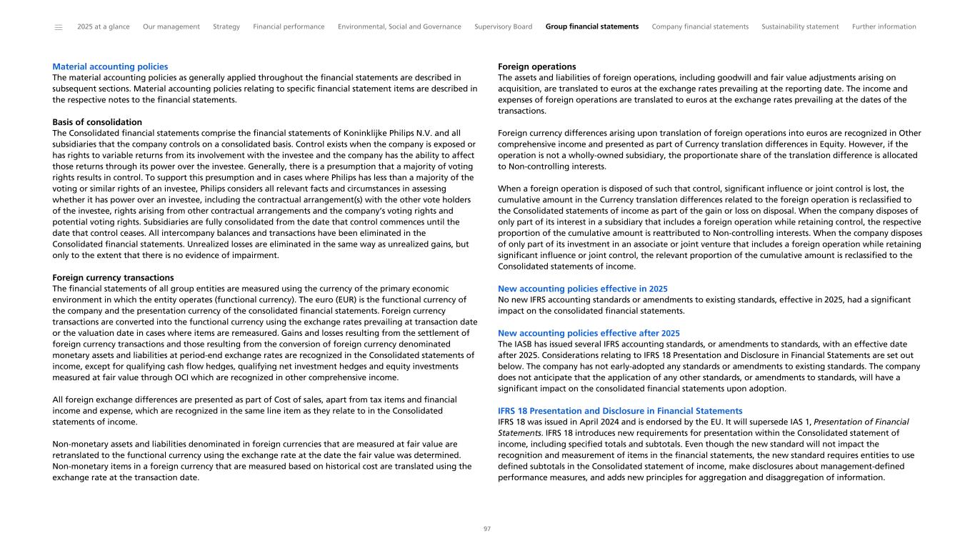 Material accounting policies The material accounting policies as generally applied throughout the financial statements are described in subsequent sections. Material accounting policies relating to specific financial statement items are described in the respective notes to the financial statements. Basis of consolidation The Consolidated financial statements comprise the financial statements of Koninklijke Philips N.V. and all subsidiaries that the company controls on a consolidated basis. Control exists when the company is exposed or has rights to variable returns from its involvement with the investee and the company has the ability to affect those returns through its power over the investee. Generally, there is a presumption that a majority of voting rights results in control. To support this presumption and in cases where Philips has less than a majority of the voting or similar rights of an investee, Philips considers all relevant facts and circumstances in assessing whether it has power over an investee, including the contractual arrangement(s) with the other vote holders of the investee, rights arising from other contractual arrangements and the company’s voting rights and potential voting rights. Subsidiaries are fully consolidated from the date that control commences until the date that control ceases. All intercompany balances and transactions have been eliminated in the Consolidated financial statements. Unrealized losses are eliminated in the same way as unrealized gains, but only to the extent that there is no evidence of impairment. Foreign currency transactions The financial statements of all group entities are measured using the currency of the primary economic environment in which the entity operates (functional currency). The euro (EUR) is the functional currency of the company and the presentation currency of the consolidated financial statements. Foreign currency transactions are converted into the functional currency using the exchange rates prevailing at transaction date or the valuation date in cases where items are remeasured. Gains and losses resulting from the settlement of foreign currency transactions and those resulting from the conversion of foreign currency denominated monetary assets and liabilities at period-end exchange rates are recognized in the Consolidated statements of income, except for qualifying cash flow hedges, qualifying net investment hedges and equity investments measured at fair value through OCI which are recognized in other comprehensive income. All foreign exchange differences are presented as part of Cost of sales, apart from tax items and financial income and expense, which are recognized in the same line item as they relate to in the Consolidated statements of income. Non-monetary assets and liabilities denominated in foreign currencies that are measured at fair value are retranslated to the functional currency using the exchange rate at the date the fair value was determined. Non-monetary items in a foreign currency that are measured based on historical cost are translated using the exchange rate at the transaction date. Foreign operations The assets and liabilities of foreign operations, including goodwill and fair value adjustments arising on acquisition, are translated to euros at the exchange rates prevailing at the reporting date. The income and expenses of foreign operations are translated to euros at the exchange rates prevailing at the dates of the transactions. Foreign currency differences arising upon translation of foreign operations into euros are recognized in Other comprehensive income and presented as part of Currency translation differences in Equity. However, if the operation is not a wholly-owned subsidiary, the proportionate share of the translation difference is allocated to Non-controlling interests. When a foreign operation is disposed of such that control, significant influence or joint control is lost, the cumulative amount in the Currency translation differences related to the foreign operation is reclassified to the Consolidated statements of income as part of the gain or loss on disposal. When the company disposes of only part of its interest in a subsidiary that includes a foreign operation while retaining control, the respective proportion of the cumulative amount is reattributed to Non-controlling interests. When the company disposes of only part of its investment in an associate or joint venture that includes a foreign operation while retaining significant influence or joint control, the relevant proportion of the cumulative amount is reclassified to the Consolidated statements of income. New accounting policies effective in 2025 No new IFRS accounting standards or amendments to existing standards, effective in 2025, had a significant impact on the consolidated financial statements. New accounting policies effective after 2025 The IASB has issued several IFRS accounting standards, or amendments to standards, with an effective date after 2025. Considerations relating to IFRS 18 Presentation and Disclosure in Financial Statements are set out below. The company has not early-adopted any standards or amendments to existing standards. The company does not anticipate that the application of any other standards, or amendments to standards, will have a significant impact on the consolidated financial statements upon adoption. IFRS 18 Presentation and Disclosure in Financial Statements IFRS 18 was issued in April 2024 and is endorsed by the EU. It will supersede IAS 1, Presentation of Financial Statements. IFRS 18 introduces new requirements for presentation within the Consolidated statement of income, including specified totals and subtotals. Even though the new standard will not impact the recognition and measurement of items in the financial statements, the new standard requires entities to use defined subtotals in the Consolidated statement of income, make disclosures about management-defined performance m