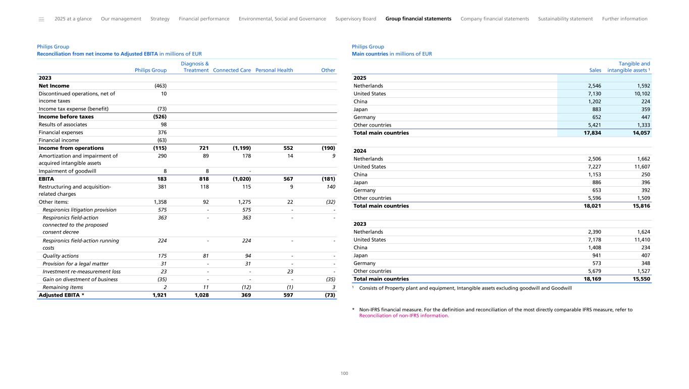 Philips Group Reconciliation from net income to Adjusted EBITA in millions of EUR 2023 Net Income (463) Discontinued operations, net of income taxes 10 Income tax expense (benefit) (73) Income before taxes (526) Results of associates 98 Financial expenses 376 Financial income (63) Income from operations (115) 721 (1,199) 552 (190) Amortization and impairment of acquired intangible assets 290 89 178 14 9 Impairment of goodwill 8 8 - EBITA 183 818 (1,020) 567 (181) Restructuring and acquisition- related charges 381 118 115 9 140 Other items: 1,358 92 1,275 22 (32) Respironics litigation provision 575 - 575 - - Respironics field-action connected to the proposed consent decree 363 - 363 - - Respironics field-action running costs 224 - 224 - - Quality actions 175 81 94 - - Provision for a legal matter 31 - 31 - - Investment re-measurement loss 23 - - 23 - Gain on divestment of business (35) - - - (35) Remaining items 2 11 (12) (1) 3 Adjusted EBITA * 1,921 1,028 369 597 (73) Philips Group Diagnosis & Treatment Connected Care Personal Health Other Philips Group Main countries in millions of EUR 2025 Netherlands 2,546 1,592 United States 7,130 10,102 China 1,202 224 Japan 883 359 Germany 652 447 Other countries 5,421 1,333 Total main countries 17,834 14,057 2024 Netherlands 2,506 1,662 United States 7,227 11,607 China 1,153 250 Japan 886 396 Germany 653 392 Other countries 5,596 1,509 Total main countries 18,021 15,816 2023 Netherlands 2,390 1,624 United States 7,178 11,410 China 1,408 234 Japan 941 407 Germany 573 348 Other countries 5,679 1,527 Total main countries 18,169 15,550 Sales Tangible and intangible assets ¹ 1 Consists of Property plant and equipment, Intangible assets excluding goodwill and Goodwill * Non-IFRS financial measure. For the definition and reconciliation of the most directly comparable IFRS measure, refer to Reconciliation of non-IFRS information. ______ 2025 at a glance Our management Strategy Financial performance Environmental, Social and Governance Supervisory Board Group financial statements Company financial statements Sustainability statement Further information 100