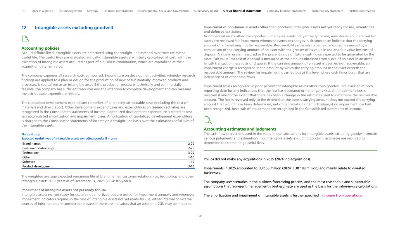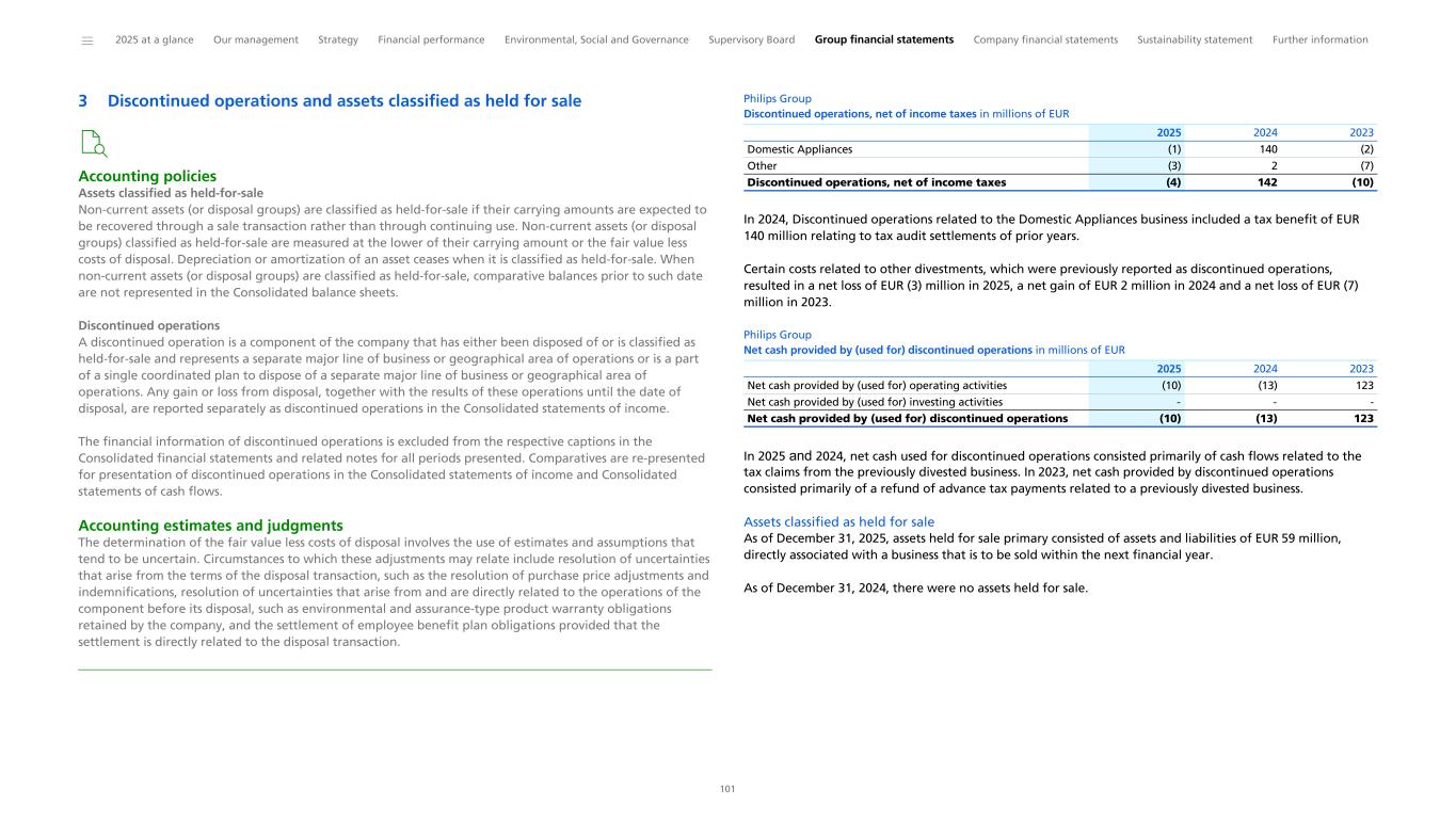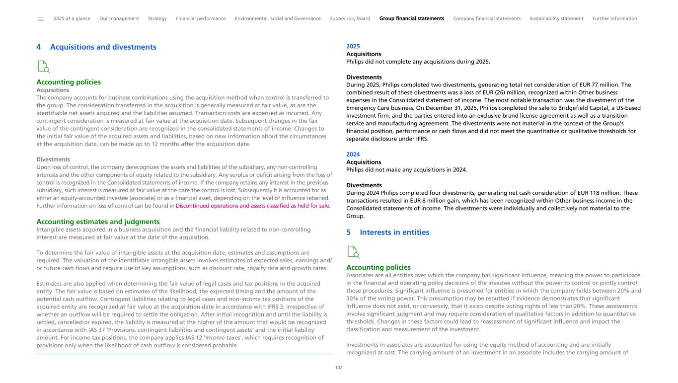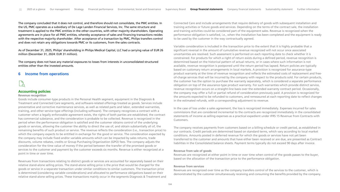 Notes to the Consolidated financial statements 1 General information to the Consolidated financial statements Reporting entity and its operations Koninklijke Philips N.V. (‘Royal Philips’), incorporated and domiciled in the Netherlands, is a public limited liability company organized under Dutch Law (registration number 17001910). Philips is headquartered at Prinses Irenestraat 59, 1077 WV Amsterdam, the Netherlands and has its registered address at High Tech Campus 52, 5656 AG Eindhoven, the Netherlands. The consolidated financial statements of Royal Philips as of December 31, 2025, comprise Royal Philips and its subsidiaries (together referred to as the 'company’ or ‘Philips’ or the 'Group’). Philips is a leading health technology company primarily involved in diagnostic imaging, image- guided therapy, patient monitoring and health informatics, as well as in consumer health and home care. Basis of preparation The Consolidated financial statements are: • prepared in accordance with International Financial Reporting Standards (IFRS) Accounting Standards as adopted by the European Union (EU) and comply with the statutory provisions of Part 9, Book 2 of the Dutch Civil Code. All standards and interpretations issued by the International Accounting Standards Board (IASB) and the IFRS Interpretations Committee effective in 2025 have been endorsed by the EU. As a result, Philips’ accounting policies also fully comply with IFRS Accounting Standards as issued by the IASB. These accounting policies have been applied by group entities • authorized for issue by the Board of Management of Royal Philips on February 19, 2026 • prepared under the historical cost convention, unless otherwise indicated • prepared on a going concern basis • presented in euro, which is the presentation currency • rounded to the nearest million euro unless stated otherwise • subject to rounding, whereby amounts may not add up precisely to the totals provided Accounting estimates and judgments The preparation of these financial statements requires management to make a number of estimates and judgments that affect the application of accounting policies and the reported amounts of assets and liabilities, revenues and expenses, and the disclosure of contingent assets and liabilities. Amounts recognized are based on factors that are by default associated with uncertainty. Actual results may therefore differ from estimates. Estimates and underlying assumptions are reviewed on an ongoing basis. Revision to estimates are recognized prospectively. Where applicable, the estimates and judgments of specific financial statement items are described in the respective note to the consolidated financial statements. The areas involving a higher degree of judgment and complexity in applying accounting principles and for which changes in the assumptions and estimates could result in significantly different results than those recorded in the consolidated financial statements are the following: • judgment applied in determining reportable segments involves evaluating the information reviewed by the Chief Operating Decision-Maker (the Board of Management) to assess performance and allocate resources (Information by segment and main country) • assessment of control (below paragraph Basis of consolidation and Interests in entities) • revenue recognition (Income from operations) • for acquisitions, the identification and valuation of acquired assets and liabilities including contingent considerations provisions (Acquisitions and divestments, Provisions) • determination of deferred tax assets for losses carried forward and uncertain tax positions (Income taxes) • assumptions used for impairment testing (Goodwill, Intangible assets excluding goodwill) • assessments of exposure to credit risk of financial instruments (Other financial assets, Receivables, Debt, Fair value of financial assets and liabilities, Details of treasury and other financial risks) • assumptions used to determine the net realizable value of inventories (Inventories) • actuarial assumptions of future events that are used in calculating post-employment benefit expenses and liabilities (Post-employment benefits) • estimates and assumptions regarding the timing and the amount of outflow of resources, as well as estimating the likelihood of a potential outflow of resources and the ability to make a reliable estimate of the obligation relating to provisions and contingent liabilities (Provisions, Contingencies) The company regularly updates its significant assumptions and estimates to support the reported amounts of assets, liabilities, income and expenses. Climate change In preparing the consolidated financial statements, management has considered the impact of climate change, specifically the financial impact of Philips meeting its internal and external climate-related aims, the potential impact of climate-related risks, and the costs incurred to pro-actively manage such risks. These considerations did not have a material impact on the financial reporting judgments, estimates or assumptions. The financial impacts considered include specific climate mitigation measures, such as the use of lower-carbon energy sources, the cost of developing more sustainable product offerings, and expenses incurred to mitigate against the impact of extreme weather conditions. To meet its long-term Science Based Targets and reduce its full value chain emissions in line with a 1.5 °C global warming scenario, Philips has entered into a number of Power Purchase Agreements. Philips uses 100% electricity from renewable sources, mainly through long-term Power Purchase Agreements, thereby mitigating the impact of carbon taxes. The development of more sustainable products are covered through our EcoDesign program and already included in our R&D expenses. The physical risk related to climate change on our sites resulting from our Task Force on Climate-Related Financ