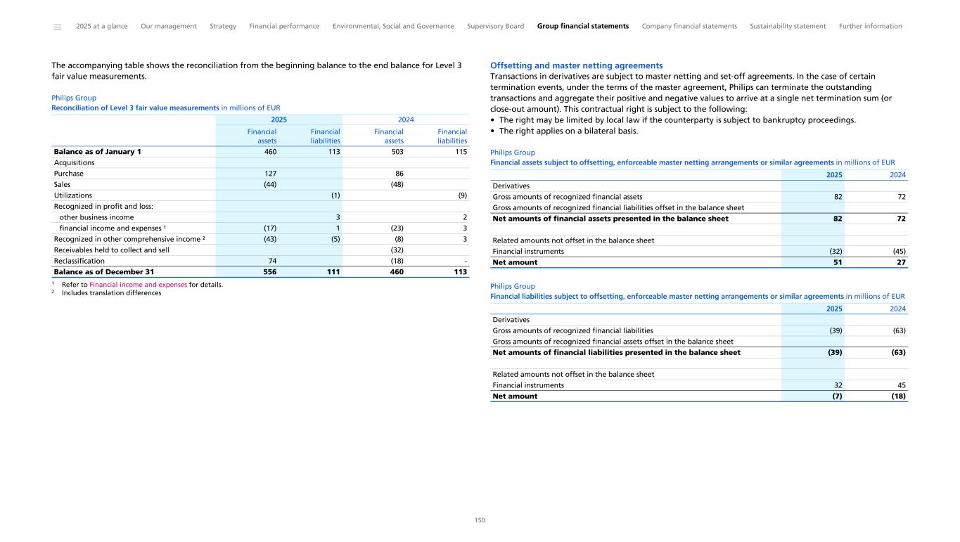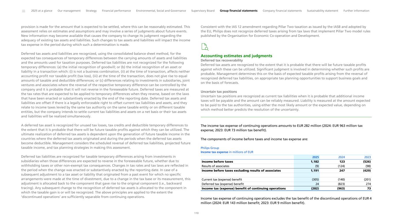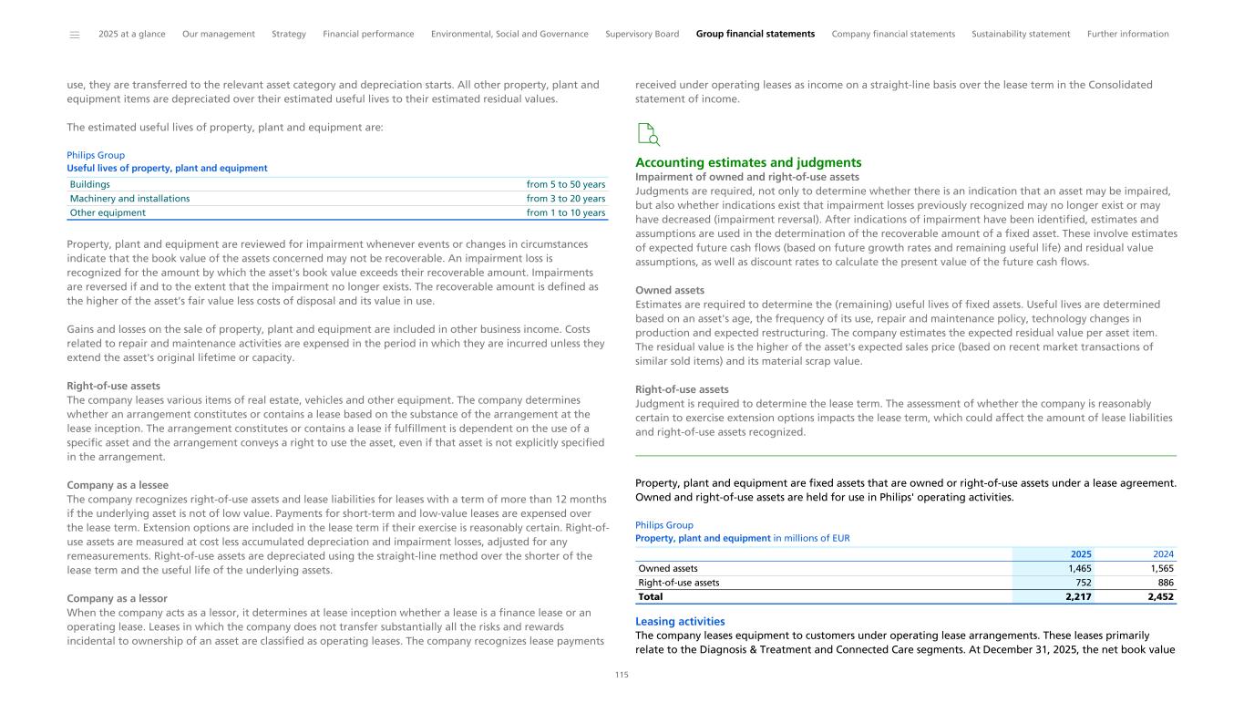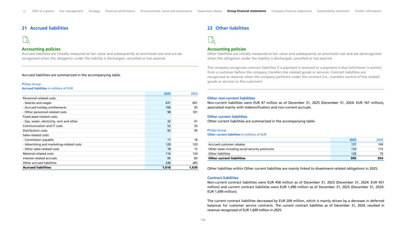 Notes to the Consolidated financial statements 1 General information to the Consolidated financial statements Reporting entity and its operations Koninklijke Philips N.V. (‘Royal Philips’), incorporated and domiciled in the Netherlands, is a public limited liability company organized under Dutch Law (registration number 17001910). Philips is headquartered at Prinses Irenestraat 59, 1077 WV Amsterdam, the Netherlands and has its registered address at High Tech Campus 52, 5656 AG Eindhoven, the Netherlands. The consolidated financial statements of Royal Philips as of December 31, 2025, comprise Royal Philips and its subsidiaries (together referred to as the 'company’ or ‘Philips’ or the 'Group’). Philips is a leading health technology company primarily involved in diagnostic imaging, image- guided therapy, patient monitoring and health informatics, as well as in consumer health and home care. Basis of preparation The Consolidated financial statements are: • prepared in accordance with International Financial Reporting Standards (IFRS) Accounting Standards as adopted by the European Union (EU) and comply with the statutory provisions of Part 9, Book 2 of the Dutch Civil Code. All standards and interpretations issued by the International Accounting Standards Board (IASB) and the IFRS Interpretations Committee effective in 2025 have been endorsed by the EU. As a result, Philips’ accounting policies also fully comply with IFRS Accounting Standards as issued by the IASB. These accounting policies have been applied by group entities • authorized for issue by the Board of Management of Royal Philips on February 19, 2026 • prepared under the historical cost convention, unless otherwise indicated • prepared on a going concern basis • presented in euro, which is the presentation currency • rounded to the nearest million euro unless stated otherwise • subject to rounding, whereby amounts may not add up precisely to the totals provided Accounting estimates and judgments The preparation of these financial statements requires management to make a number of estimates and judgments that affect the application of accounting policies and the reported amounts of assets and liabilities, revenues and expenses, and the disclosure of contingent assets and liabilities. Amounts recognized are based on factors that are by default associated with uncertainty. Actual results may therefore differ from estimates. Estimates and underlying assumptions are reviewed on an ongoing basis. Revision to estimates are recognized prospectively. Where applicable, the estimates and judgments of specific financial statement items are described in the respective note to the consolidated financial statements. The areas involving a higher degree of judgment and complexity in applying accounting principles and for which changes in the assumptions and estimates could result in significantly different results than those recorded in the consolidated financial statements are the following: • judgment applied in determining reportable segments involves evaluating the information reviewed by the Chief Operating Decision-Maker (the Board of Management) to assess performance and allocate resources (Information by segment and main country) • assessment of control (below paragraph Basis of consolidation and Interests in entities) • revenue recognition (Income from operations) • for acquisitions, the identification and valuation of acquired assets and liabilities including contingent considerations provisions (Acquisitions and divestments, Provisions) • determination of deferred tax assets for losses carried forward and uncertain tax positions (Income taxes) • assumptions used for impairment testing (Goodwill, Intangible assets excluding goodwill) • assessments of exposure to credit risk of financial instruments (Other financial assets, Receivables, Debt, Fair value of financial assets and liabilities, Details of treasury and other financial risks) • assumptions used to determine the net realizable value of inventories (Inventories) • actuarial assumptions of future events that are used in calculating post-employment benefit expenses and liabilities (Post-employment benefits) • estimates and assumptions regarding the timing and the amount of outflow of resources, as well as estimating the likelihood of a potential outflow of resources and the ability to make a reliable estimate of the obligation relating to provisions and contingent liabilities (Provisions, Contingencies) The company regularly updates its significant assumptions and estimates to support the reported amounts of assets, liabilities, income and expenses. Climate change In preparing the consolidated financial statements, management has considered the impact of climate change, specifically the financial impact of Philips meeting its internal and external climate-related aims, the potential impact of climate-related risks, and the costs incurred to pro-actively manage such risks. These considerations did not have a material impact on the financial reporting judgments, estimates or assumptions. The financial impacts considered include specific climate mitigation measures, such as the use of lower-carbon energy sources, the cost of developing more sustainable product offerings, and expenses incurred to mitigate against the impact of extreme weather conditions. To meet its long-term Science Based Targets and reduce its full value chain emissions in line with a 1.5 °C global warming scenario, Philips has entered into a number of Power Purchase Agreements. Philips uses 100% electricity from renewable sources, mainly through long-term Power Purchase Agreements, thereby mitigating the impact of carbon taxes. The development of more sustainable products are covered through our EcoDesign program and already included in our R&D expenses. The physical risk related to climate change on our sites resulting from our Task Force on Climate-Related Financ