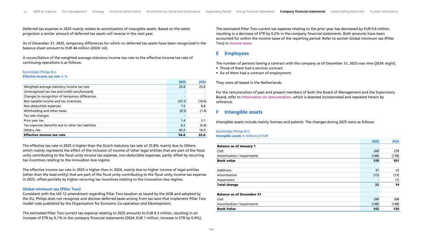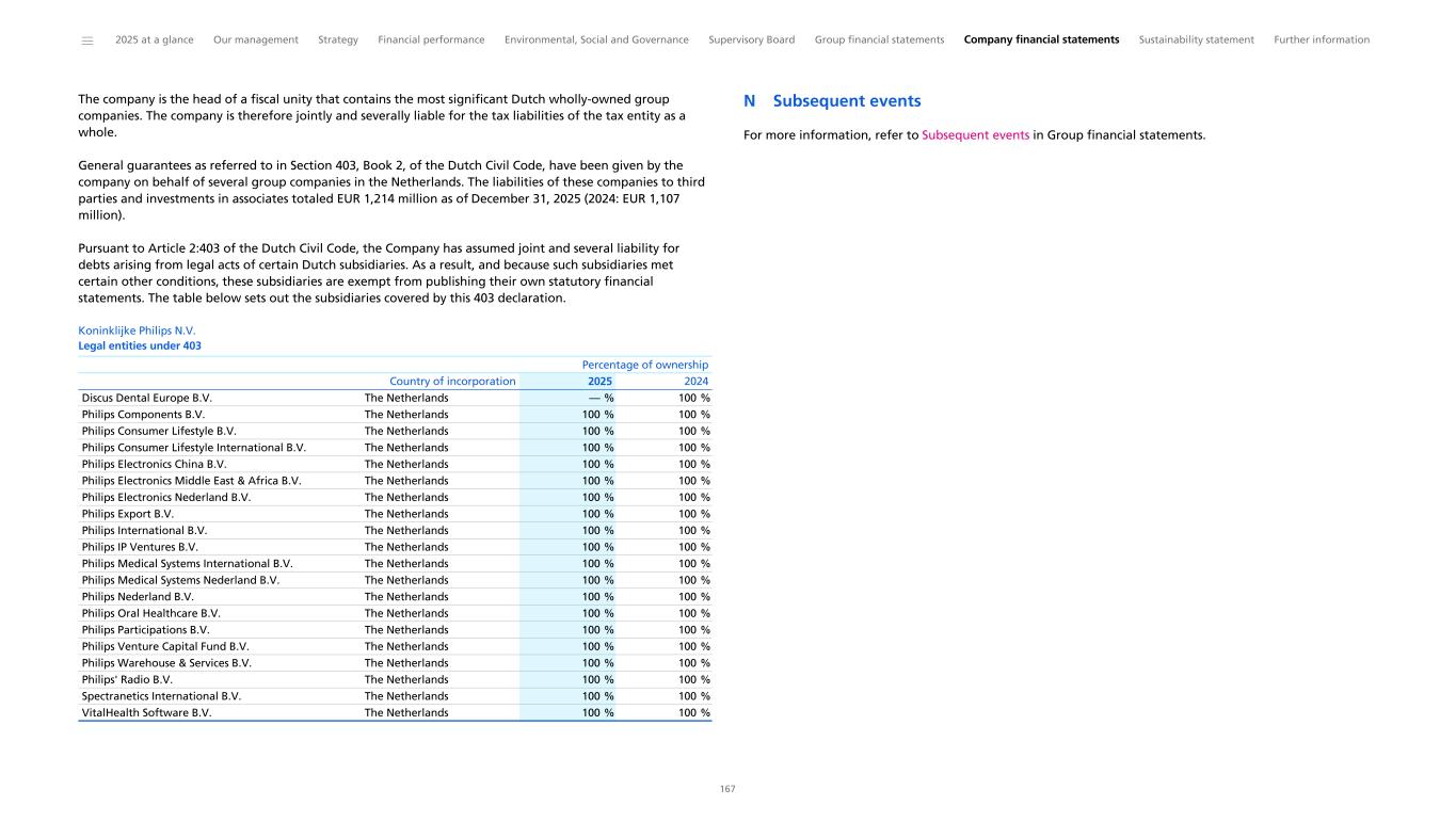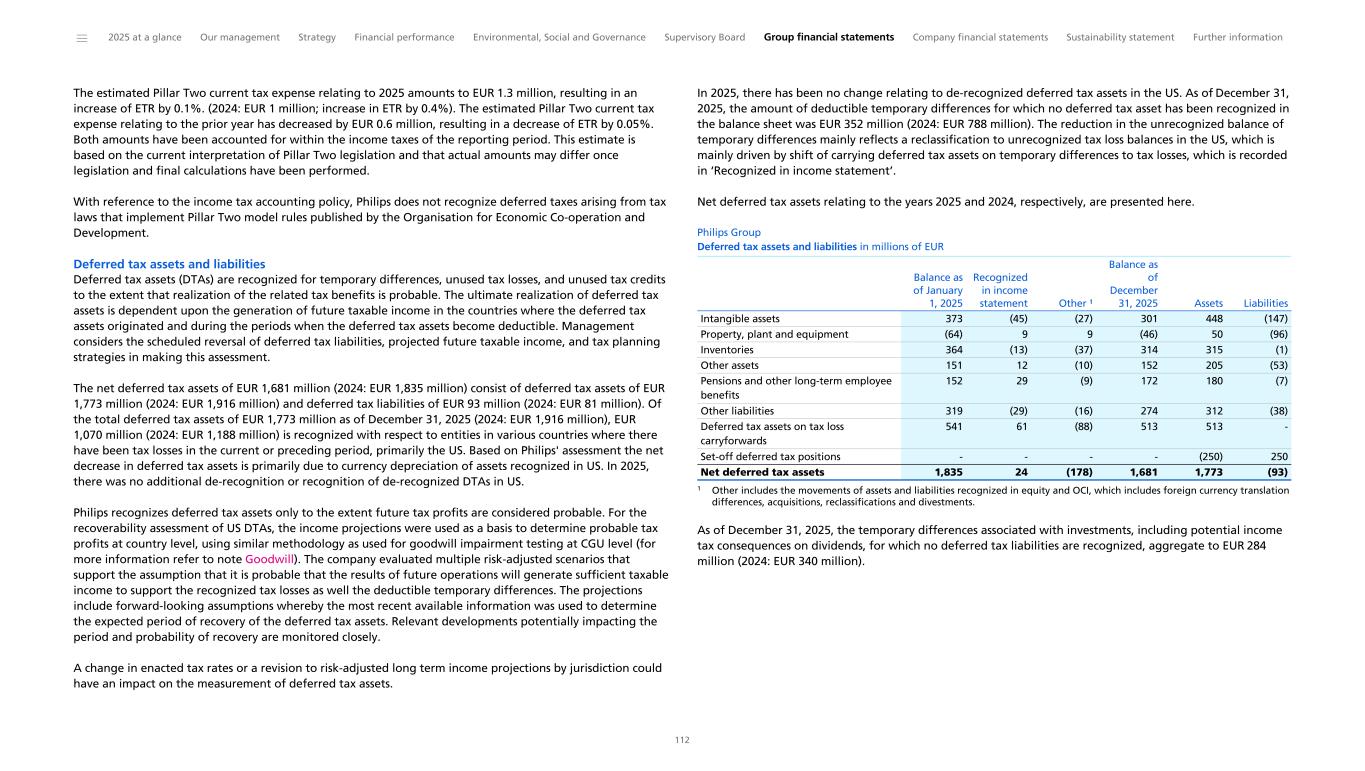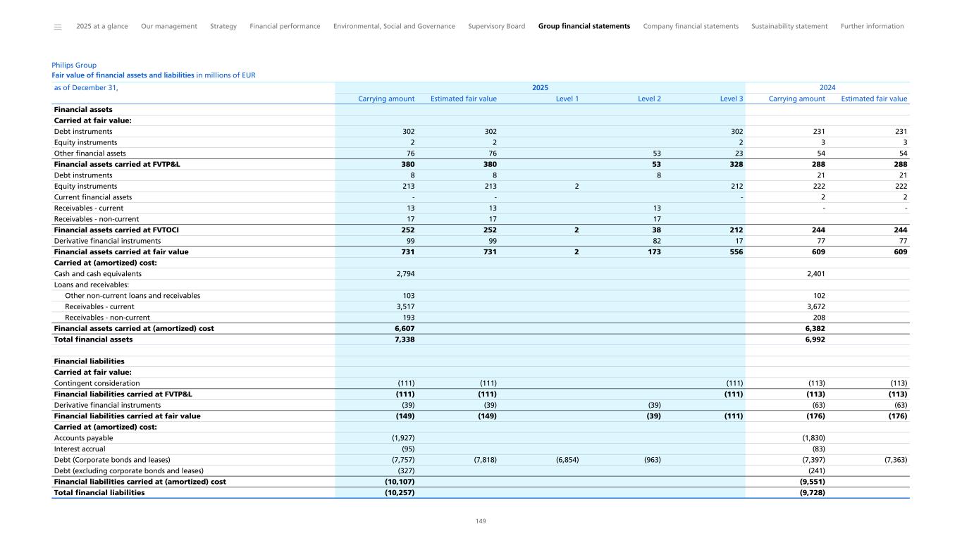 Notes to the Consolidated financial statements 1 General information to the Consolidated financial statements Reporting entity and its operations Koninklijke Philips N.V. (‘Royal Philips’), incorporated and domiciled in the Netherlands, is a public limited liability company organized under Dutch Law (registration number 17001910). Philips is headquartered at Prinses Irenestraat 59, 1077 WV Amsterdam, the Netherlands and has its registered address at High Tech Campus 52, 5656 AG Eindhoven, the Netherlands. The consolidated financial statements of Royal Philips as of December 31, 2025, comprise Royal Philips and its subsidiaries (together referred to as the 'company’ or ‘Philips’ or the 'Group’). Philips is a leading health technology company primarily involved in diagnostic imaging, image- guided therapy, patient monitoring and health informatics, as well as in consumer health and home care. Basis of preparation The Consolidated financial statements are: • prepared in accordance with International Financial Reporting Standards (IFRS) Accounting Standards as adopted by the European Union (EU) and comply with the statutory provisions of Part 9, Book 2 of the Dutch Civil Code. All standards and interpretations issued by the International Accounting Standards Board (IASB) and the IFRS Interpretations Committee effective in 2025 have been endorsed by the EU. As a result, Philips’ accounting policies also fully comply with IFRS Accounting Standards as issued by the IASB. These accounting policies have been applied by group entities • authorized for issue by the Board of Management of Royal Philips on February 19, 2026 • prepared under the historical cost convention, unless otherwise indicated • prepared on a going concern basis • presented in euro, which is the presentation currency • rounded to the nearest million euro unless stated otherwise • subject to rounding, whereby amounts may not add up precisely to the totals provided Accounting estimates and judgments The preparation of these financial statements requires management to make a number of estimates and judgments that affect the application of accounting policies and the reported amounts of assets and liabilities, revenues and expenses, and the disclosure of contingent assets and liabilities. Amounts recognized are based on factors that are by default associated with uncertainty. Actual results may therefore differ from estimates. Estimates and underlying assumptions are reviewed on an ongoing basis. Revision to estimates are recognized prospectively. Where applicable, the estimates and judgments of specific financial statement items are described in the respective note to the consolidated financial statements. The areas involving a higher degree of judgment and complexity in applying accounting principles and for which changes in the assumptions and estimates could result in significantly different results than those recorded in the consolidated financial statements are the following: • judgment applied in determining reportable segments involves evaluating the information reviewed by the Chief Operating Decision-Maker (the Board of Management) to assess performance and allocate resources (Information by segment and main country) • assessment of control (below paragraph Basis of consolidation and Interests in entities) • revenue recognition (Income from operations) • for acquisitions, the identification and valuation of acquired assets and liabilities including contingent considerations provisions (Acquisitions and divestments, Provisions) • determination of deferred tax assets for losses carried forward and uncertain tax positions (Income taxes) • assumptions used for impairment testing (Goodwill, Intangible assets excluding goodwill) • assessments of exposure to credit risk of financial instruments (Other financial assets, Receivables, Debt, Fair value of financial assets and liabilities, Details of treasury and other financial risks) • assumptions used to determine the net realizable value of inventories (Inventories) • actuarial assumptions of future events that are used in calculating post-employment benefit expenses and liabilities (Post-employment benefits) • estimates and assumptions regarding the timing and the amount of outflow of resources, as well as estimating the likelihood of a potential outflow of resources and the ability to make a reliable estimate of the obligation relating to provisions and contingent liabilities (Provisions, Contingencies) The company regularly updates its significant assumptions and estimates to support the reported amounts of assets, liabilities, income and expenses. Climate change In preparing the consolidated financial statements, management has considered the impact of climate change, specifically the financial impact of Philips meeting its internal and external climate-related aims, the potential impact of climate-related risks, and the costs incurred to pro-actively manage such risks. These considerations did not have a material impact on the financial reporting judgments, estimates or assumptions. The financial impacts considered include specific climate mitigation measures, such as the use of lower-carbon energy sources, the cost of developing more sustainable product offerings, and expenses incurred to mitigate against the impact of extreme weather conditions. To meet its long-term Science Based Targets and reduce its full value chain emissions in line with a 1.5 °C global warming scenario, Philips has entered into a number of Power Purchase Agreements. Philips uses 100% electricity from renewable sources, mainly through long-term Power Purchase Agreements, thereby mitigating the impact of carbon taxes. The development of more sustainable products are covered through our EcoDesign program and already included in our R&D expenses. The physical risk related to climate change on our sites resulting from our Task Force on Climate-Related Financ