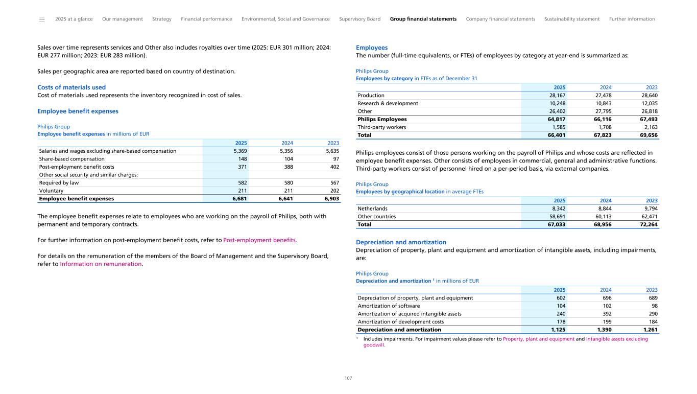 Cost of sales Philips Group Cost of sales components in millions of EUR unless otherwise stated Costs of materials used 4,120 23% 4,213 23% Salaries and wages 2,249 13% 2,313 13% Depreciation and amortization 431 2% 609 3% Other manufacturing costs 2,976 17% 3,113 17% Cost of sales 9,776 55% 10,248 57% 2025 As a % of sales 2024 As a % of sales Cost of sales decreased by EUR 472 million to EUR 9,776 million in 2025 compared with EUR 10,248 million in 2024, and decreased by 2 percentage points of sales in 2025. Factors influencing cost of sales were as follows: • Despite the negative impact of tariffs and cost inflation, cost of materials used decreased by EUR 94 million in 2025, which was mainly driven by productivity actions, lower restructuring, acquisition-related and other items and a favorable foreign currency impact. The costs for tariffs as a percentage of cost of sales increased from approximately 1% in 2024 to approximately 3% in 2025. • Salaries and wages decreased by EUR 64 million, mainly driven by productivity actions, lower restructuring charges and a favorable foreign currency impact, partly offset by cost inflation. • Depreciation and amortization decreased by EUR 178 million in 2025, mainly driven by the comparative impact of a prior year intangible asset impairment charge. • Other manufacturing costs decreased by EUR 137 million in 2025, driven by productivity actions, lower restructuring, acquisition- related and other charges, and a favorable foreign currency impact, and partly offset by cost inflation. Gross margin In 2025, gross margin was EUR 8,058 million, or 45% of sales, compared with EUR 7,773 million, or 43% of sales, in 2024. The gross margin increased by EUR 285 million year-on-year, driven by higher comparable sales growth from innovation, operational improvements, productivity measures and lower restructuring, acquisition-related and other items, and partly offset by an unfavorable foreign currency impact, cost inflation and higher tariffs. Selling expenses Selling expenses amounted to EUR 4,342 million, or 24% of sales, in 2025, compared with EUR 4,486 million, or 25% of sales, in 2024. Year- on-year selling expenses decreased by EUR 144 million, mainly driven by productivity actions, lower restructuring, acquisition-related and other items and a favorable foreign currency impact, and partly offset by cost inflation. General and administrative expenses General and administrative expenses amounted to EUR 628 million, or 4% of sales, in 2025, compared with EUR 582 million, or 3% of sales, in 2024. Expenditure increased year-on-year by EUR 46 million, mainly due to cost inflation, partly offset by productivity actions, lower restructuring, acquisition-related and other items and a favorable foreign currency impact. Research and development expenses Research and development costs were EUR 1,700 million, or 10% of sales, in 2025, compared with EUR 1,747 million, or 10% of sales, in 2024. The costs decreased year-on-year, mainly driven by productivity actions and a favorable foreign currency impact, and partly offset by cost inflation. Philips Group Research and development expenses in millions of EUR unless otherwise stated Diagnosis & Treatment 866 899 Connected Care 586 599 Personal Health 201 190 Other 46 59 Philips Group 1,700 1,747 As a % of sales 10% 10% 2025 2024 Restructuring, acquisition-related charges and other items Restructuring, acquisition-related charges and other items were EUR 530 million in 2025, compared with EUR 1,156 million in 2024. Philips Group Restructuring charges in millions of EUR Restructuring charges per segment: Diagnosis & Treatment 42 122 Connected Care 109 29 Personal Health 17 25 Other 74 91 Philips Group 242 268 Cost breakdown of restructuring charges: Provision for personnel lay-off costs 124 106 Restructuring-related asset impairment 37 134 Other restructuring-related costs 81 29 Philips Group 242 268 2025 2024 In 2025, Philips continued general productivity actions aimed at simplifying the organization to streamline ways of working and reduce operating expenses. Several restructuring projects were executed during the year, of which the most significant impacted the segments Other and Connected Care and mainly took place in the US and the Netherlands. For further information on restructuring, refer to Provisions. Philips Group Acquisition-related charges in millions of EUR Diagnosis & Treatment 2 34 Connected Care 17 24 Philips Group 19 58 2025 2024 ______ 2025 at a glance Our management Strategy Financial performance Environmental, Social and Governance Supervisory Board Group financial statements Company financial statements Sustainability statement Further information 30