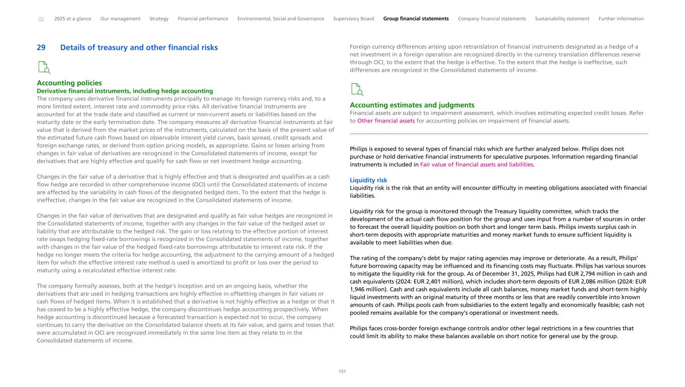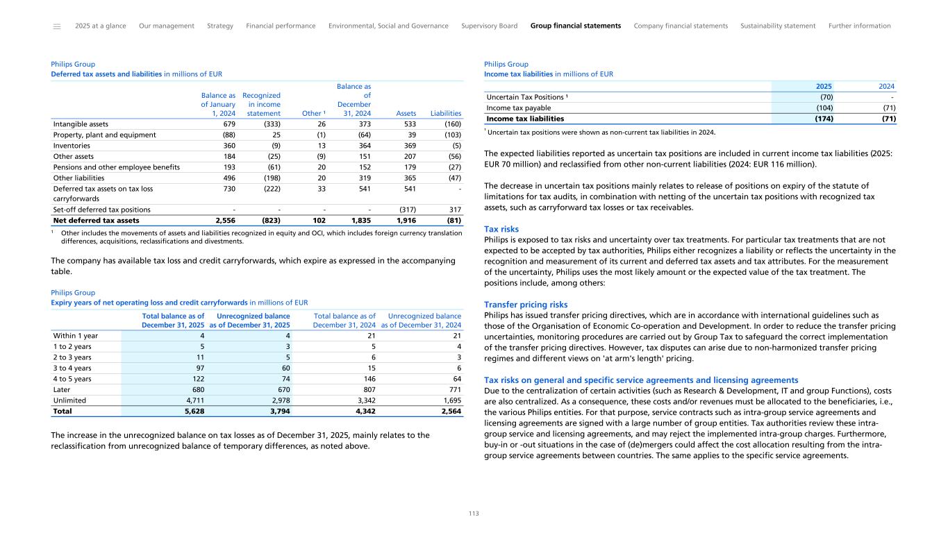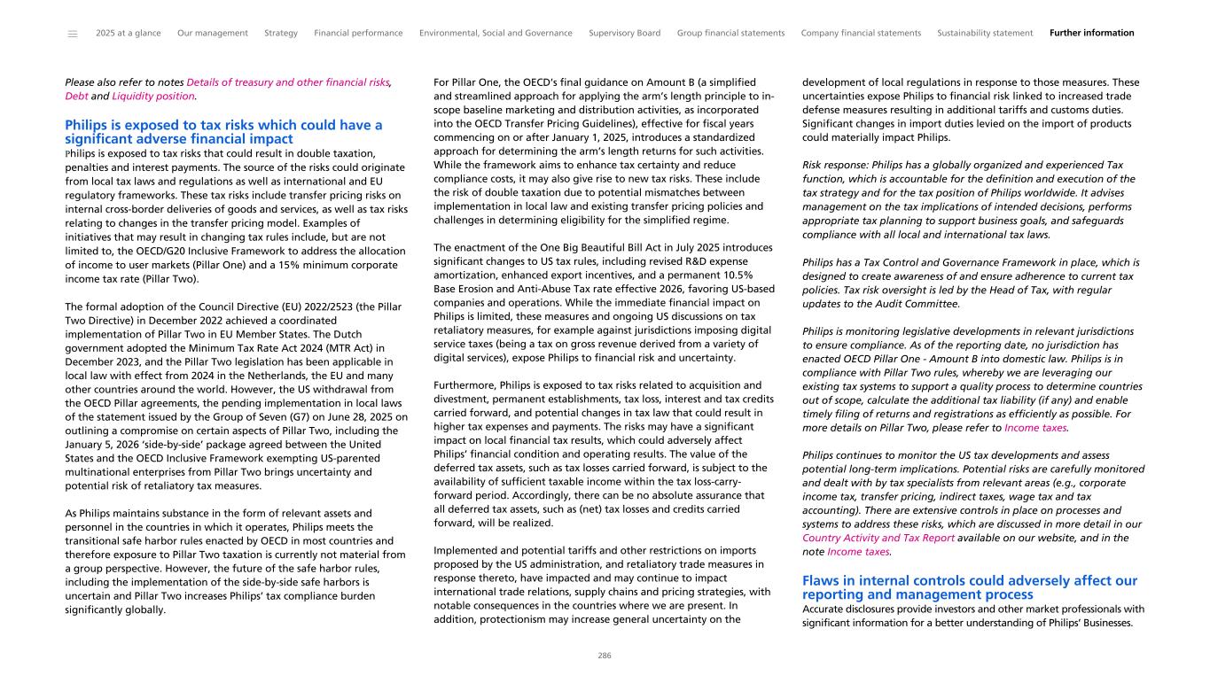 Please also refer to notes Details of treasury and other financial risks, Debt and Liquidity position. Philips is exposed to tax risks which could have a significant adverse financial impact Philips is exposed to tax risks that could result in double taxation, penalties and interest payments. The source of the risks could originate from local tax laws and regulations as well as international and EU regulatory frameworks. These tax risks include transfer pricing risks on internal cross-border deliveries of goods and services, as well as tax risks relating to changes in the transfer pricing model. Examples of initiatives that may result in changing tax rules include, but are not limited to, the OECD/G20 Inclusive Framework to address the allocation of income to user markets (Pillar One) and a 15% minimum corporate income tax rate (Pillar Two). The formal adoption of the Council Directive (EU) 2022/2523 (the Pillar Two Directive) in December 2022 achieved a coordinated implementation of Pillar Two in EU Member States. The Dutch government adopted the Minimum Tax Rate Act 2024 (MTR Act) in December 2023, and the Pillar Two legislation has been applicable in local law with effect from 2024 in the Netherlands, the EU and many other countries around the world. However, the US withdrawal from the OECD Pillar agreements, the pending implementation in local laws of the statement issued by the Group of Seven (G7) on June 28, 2025 on outlining a compromise on certain aspects of Pillar Two, including the January 5, 2026 ‘side-by-side’ package agreed between the United States and the OECD Inclusive Framework exempting US-parented multinational enterprises from Pillar Two brings uncertainty and potential risk of retaliatory tax measures. As Philips maintains substance in the form of relevant assets and personnel in the countries in which it operates, Philips meets the transitional safe harbor rules enacted by OECD in most countries and therefore exposure to Pillar Two taxation is currently not material from a group perspective. However, the future of the safe harbor rules, including the implementation of the side-by-side safe harbors is uncertain and Pillar Two increases Philips’ tax compliance burden significantly globally. For Pillar One, the OECD’s final guidance on Amount B (a simplified and streamlined approach for applying the arm’s length principle to in- scope baseline marketing and distribution activities, as incorporated into the OECD Transfer Pricing Guidelines), effective for fiscal years commencing on or after January 1, 2025, introduces a standardized approach for determining the arm’s length returns for such activities. While the framework aims to enhance tax certainty and reduce compliance costs, it may also give rise to new tax risks. These include the risk of double taxation due to potential mismatches between implementation in local law and existing transfer pricing policies and challenges in determining eligibility for the simplified regime. The enactment of the One Big Beautiful Bill Act in July 2025 introduces significant changes to US tax rules, including revised R&D expense amortization, enhanced export incentives, and a permanent 10.5% Base Erosion and Anti-Abuse Tax rate effective 2026, favoring US-based companies and operations. While the immediate financial impact on Philips is limited, these measures and ongoing US discussions on tax retaliatory measures, for example against jurisdictions imposing digital service taxes (being a tax on gross revenue derived from a variety of digital services), expose Philips to financial risk and uncertainty. Furthermore, Philips is exposed to tax risks related to acquisition and divestment, permanent establishments, tax loss, interest and tax credits carried forward, and potential changes in tax law that could result in higher tax expenses and payments. The risks may have a significant impact on local financial tax results, which could adversely affect Philips’ financial condition and operating results. The value of the deferred tax assets, such as tax losses carried forward, is subject to the availability of sufficient taxable income within the tax loss-carry- forward period. Accordingly, there can be no absolute assurance that all deferred tax assets, such as (net) tax losses and credits carried forward, will be realized. Implemented and potential tariffs and other restrictions on imports proposed by the US administration, and retaliatory trade measures in response thereto, have impacted and may continue to impact international trade relations, supply chains and pricing strategies, with notable consequences in the countries where we are present. In addition, protectionism may increase general uncertainty on the development of local regulations in response to those measures. These uncertainties expose Philips to financial risk linked to increased trade defense measures resulting in additional tariffs and customs duties. Significant changes in import duties levied on the import of products could materially impact Philips. Risk response: Philips has a globally organized and experienced Tax function, which is accountable for the definition and execution of the tax strategy and for the tax position of Philips worldwide. It advises management on the tax implications of intended decisions, performs appropriate tax planning to support business goals, and safeguards compliance with all local and international tax laws. Philips has a Tax Control and Governance Framework in place, which is designed to create awareness of and ensure adherence to current tax policies. Tax risk oversight is led by the Head of Tax, with regular updates to the Audit Committee. Philips is monitoring legislative developments in relevant jurisdictions to ensure compliance. As of the reporting date, no jurisdiction has enacted OECD Pillar One - Amount B into domestic law. Philips is in compliance with Pillar Two rules, whereby we are leveraging our existing tax