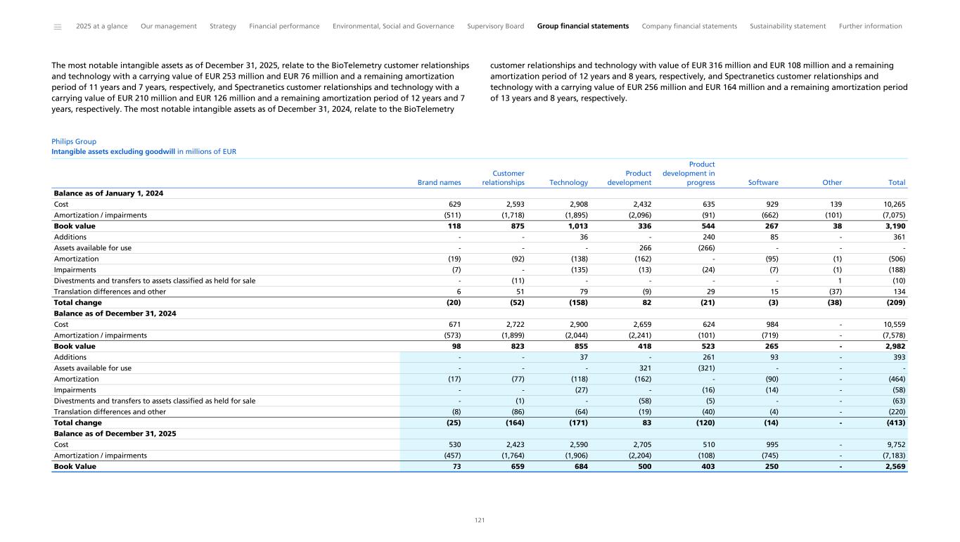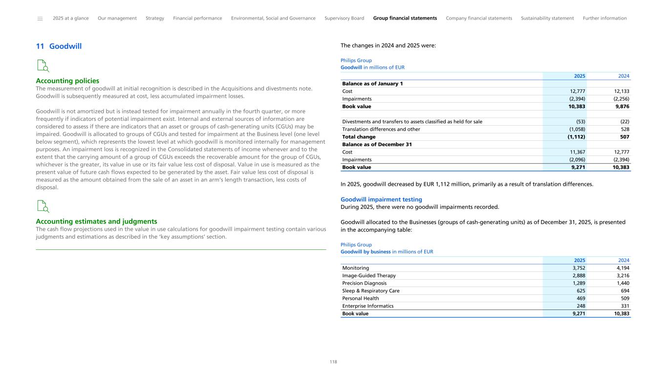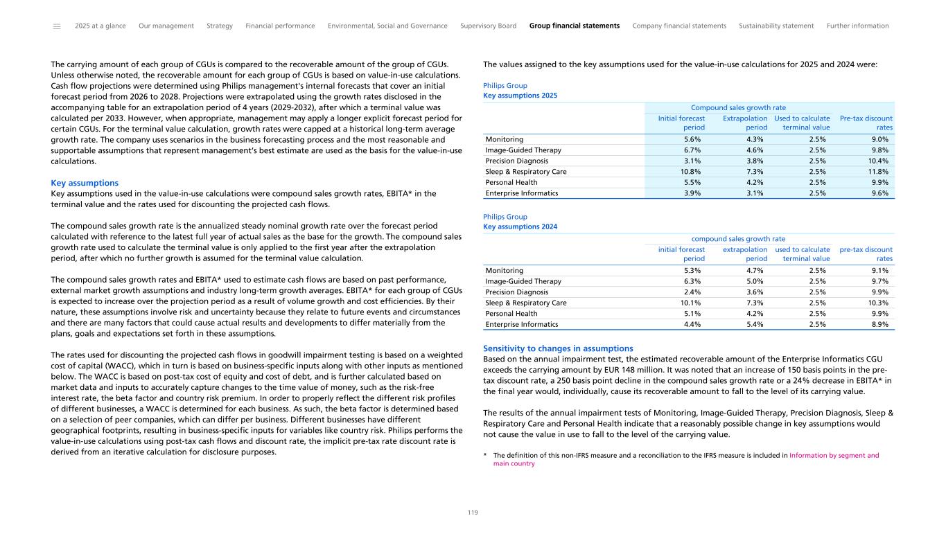 Recoverability of goodwill related to the Connected Care Segment Businesses As per IAS 36, goodwill is subject to, at least, an annual impairment test. Impairments are recognized when the carrying value is higher than the recoverable amounts. As described in Note 11, Goodwill is allocated to Businesses (groups of cash-generating units (CGU’s)). The Connected Care Segment is composed of the Monitoring, Sleep & Respiratory Care, and Enterprise Informatics CGUs. The goodwill allocated to these CGU’s is €3,752 million, €625 million and €248 million, respectively, as of December 31, 2025. Management performs an impairment test in the fourth quarter of each year, or more frequently if indicators of potential impairment exist. The carrying amount of each group of CGUs is compared to the recoverable amount of the group of CGUs. An impairment loss is recognized in the Consolidated statements of income whenever and to the extent that the carrying amount of a group of CGU’s exceeds the recoverable amount for the group of CGUs, whichever is the greater, its value-in-use or its fair value less cost of disposal. Significant assumptions used in the value-in-use calculations include compound sales growth rates, EBITA in the terminal value, and the rates used for discounting the projected cash flows. The Company defines EBITA as income from operations excluding amortization and impairment of acquired intangible assets and impairment of goodwill. Management’s assessment of the value-in-use of the Group’s CGUs included a variety of internal and external factors, which represent significant estimates and assumptions. Furthermore, changes in market conditions and the continuing challenging economic and (geo)political environments in the territories where the Company operates, inherently lead to estimation uncertainty. The principal considerations for our determination that performing procedures relating to the goodwill impairment assessments - Connected Care Segment Businesses is a key audit matter are (i) the significant judgment by management when developing the fair value estimate of the CGU’s; (ii) a high degree of auditor judgment, subjectivity, and effort in performing procedures and evaluating management’s significant assumptions related to the compound sales growth rates, EBITA in the terminal value and the rates used for discounting the projected cash flows; and (iii) the audit effort involved the use of professionals with specialized skill and knowledge. We obtained an understanding, evaluated the design and tested the operating effectiveness of the Company's controls related to management’s goodwill impairment assessments for the Connected Care Segment CGUs. We performed our audit procedures in a mix of controls and substantive procedures. We compared the current year actual results with the 2025 figures included in the prior year forecast to consider whether any forecast included assumptions that, with hindsight, had been too optimistic. We have performed audit procedures related to the goodwill impairment tests, including the value-in-use calculations, prepared by management for the Connected Care Segment CGUs. These procedures also included, among others, (i) testing management’s process for developing the fair value estimate of the Connected Care Segment CGU’s; (ii) evaluating the appropriateness of the value-in-use approach used by management; (iii) testing the completeness and accuracy of underlying data used in the value-in-use approach; (iv) and evaluating the reasonableness of the significant assumptions used by management; compound sales growth rates, EBITA in the terminal value, and the rates used for discounting the projected cash flows. Evaluating management’s significant assumptions related to the compound sales growth rates, and EBITA in the terminal value involved evaluating whether the assumptions used by management were reasonable considering (i) the current and past performance of the Connected Care Segment CGU’s; (ii) the consistency with external market and industry data; and (iii) whether the assumption was consistent with evidence obtained in other areas of the audit. Professionals with specialized skill and knowledge were used to assist in evaluating i) the appropriateness of the value-in-use model and ii) reasonableness of significant assumptions: compound sales growth rates, EBITA in the terminal value, and the rates used for discounting the projected cash flows. In relation to the rates used for discounting of projected cash flows, we assessed the cost of capital for the Company and comparable organizations within the industry, as well as considering territory and CGU specific factors. We evaluated the adequacy of management’s sensitivity calculations for all CGUs. For all CGUs, we calculated the degree to which these assumptions would need to move to trigger an impairment. Finally, we evaluated the sufficiency of the related disclosures and found them to be an appropriate reflection of the assumptions, estimation uncertainty and the related sensitivities, and in line with the requirements of the accounting framework. ______ 2025 at a glance Our management Strategy Financial performance Environmental, Social and Governance Supervisory Board Group financial statements Company financial statements Sustainability statement Further information 263