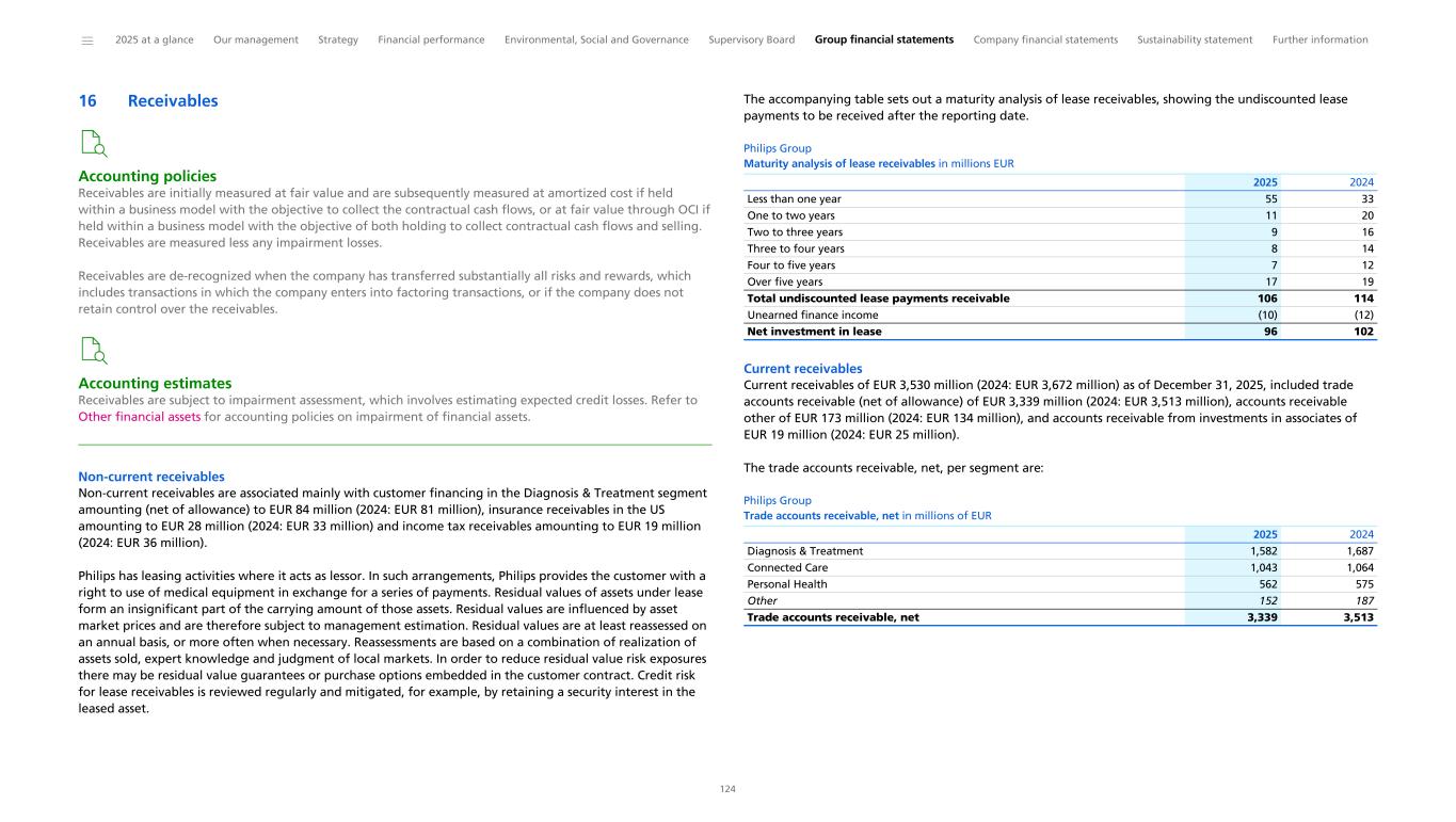 IFRS 18 is effective for reporting periods beginning on or after January 1, 2027. Retrospective application is required; therefore, upon adoption, comparative information will be restated in accordance with IFRS 18. The company is currently assessing the implications of applying the new standard. Changes in presentation from the prior year Accounting policies have been applied consistently for all periods presented in these consolidated financial statements. Certain prior-year amounts have been reclassified to conform to the current year presentation due to combining insignificant balances and immaterial organizational changes. In 2025, uncertain tax liabilities were reclassified from non-current tax liabilities to current income tax liabilities, and non-current derivative financial assets were combined into other non-current financial assets. 2 Information by segment and main country Accounting policies Segment accounting policies are the same as the accounting policies applied by the company. Operating segments are components of the company’s business activities for which separate financial information is available that is evaluated regularly by the Chief Operating Decision-Maker (the Board of Management of the company). The Board of Management decides how to allocate resources and assesses performance. Reportable segments comprise the operating segments Diagnosis & Treatment, Connected Care and Personal Health. Besides these reportable segments, segment Other comprises Philips’ central Innovation & Design, IP royalty activities, corporate central costs, and other minor items not allocated to the operating segments. Accounting estimates and judgments Determining reportable segments requires significant judgment and involves evaluating the information that is reviewed by the Chief Operating Decision-Maker (the Board of Management) to assess performance and allocate resources, in accordance with IFRS 8 'Operating Segments'. The Philips reportable segments are Diagnosis & Treatment, Connected Care and Personal Health, each being responsible for the management of its Businesses worldwide. Philips focuses on improving people’s lives through meaningful innovation. The Diagnosis & Treatment segment unites the Businesses related to the goal of precision diagnosis and disease pathway selection, and the Businesses related to image-guided, minimally invasive treatment. The Connected Care segment focuses on patient care solutions, advanced informatics and analytics, and patient and workflow optimization inside and outside the hospital, and aims to unlock synergies from integrating and optimizing patient care pathways, and leveraging provider-payer-patient business models. The Personal Health segment focuses on healthy living and preventative care. Transactions between the segments are mainly related to components and parts included in the product portfolio of the other segments. The pricing of such transactions was at cost or determined on an arm’s length basis. Philips has no single external customer that represents 10% or more of sales. Sales by country is presented based on the country of seller. Philips Group Information on income statements in millions of EUR 2025 Diagnosis & Treatment 8,531 8,986 (265) 998 Connected Care 5,076 5,100 (404) 544 Personal Health 3,673 3,765 (112) 662 Other 554 703 (344) (9) Inter-segment eliminations (720) Philips Group 17,834 17,834 (1,125) 2,195 2024 Diagnosis & Treatment 8,790 9,269 (464) 1,018 Connected Care 5,134 5,163 (403) 494 Personal Health 3,486 3,566 (117) 584 Other 611 750 (406) (18) Inter-segment eliminations (726) Philips Group 18,021 18,021 (1,390) 2,077 2023 Diagnosis & Treatment 8,825 9,269 (306) 1,028 Connected Care 5,138 5,149 (445) 369 Personal Health 3,602 3,685 (115) 597 Other 604 413 (394) (73) Inter-segment eliminations (346) Philips Group 18,169 18,169 (1,261) 1,921 Sales Sales including intercompany Depreciation and amortization ¹ Adjusted EBITA 1 Includes impairments (excluding goodwill impairment); for impairment values please refer to Property, plant and equipment and Intangible assets excluding goodwill ______ 2025 at a glance Our management Strategy Financial performance Environmental, Social and Governance Supervisory Board Group financial statements Company financial statements Sustainability statement Further information 98