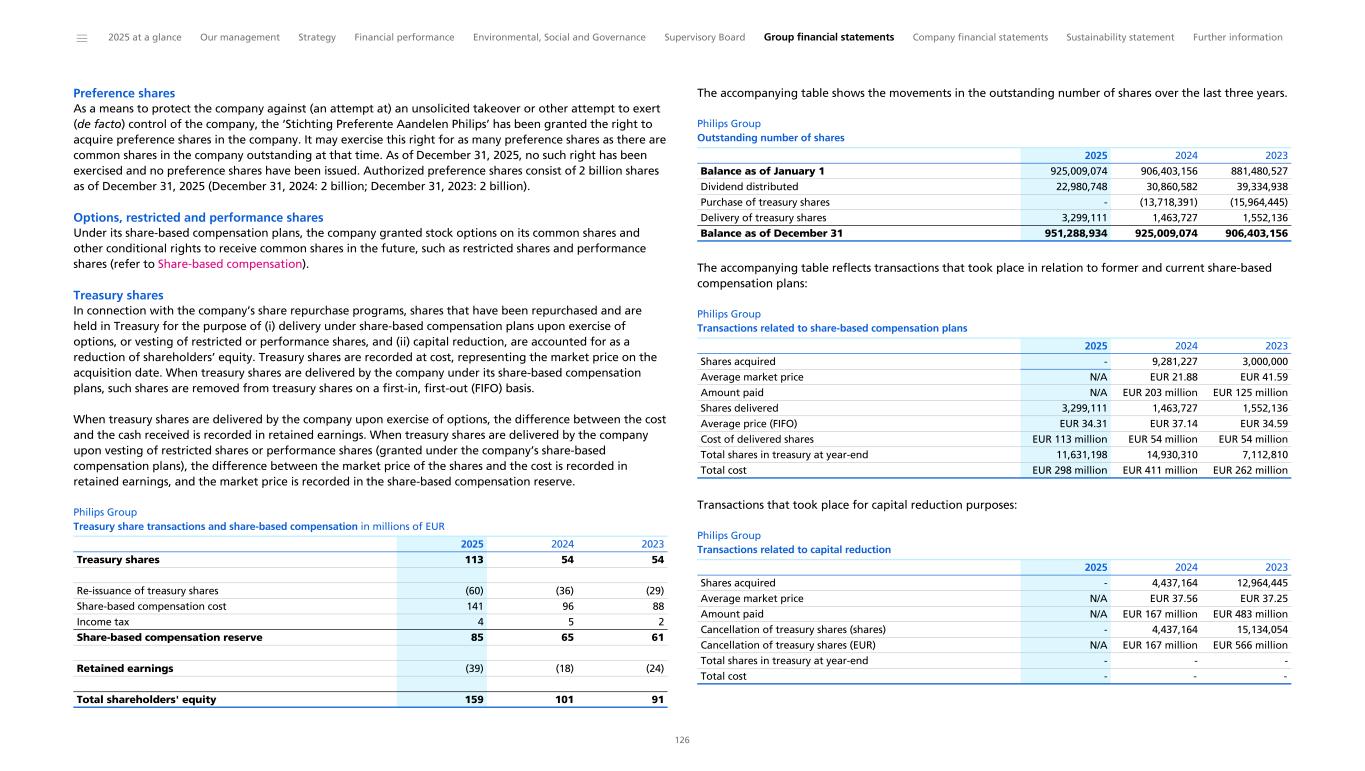 Share repurchase methods for Long-Term Incentive plans and capital reduction purposes Historically, Philips uses different methods to repurchase shares in its own capital: (i) share buyback repurchases in the open market via an intermediary; (ii) repurchase of shares via forward contracts for future delivery of shares; and (iii) the unwinding of call options on own shares. The open market transactions via an intermediary allow for buybacks during both open and closed periods. For more information on share repurchase transactions entered into 2023, 2024, and 2025, refer to Equity. Philips Group Impact of share acquisitions and cancellations on share count in thousands of shares as of December 31 Shares issued 962,920 939,939 913,516 889,315 883,899 Shares in treasury 11,631 14,930 7,113 7,835 13,717 Shares outstanding 951,289 925,009 906,403 881,481 870,182 Shares acquired - 13,718 15,964 5,081 45,486 Shares cancelled - 4,437 15,134 8,758 33,500 2025 2024 2023 2022 2021 ______ 2025 at a glance Our management Strategy Financial performance Environmental, Social and Governance Supervisory Board Group financial statements Company financial statements Sustainability statement Further information 34