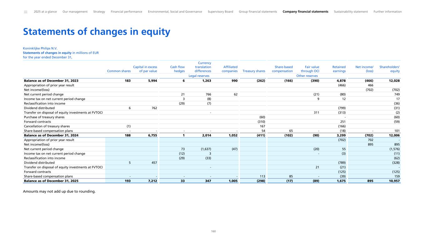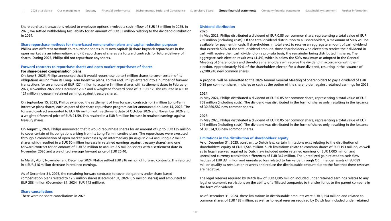 Consolidated statements of changes in equity Philips Group Consolidated statements of changes in equity in millions of EUR for the year ended December 31, Balance as of January 1, 2023 178 5,253 (2) 1,866 (275) (228) (376) 6,832 13,249 34 13,283 Net income - - - - - - - (466) (466) 2 (463) Other comprehensive income (loss) - - 8 (604) - - (17) (23) (635) (1) (637) Total comprehensive income (loss) - - 8 (604) - - (17) (488) (1,101) 1 (1,100) Dividend distributed 8 741 - - - - - (816) (68) (3) (70) Transfer on disposal of equity investments at FVTOCI - - - - - - 4 (4) - - - Forward contracts - - - - (608) - - 465 (143) - (143) Cancellation of treasury shares (3) - - - 566 - - (563) - - - Share-based compensation plans - - - - 54 61 - (24) 91 - 91 Balance as of December 31, 2023 183 5,994 6 1,263 (262) (166) (390) 5,402 12,028 33 12,061 Net income - - - - - - - (702) (702) 3 (698) Other comprehensive income (loss) - - (5) 751 - - (11) (6) 729 2 731 Total comprehensive income (loss) - - (5) 751 - - (11) (707) 27 6 33 Dividend distributed 6 762 - - - - - (799) (31) (2) (32) Transfer on disposal of equity investments at FVTOCI - - - - - - 311 (313) (2) - (2) Purchase of treasury shares - - - - (60) - - - (60) - (60) Forward contracts - - - - (310) - - 251 (59) - (59) Cancellation of treasury shares (1) - - - 167 - - (166) - - - Share-based compensation plans - - - - 54 65 - (18) 101 - 101 Balance as of December 31, 2024 188 6,755 1 2,014 (411) (102) (90) 3,650 12,006 37 12,043 Net income - - - - - - - 895 895 1 897 Other comprehensive income (loss) - - 32 (1,667) - - (19) 4 (1,649) (4) (1,653) Total comprehensive income (loss) - - 32 (1,667) - - (19) 900 (754) (2) (757) Dividend distributed 5 457 - - - - - (789) (328) (2) (330) Transfer on disposal of equity investments at FVTOCI - - - - - - 21 (21) - - - Forward contracts - - - - - - - (125) (125) - (125) Share-based compensation plans - - - - 113 85 - (39) 159 - 159 Balance as of December 31, 2025 193 7,212 33 347 (298) (17) (89) 3,575 10,957 32 10,990 Common shares Capital in excess of par value Cash flow hedges Currency translation differences Treasury shares Share-based compensation Fair value through OCI Retained earnings Total shareholders' equity Non-controlling interests Group equity Reserves ______ 2025 at a glance Our management Strategy Financial performance Environmental, Social and Governance Supervisory Board Group financial statements Company financial statements Sustainability statement Further information 95