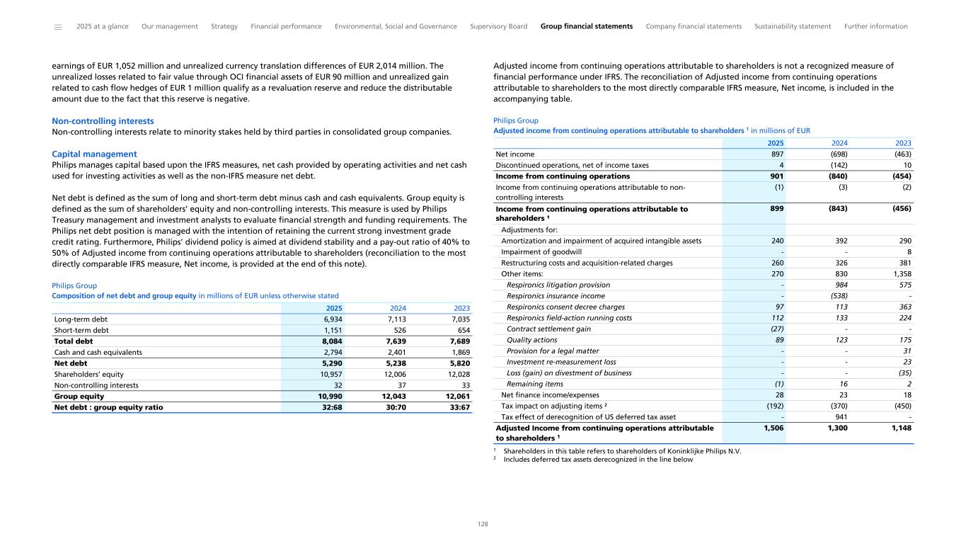 Adjusted income from continuing operations attributable to shareholders The term Adjusted income from continuing operations attributable to shareholders represents income from continuing operations less continuing operations attributable to non-controlling interests; amortization and impairment of acquired intangible assets; impairment of goodwill, excluding gains or losses from restructuring costs and acquisition-related charges; and other items, as well as adjustments to net finance expenses, adjustments to results of associates and adjustments to tax expense. ‘Shareholders’ refers to shareholders of Koninklijke Philips N.V. Restructuring costs, acquisition-related charges and other items are all defined in the previous sections about EBITA and Adjusted EBITA. Net finance expenses are defined as either the financial income or expense component of an individual item already identified to be excluded as part of the Adjusted income from continuing operations, fair value movements of equity investments in limited life funds recognized at fair value through profit or loss or a financial income, or expense component with an income statement impact (gain or loss) that is deemed by management to be both significant and incidental to normal business activity. The adjustments to tax expense include the tax impact on adjustments to income from continuing operations, as well as tax-only adjusting items (such as the derecognition of deferred tax assets). Philips considers the use of Adjusted income from continuing operations attributable to shareholders appropriate as Philips uses it as the basis for the Adjusted income from continuing operations attributable to shareholders per common share (in EUR) - diluted, a non-IFRS measure. Adjusted income from continuing operations attributable to shareholders may be subject to limitations as an analytical tool for investors, as it excludes certain items and therefore does not reflect the expense associated with such items, which may be significant and have a significant effect on Philips’ net income. Net income for the years indicated is included in the accompanying table. Adjusted income from continuing operations attributable to shareholders is not a recognized measure of financial performance under IFRS. The reconciliation of Adjusted income from continuing operations attributable to shareholders to the most directly comparable IFRS measure, Net income for the years indicated, is included in the accompanying table. Adjusted income from continuing operations attributable to shareholders per common share (in EUR) - diluted (Adjusted EPS) Adjusted income from continuing operations attributable to shareholders per common share (in EUR) - diluted is calculated by dividing the Adjusted income from continuing operations attributable to shareholders by the diluted weighted average number of shares (after deduction of treasury shares) outstanding during the period, as defined in General information to the Consolidated financial statements, Earnings per share section. Philips considers the use of Adjusted income from continuing operations attributable to shareholders per common share (in EUR) - diluted appropriate as it is a measure that is useful when comparing its performance to other companies in the health tech industry. However, it may be subject to limitations as an analytical tool for investors, as it uses Adjusted income from continuing operations attributable to shareholders, which has certain items excluded. Adjusted income from continuing operations attributable to shareholders per common share (in EUR) - diluted is not a recognized measure of financial performance under IFRS. The most directly comparable IFRS measure, income from continuing operations attributable to shareholders per common share (in EUR) - diluted for the years indicated, is included in the following table. Philips Group Adjusted income from continuing operations attributable to shareholders1 in millions of EUR unless otherwise stated Net income 897 (698) (463) Discontinued operations, net of income taxes 4 (142) 10 Income from continuing operations 901 (840) (454) Income from continuing operations attributable to non-controlling interests (1) (3) (2) Income from continuing operations attributable to shareholders ¹ 899 (843) (456) Adjustments for: Amortization and impairment of acquired intangible assets 240 392 290 Impairment of goodwill - - 8 Restructuring costs and acquisition-related charges 260 326 381 Other items: 270 830 1,358 Respironics litigation provision - 984 575 Respironics insurance income - (538) - Respironics consent decree charges 97 113 363 Respironics field-action running costs 112 133 224 Quality actions 89 123 175 Contract settlement gain (27) - - Provision for a legal matter - - 31 Investment re-measurement loss - - 23 Loss (gain) on divestment of business - - (35) Remaining items (1) 16 2 Net finance income/expenses 28 23 18 Tax impact on adjusting items ² (192) (370) (450) Tax effect of derecognition of US deferred tax asset - 941 - Adjusted Income from continuing operations attributable to shareholders 1 1,506 1,300 1,148 Earnings per common share: Income from continuing operations attributable to shareholders¹ per common share (in EUR) - diluted 0.93 (0.88) (0.47) Adjusted income from continuing operations attributable to shareholders¹ per common share (in EUR) - diluted 1.56 1.36 1.19 2025 2024 2023 1 Shareholders refers to shareholders of Koninklijke Philips N.V. Includes the effect of the share dividend with respect to 2024 for 2024 and 2023, respectively. 2 Includes deferred tax assets derecognized in the line below. ______ 2025 at a glance Our management Strategy Financial performance Environmental, Social and Governance Supervisory Board Group financial statements Company financial statements Sustainability statement Further information 296