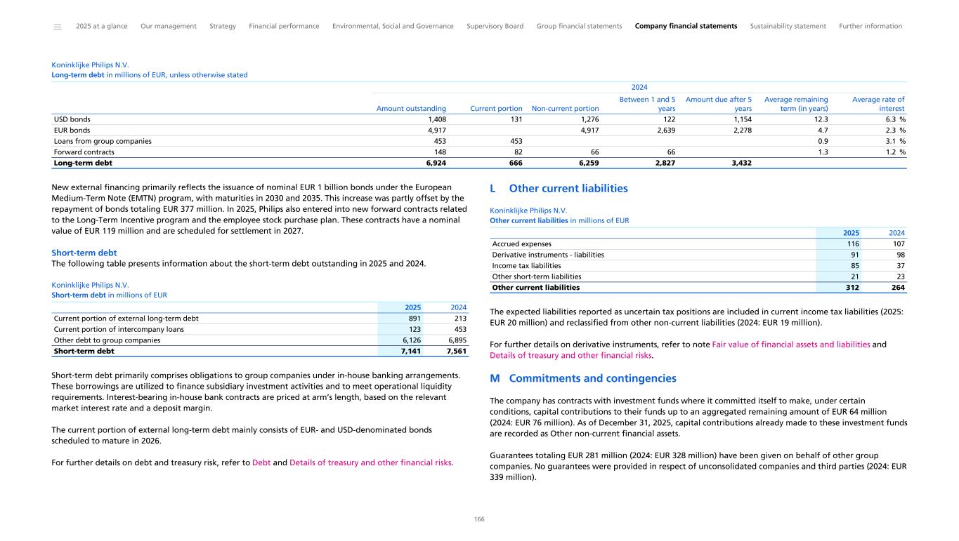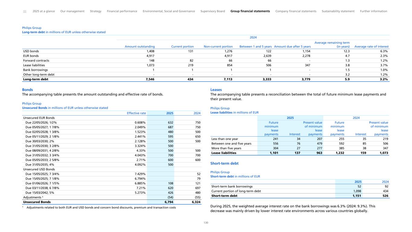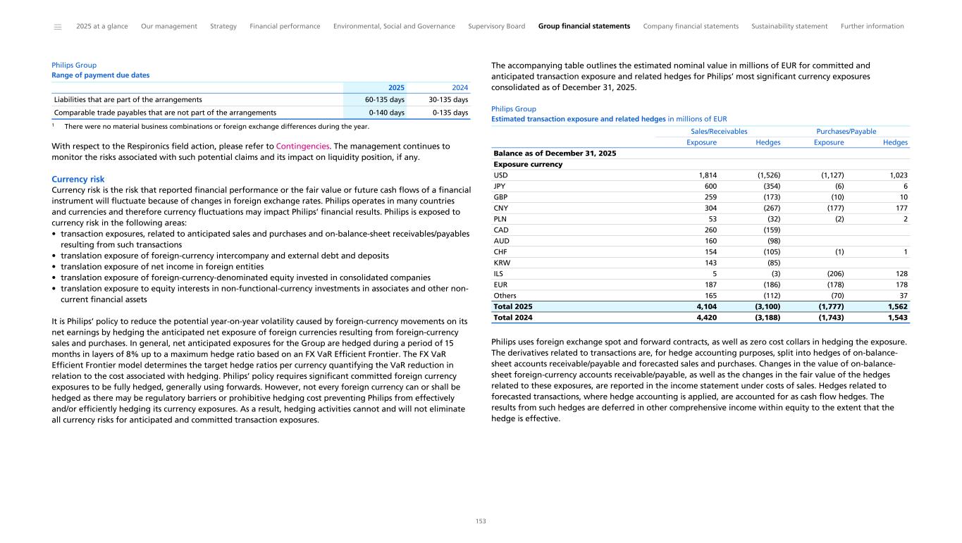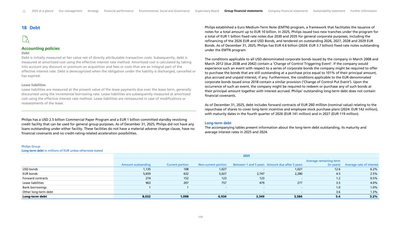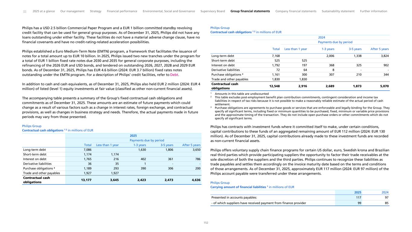 Philips established a Euro Medium Term Note (EMTN) program, which facilitates the issuance of notes for a total amount of up to EUR 10 billion. In 2025, Philips issued two new tranches under the program for a total of EUR 1 billion fixed rate notes due 2030 and 2035 for general corporate purposes, including the repayment of USD and EUR bond maturities in 2026. As of December 31, 2025, the principal amount of notes outstanding under the EMTN program was EUR 4.5 billion. The company’s liquidity risk management procedures have not changed during 2025. The access to existing lines of credit remains intact. These lines of credit, along with other financial risks to which Philips is exposed, are disclosed in Details of treasury and other financial risks. Further, with respect to potential claims related to the Respironics recall, please refer to Contingencies. Management continues to monitor the risks associated with such potential claims and their impact on liquidity position, if any. Philips’ existing long-term debt is rated BBB+ (with stable outlook) by Fitch, Baa1 (with stable outlook) by Moody’s, and BBB+ (with stable outlook) by Standard & Poor’s. As part of our capital allocation policy, our net debt position is managed with the intention of retaining our strong investment grade credit rating. Ratings are subject to change at any time and there is no assurance that Philips will be able to achieve this goal. Philips’ aim when managing the net debt position is dividend stability and a pay-out ratio of 40% to 50% of adjusted income from continuing operations attributable to shareholders. Philips’ outstanding long-term debt and credit facilities do not contain financial covenants. Adverse changes in the company’s ratings will not trigger automatic withdrawal of committed credit facilities or any acceleration in the outstanding long-term debt (provided that the USD-denominated bonds issued by Philips in March 2008 and 2012 contain a ‘Change of Control Triggering Event’ and the EUR-denominated bonds contain a ‘Change of Control Put Event’). A description of Philips’ credit facilities can be found in Debt. Philips Group Credit rating summary Fitch BBB+ Stable Moody’s Baa1 P-2 Stable Standard & Poor’s BBB+ A-2 Stable Long-term Short-term Outlook Philips pools cash from subsidiaries to the extent legally and economically feasible. Cash not pooled remains available for local operational needs or general purposes. We face cross-border foreign exchange controls and/or other legal restrictions in a few countries, which could limit our ability to make these balances available on short notice for general use by the group. Philips believes its current liquidity and direct access to capital markets is sufficient to meet our present financing needs. Cash obligations Contractual cash obligations The following table presents a summary of the Group’s fixed contractual cash obligations and commitments as of December 31, 2025. These amounts are an estimate of future payments, which could change as a result of various factors, such as a change in interest rates, foreign exchange, and contractual provisions, as well as changes in our business strategy and needs. Therefore, the actual payments made in future periods may differ from those presented in the accompanying table. Philips Group Contractual cash obligations 1 2 in millions of EUR Total Less than 1 year 1-3 years 3-5 years After 5 years Long-term debt 7,086 1,630 1,806 3,650 Short-term debt 1,174 1,174 Interest on debt 1,765 216 402 361 786 Derivative liabilities 36 35 1 - - Purchase obligations ³ 1,189 293 390 306 200 Trade and other payables 1,927 1,927 Contractual cash obligations 13,177 3,645 2,423 2,473 4,636 2025 Payments due by period 1 Amounts in this table are undiscounted 2 This table excludes post-employment benefit plan contribution commitments, contingent consideration and income tax liabilities with respect to tax risks because it is not possible to make a reasonably reliable estimate of the actual period of cash settlement. 3 Purchase obligations are agreements to purchase goods or services that are enforceable and legally binding for the Group. They specify all significant terms, including fixed or minimum quantities to be purchased, fixed, minimum or variable price provisions and the approximate timing of the transaction. They do not include open purchase orders or other commitments which do not specify all significant terms. Debt includes forward contracts of EUR 260 million (nominal value) relating to the repurchase of shares to cover long-term incentive and employee stock purchase plans. In 2025, Philips extended the maturity of EUR 76 million relating to the repurchase of up to 4 million shares for long-term incentive from the third-quarter of 2025 to the third quarter of 2026, and entered into a forward contract for EUR 119 million that matures in 2027 relating to the repurchase of up to 6 million shares for long-term incentive and employee stock purchase plans. Philips offers voluntary supply chain finance programs with third parties, which provide participating suppliers with the opportunity to factor their trade receivables at the sole discretion of both the suppliers and the third parties. Philips continues to recognize these liabilities as trade payables and settles them accordingly on the invoice maturity date based on the terms and conditions of these arrangements. As of December 31, 2025, approximately EUR 117 million (2024: EUR 97 million) of the Philips accounts payable were transferred under these arrangements. ______ 2025 at a glance Our management Strategy Financial performance Environmental, Social and Governance Supervisory Board Group financial statements Company financial statements Sustainability statement Further information 36