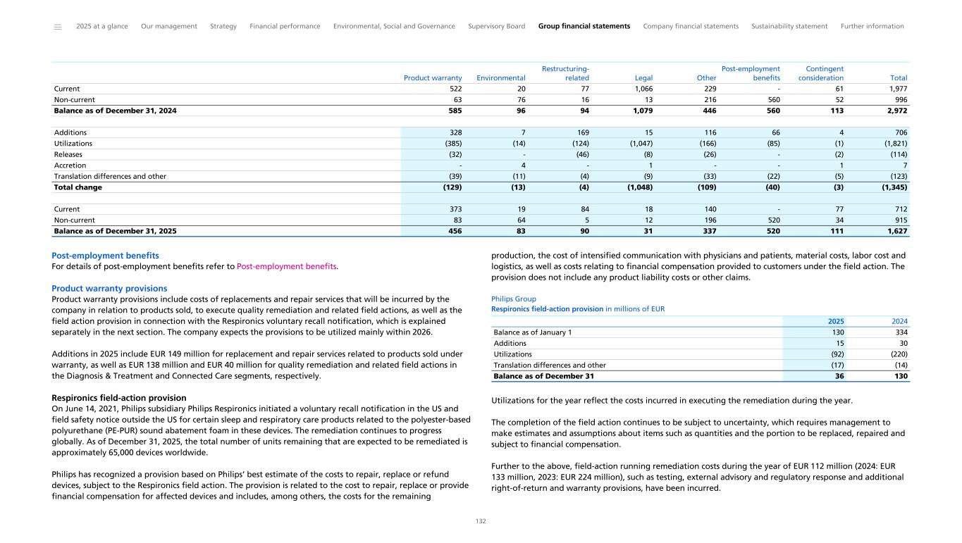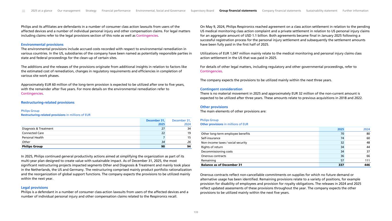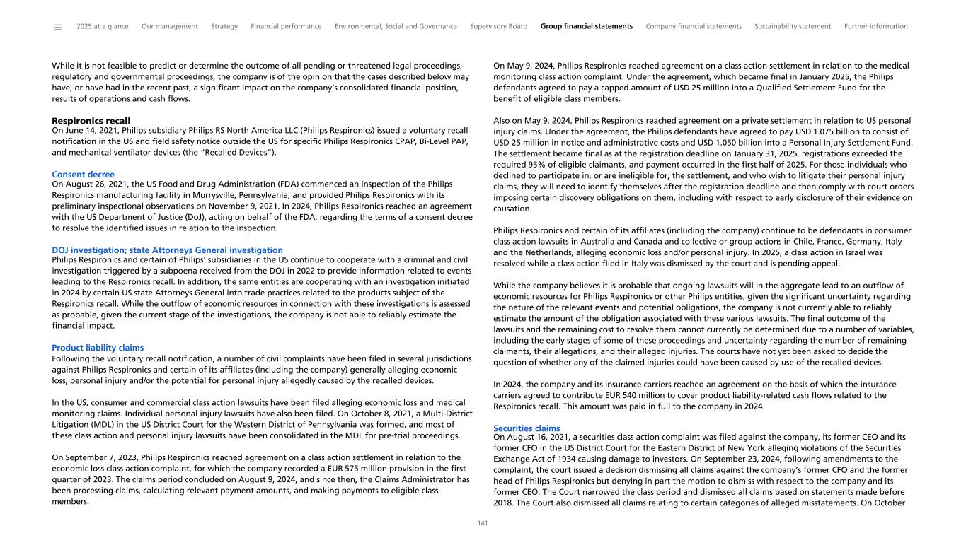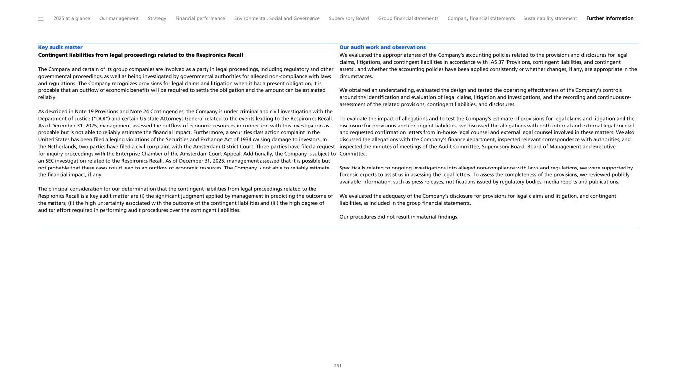 Key audit matter Our audit work and observations Contingent liabilities from legal proceedings related to the Respironics Recall The Company and certain of its group companies are involved as a party in legal proceedings, including regulatory and other governmental proceedings, as well as being investigated by governmental authorities for alleged non-compliance with laws and regulations. The Company recognizes provisions for legal claims and litigation when it has a present obligation, it is probable that an outflow of economic benefits will be required to settle the obligation and the amount can be estimated reliably. As described in Note 19 Provisions and Note 24 Contingencies, the Company is under criminal and civil investigation with the Department of Justice ("DOJ") and certain US state Attorneys General related to the events leading to the Respironics Recall. As of December 31, 2025, management assessed the outflow of economic resources in connection with this investigation as probable but is not able to reliably estimate the financial impact. Furthermore, a securities class action complaint in the United States has been filed alleging violations of the Securities and Exchange Act of 1934 causing damage to investors. In the Netherlands, two parties have filed a civil complaint with the Amsterdam District Court. Three parties have filed a request for inquiry proceedings with the Enterprise Chamber of the Amsterdam Court Appeal. Additionally, the Company is subject to an SEC investigation related to the Respironics Recall. As of December 31, 2025, management assessed that it is possible but not probable that these cases could lead to an outflow of economic resources. The Company is not able to reliably estimate the financial impact, if any. The principal consideration for our determination that the contingent liabilities from legal proceedings related to the Respironics Recall is a key audit matter are (i) the significant judgment applied by management in predicting the outcome of the matters; (ii) the high uncertainty associated with the outcome of the contingent liabilities and (iii) the high degree of auditor effort required in performing audit procedures over the contingent liabilities. We evaluated the appropriateness of the Company's accounting policies related to the provisions and disclosures for legal claims, litigations, and contingent liabilities in accordance with IAS 37 'Provisions, contingent liabilities, and contingent assets', and whether the accounting policies have been applied consistently or whether changes, if any, are appropriate in the circumstances. We obtained an understanding, evaluated the design and tested the operating effectiveness of the Company's controls around the identification and evaluation of legal claims, litigation and investigations, and the recording and continuous re- assessment of the related provisions, contingent liabilities, and disclosures. To evaluate the impact of allegations and to test the Company's estimate of provisions for legal claims and litigation and the disclosure for provisions and contingent liabilities, we discussed the allegations with both internal and external legal counsel and requested confirmation letters from in-house legal counsel and external legal counsel involved in these matters. We also discussed the allegations with the Company's finance department, inspected relevant correspondence with authorities, and inspected the minutes of meetings of the Audit Committee, Supervisory Board, Board of Management and Executive Committee. Specifically related to ongoing investigations into alleged non-compliance with laws and regulations, we were supported by forensic experts to assist us in assessing the legal letters. To assess the completeness of the provisions, we reviewed publicly available information, such as press releases, notifications issued by regulatory bodies, media reports and publications. We evaluated the adequacy of the Company's disclosure for provisions for legal claims and litigation, and contingent liabilities, as included in the group financial statements. Our procedures did not result in material findings. ______ 2025 at a glance Our management Strategy Financial performance Environmental, Social and Governance Supervisory Board Group financial statements Company financial statements Sustainability statement Further information 261