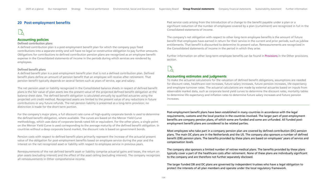 Contents 2025 at a glance: key figures 4 Our management 7 Message from the CEO 8 Members of the Board of Management and Executive Committee 10 Strategy 12 Strategic focus 13 Business 15 Financial performance 25 Performance summary 26 Results of operations 29 Financial position 33 Cash flow and liquidity 35 Environmental, Social and Governance 38 Environmental 42 Social 48 Governance 53 Supervisory Board 63 Letter from the Chairman of the Supervisory Board 64 Members of the Supervisory Board 65 Supervisory Board report 67 Remuneration Report 2025 75 Group financial statements 91 Consolidated statements of income 92 Consolidated statements of comprehensive income 92 Consolidated balance sheets 93 Consolidated statements of cash flows 94 Consolidated statements of changes in equity 95 Notes to the Consolidated financial statements 96 Company financial statements 157 Statements of income 158 Balance sheets before appropriation of results 159 Statements of changes in equity 160 Notes to the Company financial statements 161 Sustainability statement 168 Tracking our ESG program 169 General basis for preparation 172 Double Materiality Assessment 175 Environmental information 187 Social information 216 Governance information 236 ESRS cross-reference table 242 Further information 251 References to the content of this Annual Report 252 Management’s statements and report 253 Independent auditor’s reports 255 Corporate governance report 270 Risk factors and responses 278 How we create value 289 Appropriation of profits 290 Reconciliation of non-IFRS information 291 Other key performance indicators 299 Forward-looking statements and other information 300 Investor information 301 Definitions and abbreviations 303 ______ 2025 at a glance Our management Strategy Financial performance Environmental, Social and Governance Supervisory Board Group financial statements Company financial statements Sustainability statement Further information 3