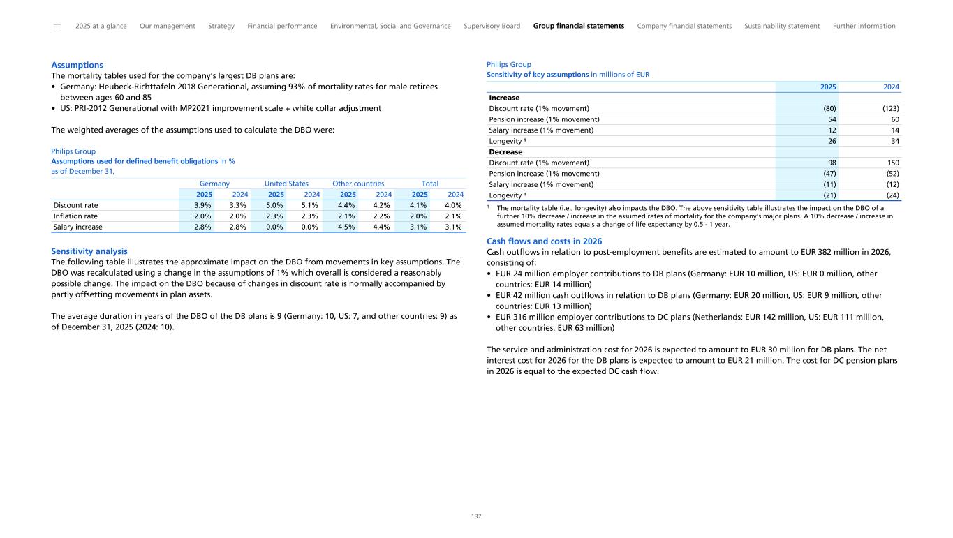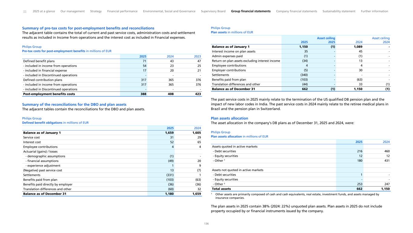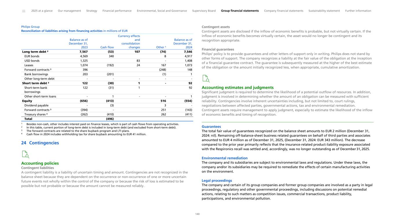 Other cash commitments Philips and our subsidiaries sponsor post-employment benefit plans in many countries in accordance with legal requirements, customs, and the local situation in the countries involved. For a discussion of the plans and expected cash outflows, please refer to Post-employment benefits. We had various provisions by the end of 2025 that are expected to result in cash outflows in 2026. Refer to Provisions. Philips has contracts with investment funds in which we committed to make, under certain conditions, capital contributions to these funds of an aggregated remaining amount of EUR 112 million (2024: EUR 130 million). Capital contributions already made to these investment funds are recorded as non-current financial assets. Please refer to Dividend for information on the proposed dividend distribution. Please refer to Equity for information on other long-term incentive and employee stock purchase plans. Guarantees Business-related guarantees on behalf of third parties and associates amount to EUR 4 million as of December 31, 2025 (December 31, 2024: EUR 343 million), and are not recorded on the balance sheet. The decrease compared to the prior year primarily reflects that the insurance-related product-liability exposure associated with the Respironics recall was settled and, accordingly, was no longer outstanding as of December 31, 2025. Dividend Dividend policy Philips’ dividend policy is aimed at dividend stability and a pay-out ratio of 40% to 50% of adjusted income from continuing operations attributable to shareholders*. Proposed distribution A proposal will be submitted to the Annual General Meeting of Shareholders, to be held on May 8, 2026, to declare a distribution of EUR 0.85 per common share, in shares or cash at the option of the shareholder, against the net income for 2025. If the above dividend proposal is adopted, the shares will be traded ex- dividend at the Euronext Amsterdam as of May 12, 2026, and at the New York Stock Exchange as of May 13, 2026. In compliance with the listing requirements of Euronext Amsterdam and the New York Stock Exchange, the dividend record date will be May 13, 2026. Shareholders will be given the opportunity to make their choice between shares and cash between May 14 and May 28, 2026, for shares traded at the New York Stock Exchange, and between May 14 and May 29, 2026, for shares traded at Euronext Amsterdam. If no choice is made during this election period, the dividend will be distributed in shares. The number of share dividend rights entitled to one new common share will be determined based on the volume weighted average price of all traded common shares of Koninklijke Philips N.V. at Euronext Amsterdam on May 27, 28 and 29, 2026. The company will calculate the number of share dividend rights entitled to one new common share (the ratio), such that the gross dividend in shares will be approximately equal to EUR 0.85. The ratio and the number of shares to be issued will be announced on June 2, 2026. Delivery of new common shares and payment of the dividend, with settlement of fractions in cash, if required, will take place from June 3, 2026. Euronext Amsterdam May 12, 2026 May 13, 2026 June 3, 2026 New York Stock Exchange May 13, 2026 May 13, 2026 June 3, 2026 Ex-dividend date Record date Distribution from Further details will be given in the agenda with explanatory notes for the 2026 Annual General Meeting of Shareholders. The proposed distribution and all dates mentioned remain provisional until then. Dividend in shares is subject to 15% dividend withholding tax, but only with respect to the par value of the shares (EUR 0.20 per share). Dividend in cash is in principle subject to 15% Dutch dividend withholding tax, which will be deducted from the dividend in cash paid to the shareholders. Shareholders are advised to consult their tax advisor on the applicable situation with respect to taxes on the dividend received. Dividends and distributions per common share The following table sets forth in euros the gross dividends on the common shares in the fiscal years indicated (from prior-year profit distribution) and such amounts as converted into US dollars and paid to holders of shares of the New York Registry: Philips Group Gross dividends on the common shares (per share) in EUR 0.85 0.85 0.85 0.85 0.85 in USD 0.97 0.92 0.93 0.90 1.03 2025 ¹ 2024 ¹ 2023 ² 2022 ² 2021 ¹ 1 In cash or shares at the election of shareholder 2 In shares only * Non-IFRS financial measure. For the definition and reconciliation of the most directly comparable IFRS measure, refer to Reconciliation of non-IFRS information. ______ 2025 at a glance Our management Strategy Financial performance Environmental, Social and Governance Supervisory Board Group financial statements Company financial statements Sustainability statement Further information 37