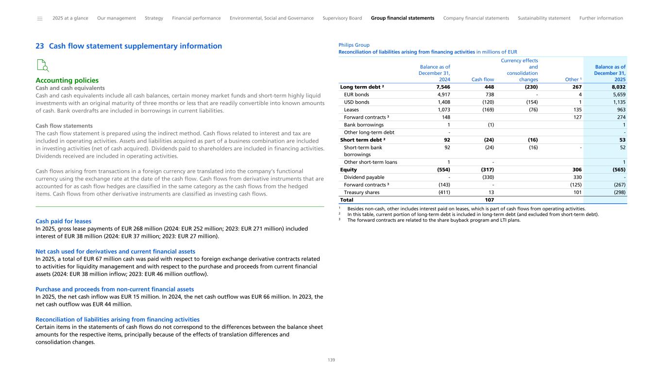 Cash flow and liquidity Cash flows The movements in cash and cash equivalents for the years ended December 31, 2025 and 2024 are presented and explained as follows. Philips Group Condensed consolidated cash flows in millions of EUR Beginning cash and cash equivalents balance 2,401 1,869 Net cash flows from operating activities 1,172 1,569 Net cash flows from investing activities Net capital expenditures (660) (663) Other cash flows from investing activities (77) 90 Net cash flows from financing activities Treasury shares transactions 13 (410) Changes in debt 424 (83) Dividend paid to shareholders of the company (328) (1) Other cash flow items (141) 43 Net cash flows from discontinued operations (10) (13) Ending cash and cash equivalents balance 2,794 2,401 2025 2024 Net cash flows from operating activities Net cash flows from operating activities amounted to an inflow of EUR 1,172 million in 2025, compared with an inflow of EUR 1,569 million in 2024. This decrease is mainly due to the cash payment of EUR 1,025 million for Respironics recall-related medical monitoring and personal injury settlements in 2025, partly offset by improved working capital. 2024 included payments in connection with the Respironics economic loss settlement in the US and Respironics insurance proceeds. Free cash flow* amounted to a cash inflow of EUR 512 million in 2025, compared with an inflow of EUR 906 million in 2024. Net cash flows from operating activities amounted to an inflow of EUR 1,569 million in 2024, compared with an inflow of EUR 2,136 million in 2023. This decrease was mainly due to the payments in connection with the Respironics economic loss settlement in the US and working capital outflows, partly offset by the Respironics insurance receipt. Free cash flow* amounted to a cash inflow of EUR 906 million in 2024, compared with an inflow of EUR 1,582 million in 2023. Net cash flows from investing activities Net cash flows from investing activities consist of net capital expenditures and other cash flows from investing activities. In 2025, other cash flows from investing activities amounted to a cash outflow of EUR 77 million, and mainly include minority investments and a cash payment with respect to foreign exchange derivative contracts. Net capital expenditures were EUR 660 million in 2025, in line with 2024. Philips plans to expand its facilities in the U.S. and invest in additional manufacturing and R&D projects over the next several years to support the company’s growth in the U.S. In 2024, other cash flows from investing activities amounted to a cash inflow of EUR 90 million, mainly due to proceeds from divested businesses and cash receipt with respect to foreign exchange derivative contracts. Net cash flows from financing activities Net cash flows from financing activities consist of treasury shares transactions, changes in debt, dividend paid and other cash flow items. In 2025, treasury shares transactions mainly included the exercise of stock options, which resulted in EUR 13 million net cash inflow. Changes in debt mainly includes the issuance of EUR 1 billion fixed-rate notes maturing in 2030 and 2035, partly offset by the repayment of existing debt and leases. In 2024, treasury shares transactions mainly included share repurchases for capital reduction purposes, as well as related withholding taxes, and share repurchases for Long-Term Incentive plans, which resulted in EUR 410 million net cash outflow. Changes in debt mainly included the new bond issuance of EUR 700 million and bond redemption of EUR 547 million, partly offset by debt repayments. Other cash flow items In 2025 and 2024, other cash flow items mainly reflect the foreign currency impact on the cash balance. Net cash flows from discontinued operations In 2025 and 2024, net cash used by discontinued operations mainly related to the tax claims of previously divested businesses. Liquidity position As of December 31, 2025, the Philips Group had access to available liquidity of EUR 3,796 million (2024: EUR 3,405 million) including cash and cash equivalents and a EUR 1 billion committed revolving credit facility, compared with gross debt of EUR 8,084 million (2024: EUR 7,639 million). Philips Group Liquidity position in millions of EUR Cash and cash equivalents 2,794 2,401 Listed equity investments at fair value ¹ 2 4 Committed revolving credit facility 1,000 1,000 Liquidity 3,796 3,405 Short-term debt (1,151) (526) Long-term debt (6,934) (7,113) Debt (8,084) (7,639) Net available liquidity resources (4,289) (4,233) 2025 2024 1 Philips held listed equity investments at fair value (level 1) in common shares of companies in various industries. Refer to Other financial assets and Fair value of financial assets and liabilities. In 2024, Philips extended the maturity of its EUR 1 billion committed revolving credit facility to 2029. The facility, undrawn in 2025, can be used for general group purposes, such as a backstop for its Commercial Paper Program. Philips’ Commercial Paper Program amounts to USD 2.5 billion, under which commercial paper can be issued up to 364 days in tenor, both in the US and in Europe, in any major freely convertible currency. As of December 31, 2025, Philips had no commercial paper outstanding. * Non-IFRS financial measure. For the definition and reconciliation of the most directly comparable IFRS measure, refer to Reconciliation of non-IFRS information. ______ 2025 at a glance Our management Strategy Financial performance Environmental, Social and Governance Supervisory Board Group financial statements Company financial statements Sustainability statement Further information 35