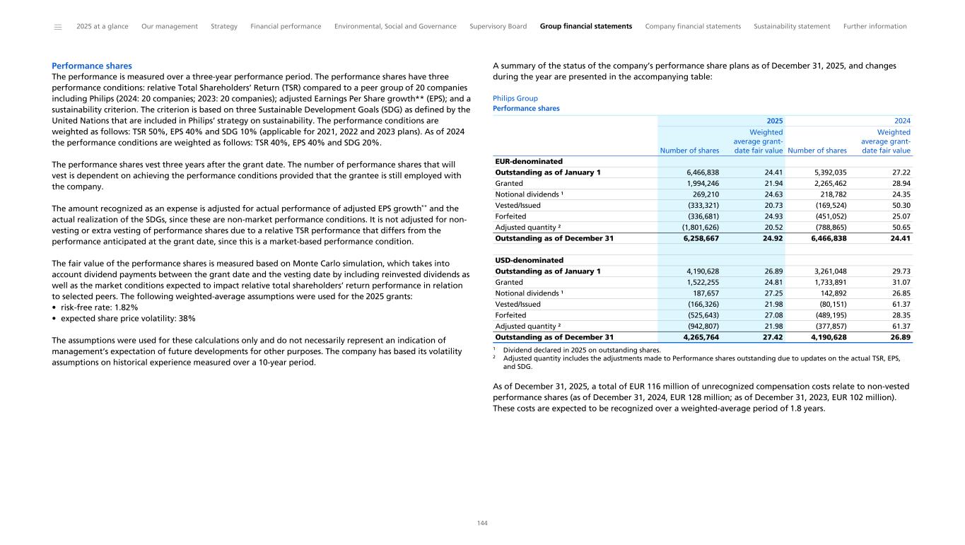 2023 Long-Term Incentive The 3-year performance period of the 2023 LTI grant, consisting of performance shares, ended on December 31, 2025. The realization of this grant is based on TSR achievement, adjusted EPS growth and sustainability objectives. The following performance achievement and vesting levels have been determined by the Supervisory Board with respect to the 2023 grant of performance shares: Philips Group Performance achievement and vesting levels TSR 200% 50% 100% EPS 200% 40% 80% Sustainability objectives 140% 10% 14% Total 194% achievement weighting vesting level TSR (50% weighting) A ranking approach to TSR applies, with Philips itself included in the TSR Performance Peer Group. TSR scores are calculated based on a local currency approach and by taking a three-month averaging period prior to the start and end of the three-year performance period. The performance incentive pay-out zone applicable to the 2023 LTI grant (based on the 2020 LTI Plan) is outlined in the following table. This results in zero vesting for performance below the 40th percentile and 200% vesting for performance levels above the 75th percentile. The incentive zone range has been constructed such that the average pay- out over time is expected to be approximately 100%. Philips Group Performance-incentive zone for TSR in % Position 20-14 13 12 11 10 9 8 7 6 5-1 Vesting % 0 60 80 90 100 120 140 160 180 200 The TSR achieved by Philips during the performance period was 93.52%, using a start date of October 2022 and end date of December 2025. This resulted in Philips being positioned at rank 2 in the TSR performance peer group shown in the following table, resulting in a TSR achievement of 200%. LTI Plan TSR realization 2023 grant: 93.52%) Boston Scientific 126.42% 1 Philips 93.52% 2 Stryker 65.33% 3 Fresenius Medical Care 60.52% 4 Canon 60.46% 5 GE HealthCare Technologies 44.57% 6 Smith & Nephew 32.54% 7 Medtronic 32.31% 8 Johnson & Johnson 25.40% 9 Terumo 22.00% 10 ResMed 19.67% 11 Reckitt Benckiser 13.51% 12 Hologic 2.60% 13 Getinge 2.16% 14 Alcon 1.09% 15 Siemens Healthineers (0.08%) 16 Danaher (3.75%) 17 Elekta (6.96%) 18 Becton Dickinson (15.10%) 19 Baxter (59.70%) 20 total return rank number Adjusted EPS growth (40% weighting) The LTI Plan EPS payouts and targets set at the beginning of the performance period were as follows: Philips Group LTI Plan EPS payouts LTI plan EPS (euro) <0.54 0.54 0.64 0.83 1.26 Vesting % -% 40% 100% 200% 200% Below threshold Threshold Target Maximum Actual In respect of the 2023 LTI grant, the LTI Plan EPS is calculated based on a reported net income attributable to shareholders divided by the number of common shares outstanding (after deduction of treasury shares) on the day prior to the beginning of the performance period (to eliminate the impact of any share buyback, stock dividend, etc.), resulting in an EPS of EUR 1.02. Furthermore, as per the 2020 LTI Plan, the LTI Plan EPS includes adjustments to account for events that were not planned when targets were set or were outside management’s control, such as the profit and loss impact of acquisitions and divestments (balance is neutral), the profit and loss impact of unhedged foreign exchange variations versus plan (positive adjustment), the profit and loss impact of legacy legal proceedings (positive impact), and the profit and loss impact of Respironics-related charges (positive impact). Overall, this resulted in an LTI Plan EPS of EUR 1.26 based on adjusted net income from continuing operations, leading to a realization of 200% of target. The historic EPS realization was 0% of target for the LTI grants related to the years 2020, 2021 and 2022. ______ 2025 at a glance Our management Strategy Financial performance Environmental, Social and Governance Supervisory Board Group financial statements Company financial statements Sustainability statement Further information 83