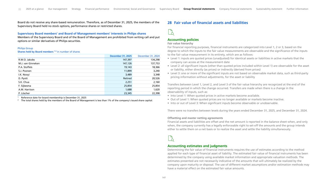 Historical LTI grants and holdings Number of performance shares (holdings) Under the LTI Plan the current members of the Board of Management were granted 222,428 performance shares in 2025. The following table provides an overview at the end of December 2025 of performance share grants. Philips Group Number of performance shares (holdings) in number of shares unless otherwise stated Roy Jakobs 4/29/2022 37,630 ² 930,000 4/29/2025 4/29/2025 42,148 - - 6,322 139,532 - 10/28/2022 24,279 314,137 10/28/2025 10/28/2027 26,233 - 1,112 4,102 101,557 - 4/28/2023 124,538 2,400,000 4/28/2026 4/28/2028 134,560 - 5,702 - - 140,261 7/5/2024 131,443 2,500,000 5/7/2027 5/7/2029 135,939 - 5,760 - - 141,700 6/5/2025 120,686 2,580,000 6/5/2028 6/5/2030 - 120,686 5,114 - - 125,800 Charlotte Hanneman 7/29/2024 25,346 613,934 7/29/2027 7/29/2029 25,346 - 1,074 - - 26,420 7/29/2024 37,982 920,000 7/29/2027 7/29/2029 37,982 - 1,609 - - 39,591 6/5/2025 50,871 1,087,500 6/5/2028 6/5/2030 - 50,871 2,156 0 - 53,027 Marnix van Ginneken 4/29/2022 38,237 945,000 4/29/2025 4/29/2027 42,828 - - 6,424 141,783 - 4/28/2023 49,037 945,000 4/28/2026 4/28/2028 52,983 - 2,245 - - 55,228 5/7/2024 52,051 990,000 5/7/2027 5/7/2029 53,832 - 2,281 - - 56,113 6/5/2025 50,871 1,087,500 6/5/2028 6/5/2030 - 50,871 2,156 - - 53,027 Grant date Number of shares originally granted Value at grant date Vesting date End of holding period Unvested opening balance at Jan. 1, 2025 Number of shares awarded in 2025 (Dividend) shares awarded Number of shares vested in 2025 ¹ Value at vesting date in 2025 Unvested closing balance at Dec. 31, 2025 1 The shares vested in 2025 are subject to a two-year holding period. 2 Awarded before date of appointment as a member of the Board of Management Share ownership guidelines To further align the interests to those of stakeholders and to motivate the achievement of sustained performance, the members of the Board of Management are bound to a minimum shareholding requirement. The following table shows the minimum shareholding requirement, Annual Base Compensation, (vested) shares held, and share ownership ratio of each Board of Management member as of December 31, 2025. Until the minimum shareholding requirement is reached, the members of the Board of Management are required to retain all after-tax performance shares that have vested, but they are not required to make additional share purchases. Philips Group Share ownership Board of Management Roy Jakobs 4.0x 1,300,000 147,397 2.7x Charlotte Hanneman 3.0x 725,000 - 0x Marnix van Ginneken 3.0x 725,000 147,126 4.8x Minimum shareholding requirement ¹ Annual Base Compensation (Vested) shares held Ownership ratio ² 1 As ratio of Annual Base Compensation 2 The ownership ratio is calculated by multiplying the total shares held by the share price of EUR 23.663 (the average closing share price from November 1, 2025, to December 31, 2025) and dividing this by the base compensation. ______ 2025 at a glance Our management Strategy Financial performance Environmental, Social and Governance Supervisory Board Group financial statements Company financial statements Sustainability statement Further information 88