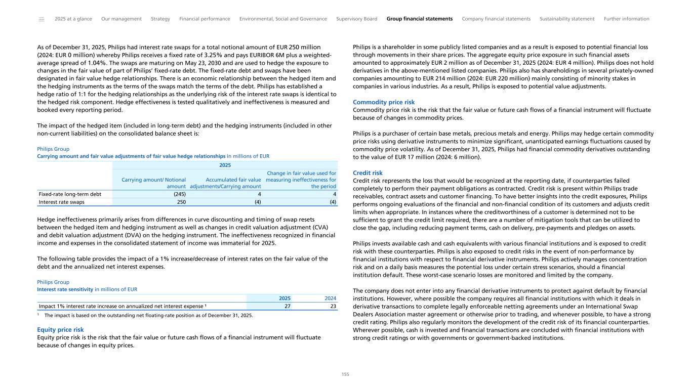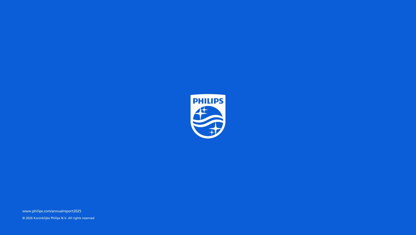 PDF/printed version This document is the PDF/printed version of the 2025 Annual Report of Royal Philips and has been prepared for ease of use. The 2025 Annual Report was made publicly available pursuant to section 5:25c of the Dutch Financial Supervision Act (Wet op het financieel toezicht) and was filed with Netherlands Authority for the Financial Markets in European single electronic reporting format (the ESEF package) on February 19, 2026. The ESEF package is available on the company’s website at https://www.results.philips.com/downloadcenter#ar25 and includes a human readable XHTML version of the 2025 Annual Report. In any case of discrepancies between this PDF version and the ESEF package, the latter prevails. IFRS basis of presentation The financial information included in this document is based on IFRS, as explained in General information to the Consolidated financial statements, unless otherwise indicated. Forward-looking statements This document contains certain forward-looking statements. By their nature, these statements involve risk and uncertainty. For more information, please refer to Forward-looking statements and other information. References to Philips References to the company, to Philips or the (Philips) Group or group, relate to Koninklijke Philips N.V. and its subsidiaries, as the context requires. Royal Philips refers to Koninklijke Philips N.V. Dutch Financial Markets Supervision Act This document comprises regulated information within the meaning of the Dutch Financial Markets Supervision Act (Wet op het financieel toezicht). Statutory financial statements and management report The chapters Group financial statements and Company financial statements contain the statutory financial statements of the company. Under ’Management report’ in section References to the content of this Annual Report we set out which parts of this Annual Report form the Management report within the meaning of Section 2:391 of the Dutch Civil Code. Due to rounding, amounts may not add up precisely to the totals provided in this report. ______ 2025 at a glance Our management Strategy Financial performance Environmental, Social and Governance Supervisory Board Group financial statements Company financial statements Sustainability statement Further information 2
