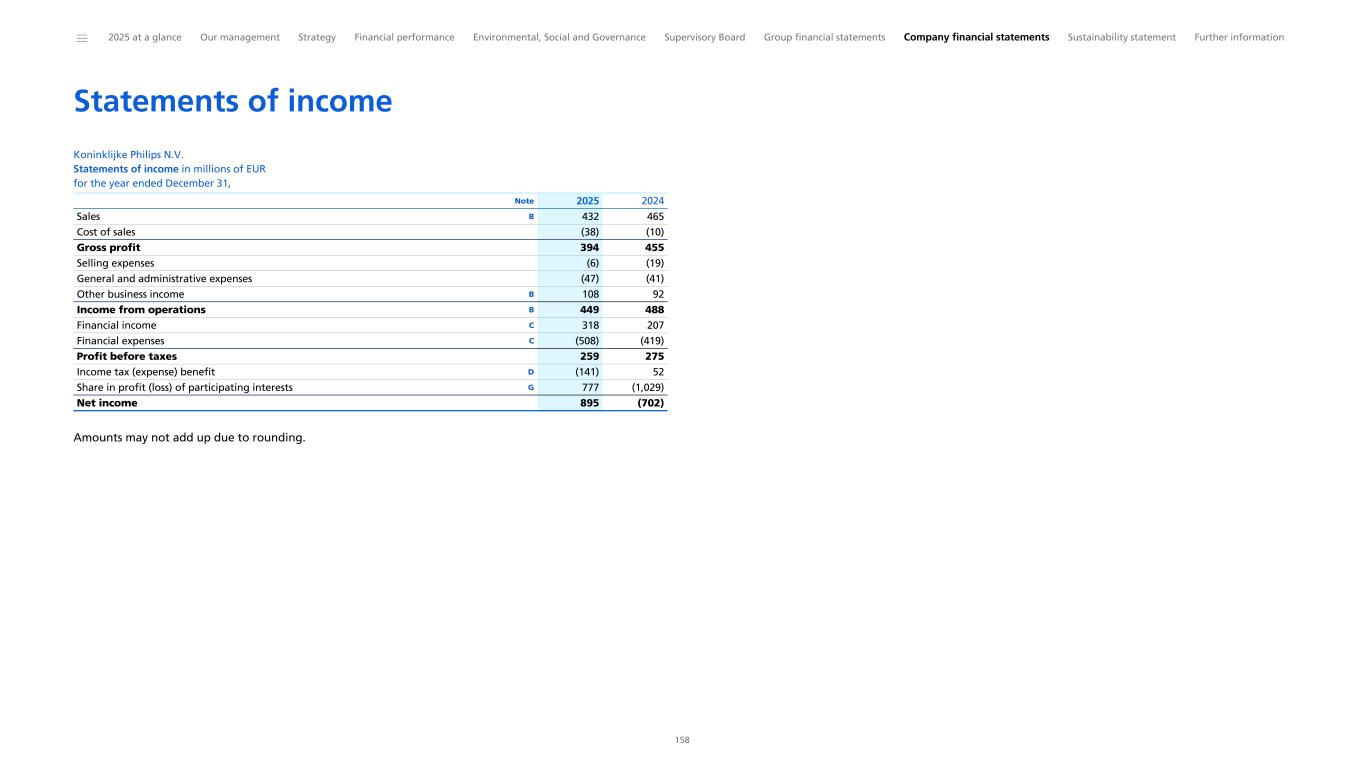 Consolidated statements of income Philips Group Consolidated statements of income in millions of EUR for the year ended December 31, Sales 6 17,834 18,021 18,169 Cost of sales (9,776) (10,248) (10,721) Gross margin 8,058 7,773 7,448 Selling expenses (4,342) (4,486) (4,524) General and administrative expenses (628) (582) (608) Research and development expenses (1,700) (1,747) (1,890) Other business income 6 87 590 112 Other business expenses 6 (51) (1,019) (652) Income from operations 6 1,424 529 (115) Financial income 7 113 105 63 Financial expenses 7 (346) (387) (376) Results of associates (9) (124) (98) Income before taxes 1,182 123 (526) Income tax (expense) benefit 8 (282) (963) 73 Income from continuing operations 901 (840) (454) Discontinued operations, net of income taxes 3 (4) 142 (10) Net income 897 (698) (463) Attribution of net income: Net income attributable to shareholders of Koninklijke Philips N.V. 895 (702) (466) Net income attributable to non-controlling interests 1 3 2 Note 2025 2024 2023 Philips Group Earnings per common share attributable to shareholders of Koninklijke Philips N.V. in EUR for the year ended December 31, Basic earnings per common share Income from continuing operations 0.95 (0.90) (0.48) Net income 0.94 (0.75) (0.49) Diluted earnings per common share Income from continuing operations 0.93 (0.90) (0.48) Net income 0.93 (0.75) (0.49) 2025 2024 2023 Consolidated statements of comprehensive income Philips Group Consolidated statements of comprehensive income in millions of EUR for the year ended December 31, Net income 897 (698) (463) Pensions and other-post employment plans: 20 Remeasurement, before tax 8 (18) (26) Income tax effect on remeasurements 8 (3) 12 3 Financial assets fair value through OCI: Net current-period change, before tax (20) (21) (20) Income tax effect on net current-period change - 9 3 Total of items that will not be reclassified to Income Statement (15) (17) (40) Currency translation differences: Net current period change, before tax (1,641) 768 (579) Reclassification adjustment for (gain) loss realized (33) (7) (26) Income tax effect on net current-period change and reclassification 8 3 (8) - Cash flow hedges: Net current-period change, before tax 73 21 29 Reclassification adjustment for (gain) loss realized (29) (29) (19) Income tax effect on net current-period change and reclassification 8 (12) 3 (2) Total of items that are or may be reclassified to Income Statement (1,638) 748 (597) Other comprehensive income (1,653) 731 (637) Total comprehensive income (757) 33 (1,100) Total comprehensive income attributable to: Shareholders of Koninklijke Philips N.V. (754) 27 (1,101) Non-controlling interests (2) 6 1 Note 2025 2024 2023 Amounts may not add up due to rounding. ______ 2025 at a glance Our management Strategy Financial performance Environmental, Social and Governance Supervisory Board Group financial statements Company financial statements Sustainability statement Further information 92