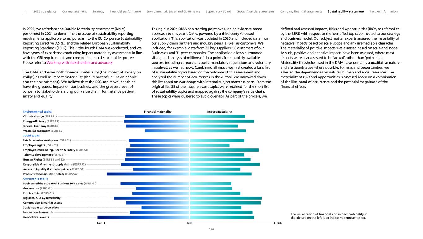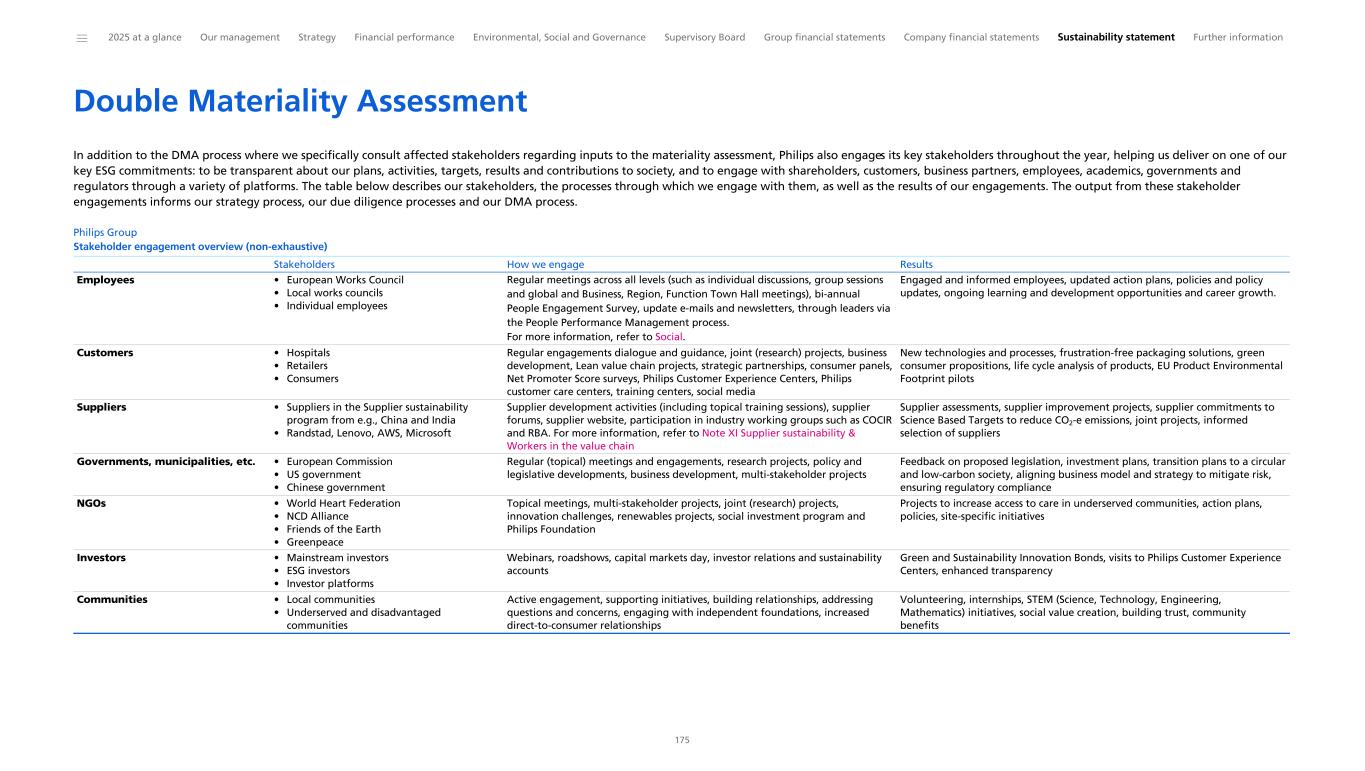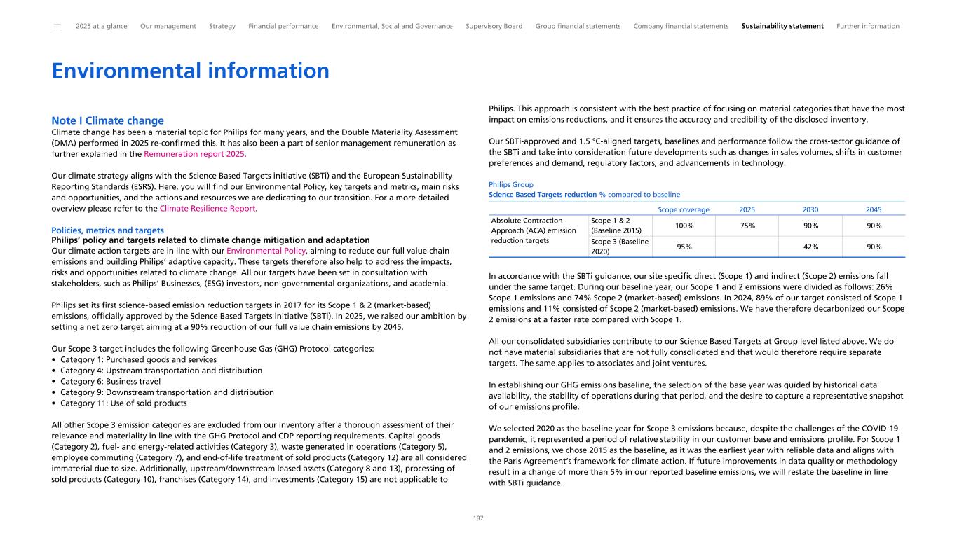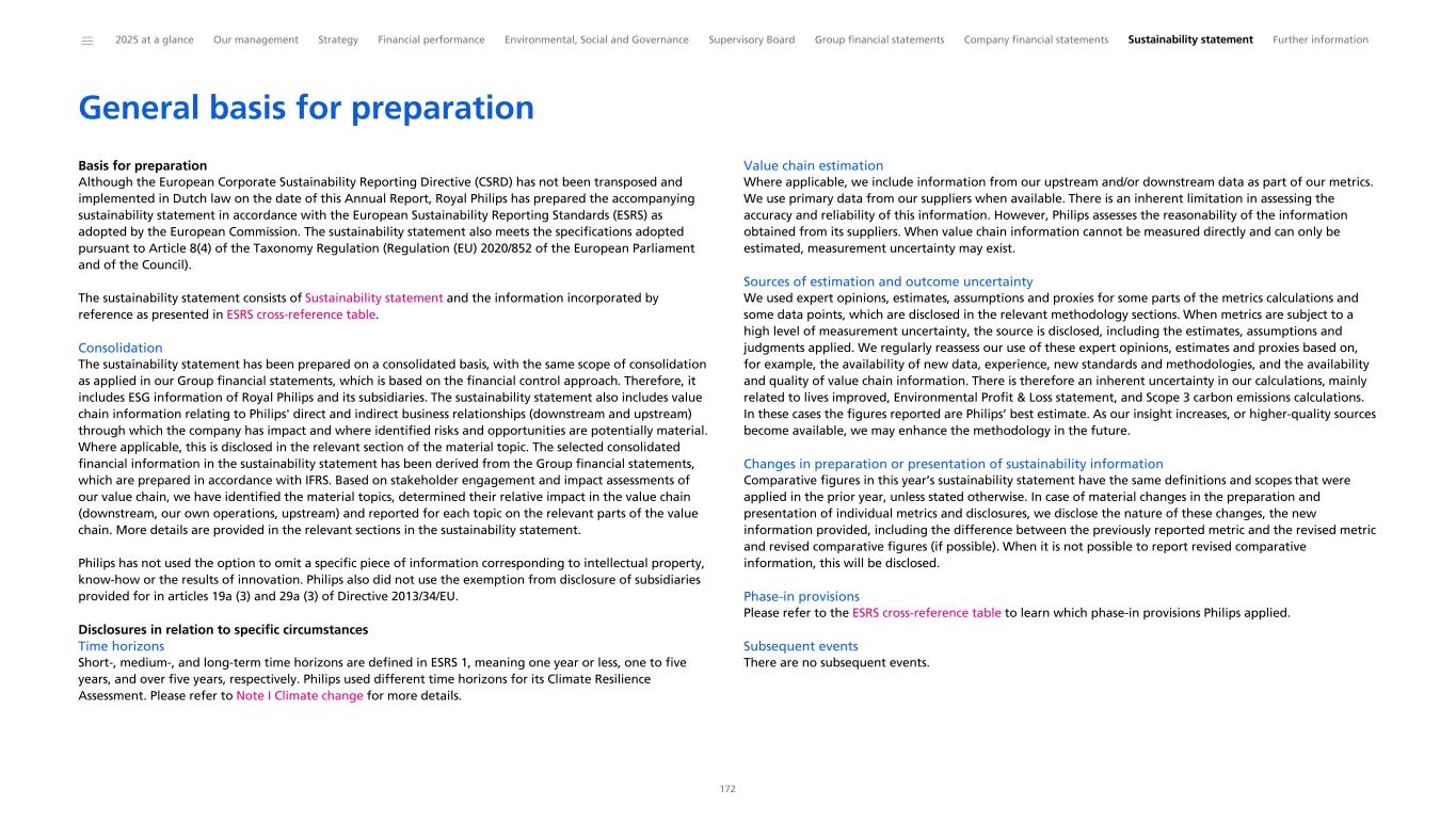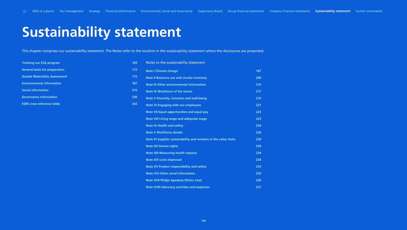 “We are proud of the results achieved in 2025, as we delivered on our 2020-2025 program. Our new 2030 Impact Ambitions are a next step in delivering better care for more people and creating sustainable long-term value for our stakeholders.” Marnix van Ginneken Chief ESG & Legal Officer Royal Philips Philips has a long history of doing business responsibly and sustainably. It drives everything we do: our business performance, innovation and collaboration. Our efforts are a great source of pride for employees and contribute to the adoption and scaling of business practices across industries, for example, in climate action, circularity, tax transparency, supplier sustainability and sustainability reporting. We started our environmental programs in the 1980s and these were focused on reducing the environmental impact of our sites. This was later enhanced by our EcoDesign program, through which we aimed to reduce the environmental impact of our products, with a focus on circularity, reduced materials usage and energy consumption. After that, we included the impact of our value chain, first through our supplier sustainability program, followed by engagements with our customers. This culminated in our Science Based Targets. We are proud to be the first healthcare company that had its value chain emission reduction plan validated and approved by the Science Based Target initiative – toward achieving net zero greenhouse gas emissions by 2045 – and to have been included in the Carbon Disclosure Project's ‘A- list’ for 13 years in a row. Philips has a strong social track record, having been a pioneer with its pension plan and health insurance for its employees in the previous century, paying at least a living wage to its employees, and being recognized as an employer of choice. We also expanded our programs to include employees in our supply chain more than 10 years ago. In addition, we can build on a tradition of sustainability reporting, beginning with our first Environmental Annual Report published in 1999. This Annual Report is our 18th annual integrated financial and sustainability report. Although the Corporate Sustainability Reporting Directive((EU) 2022/2464) has not been implemented into Dutch law yet, the sustainability report included herein has been written to comply with disclosure requirements of the underlying European Sustainability Reporting Standards (ESRS). Refer to General basis for preparation to see which chapters and sections together constitute our sustainability statement. In this chapter, we explain how we act and perform in the environmental and social dimensions, and we describe the main elements of our governance framework. The ESG information in this chapter is further explained and underpinned in greater detail in the Sustainability statement. Following our Double Materiality Assessment, we report in this chapter on these material topics on which ESRS have been published: • Climate change (ESRS E1) • Resource use and circular economy (ESRS E5) • Own workforce (ESRS S1) • Workers in the value chain (ESRS S2) • Consumers and end-users (ESRS S4) • Business conduct (ESRS G1) The sustainability report included herein is aligned with the comprehensive and integrated ESG commitments we had adopted for the period 2020-2025. Marking a step-up from these commitments, on February 10, 2026, we announced our 2030 Impact Ambitions as an integral part of our 2026-2028 strategic plan. Key elements are included in this report, and our next Annual Report will be fully aligned with the 2030 Impact Ambitions. ______ 2025 at a glance Our management Strategy Financial performance Environmental, Social and Governance Supervisory Board Group financial statements Company financial statements Sustainability statement Further information 39