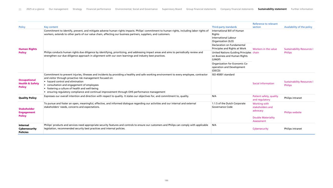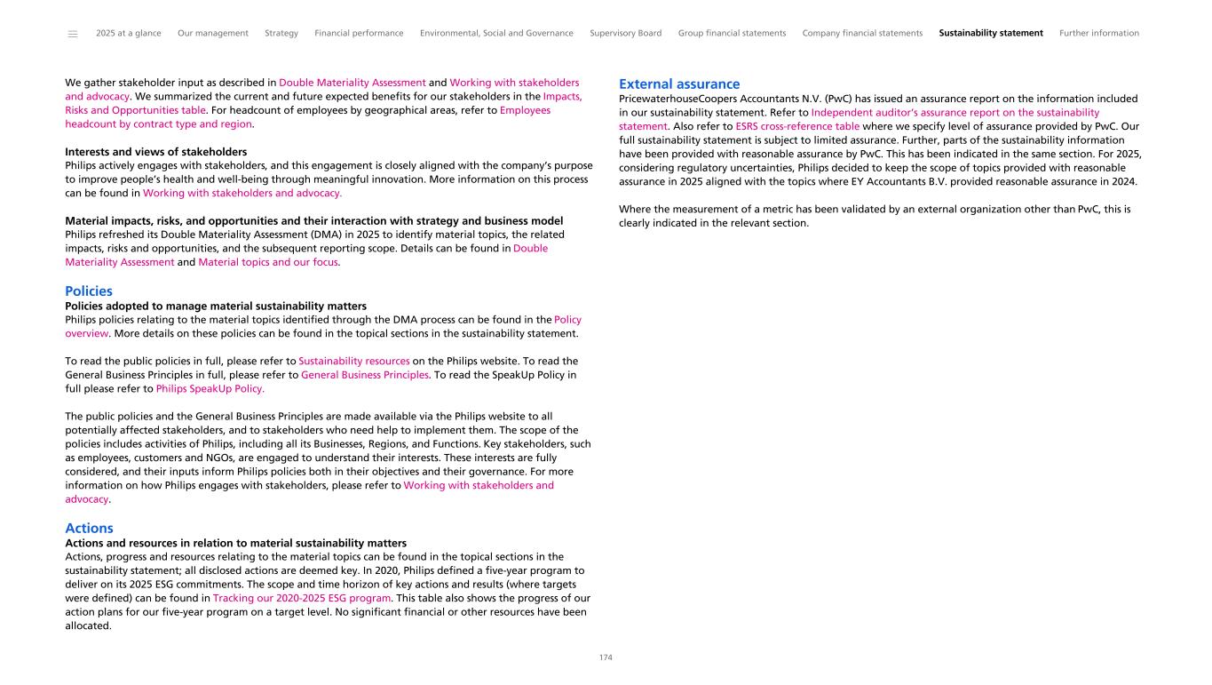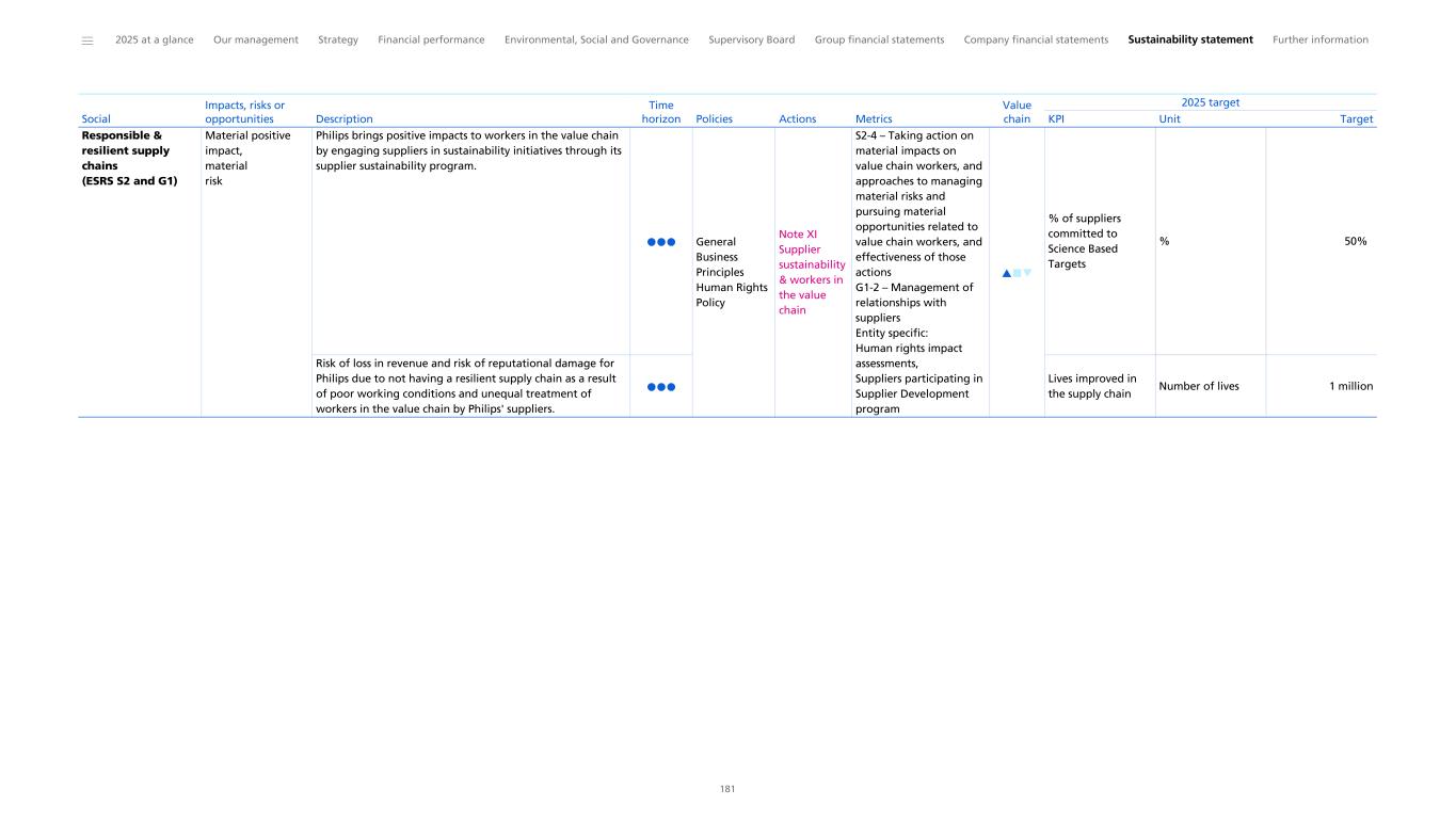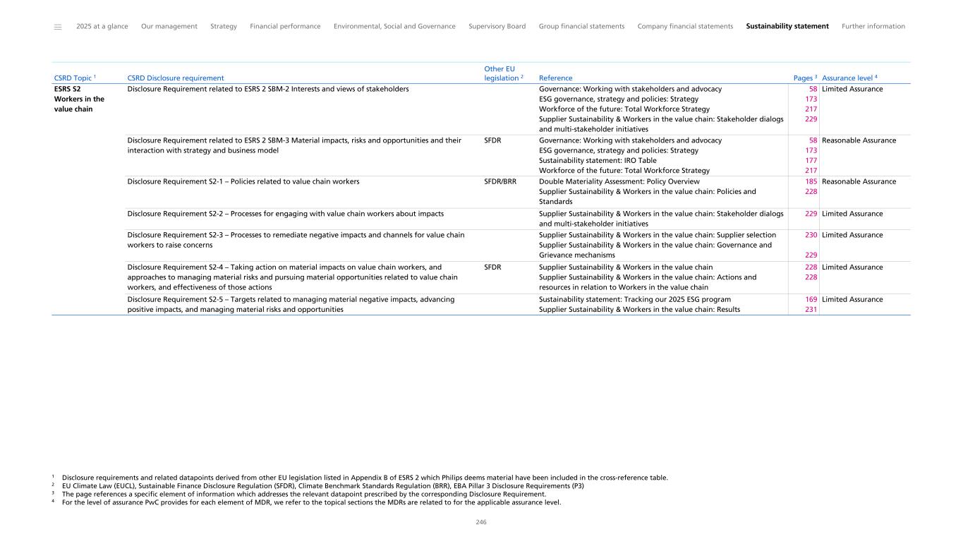 ESRS S2 Workers in the value chain Disclosure Requirement related to ESRS 2 SBM-2 Interests and views of stakeholders Governance: Working with stakeholders and advocacy ESG governance, strategy and policies: Strategy Workforce of the future: Total Workforce Strategy Supplier Sustainability & Workers in the value chain: Stakeholder dialogs and multi-stakeholder initiatives 58 173 217 229 Limited Assurance Disclosure Requirement related to ESRS 2 SBM-3 Material impacts, risks and opportunities and their interaction with strategy and business model SFDR Governance: Working with stakeholders and advocacy ESG governance, strategy and policies: Strategy Sustainability statement: IRO Table Workforce of the future: Total Workforce Strategy 58 173 177 217 Reasonable Assurance Disclosure Requirement S2-1 – Policies related to value chain workers SFDR/BRR Double Materiality Assessment: Policy Overview Supplier Sustainability & Workers in the value chain: Policies and Standards 185 228 Reasonable Assurance Disclosure Requirement S2-2 – Processes for engaging with value chain workers about impacts Supplier Sustainability & Workers in the value chain: Stakeholder dialogs and multi-stakeholder initiatives 229 Limited Assurance Disclosure Requirement S2-3 – Processes to remediate negative impacts and channels for value chain workers to raise concerns 1 Supplier Sustainability & Workers in the value chain: Supplier selection Supplier Sustainability & Workers in the value chain: Governance and Grievance mechanisms 230 229 Limited Assurance Disclosure Requirement S2-4 – Taking action on material impacts on value chain workers, and approaches to managing material risks and pursuing material opportunities related to value chain workers, and effectiveness of those actions SFDR Supplier Sustainability & Workers in the value chain Supplier Sustainability & Workers in the value chain: Actions and resources in relation to Workers in the value chain 228 228 Limited Assurance Disclosure Requirement S2-5 – Targets related to managing material negative impacts, advancing positive impacts, and managing material risks and opportunities 2,3,4 Sustainability statement: Tracking our 2025 ESG program Supplier Sustainability & Workers in the value chain: Results 169 231 Limited Assurance CSRD Topic 1 CSRD Disclosure requirement Other EU legislation 2 Reference Pages 3 Assurance level 4 ______ 2025 at a glance Our management Strategy Financial performance Environmental, Social and Governance Supervisory Board Group financial statements Company financial statements Sustainability statement Further information 246 1 Disclosure requirements and related datapoints derived from other EU legislation listed in Appendix B of ESRS 2 which Philips deems material have been included in the cross-reference table. 2 EU Climate Law (EUCL), Sustainable Finance Disclosure Regulation (SFDR), Climate Benchmark Standards Regulation (BRR), EBA Pillar 3 Disclosure Requirements (P3) 3 The page references a specific element of information which addresses the relevant datapoint prescribed by the corresponding Disclosure Requirement. 4 For the level of assurance PwC provides for each element of MDR, we refer to the topical sections the MDRs are related to for the applicable assurance level.