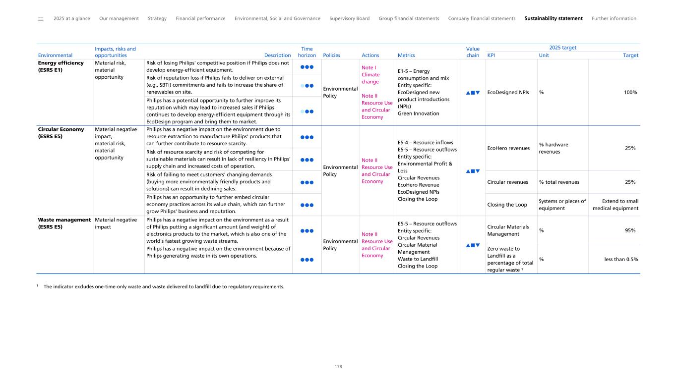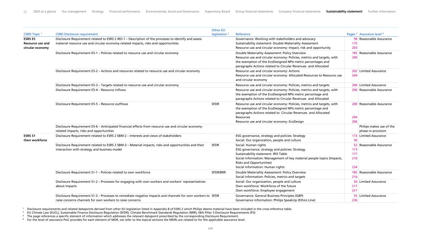 ESRS E5 Resource use and circular economy Disclosure Requirement related to ESRS 2 IRO-1 – Description of the processes to identify and assess material resource use and circular economy-related impacts, risks and opportunities Governance: Working with stakeholders and advocacy Sustainability statement: Double Materiality Assessment Resource use and circular economy: Impact, risk and opportunity 58 175 203 Reasonable Assurance Disclosure Requirement E5-1 – Policies related to resource use and circular economy Double Materiality Assessment: Policy Overview Resource use and circular economy: Policies, metrics and targets, with the exemption of the EcoDesigned NPIs metric percentages and paragraphs Actions related to Circular Revenues and Allocated 185 200 Reasonable Assurance Disclosure Requirement E5-2 – Actions and resources related to resource use and circular economy Resource use and circular economy: Actions Resource use and circular economy: Allocated Resources to Resource use and circular economy 202 204 Limited Assurance Disclosure Requirement E5-3 – Targets related to resource use and circular economy Resource use and circular economy: Policies, metrics and targets 200 Limited Assurance Disclosure Requirement E5-4 – Resource inflows Resource use and circular economy: Policies, metrics and targets, with the exemption of the EcoDesigned NPIs metric percentage and paragraphs Actions related to Circular Revenues and Allocated 200 Reasonable Assurance Disclosure Requirement E5-5 – Resource outflows SFDR Resource use and circular economy: Policies, metrics and targets, with the exemption of the EcoDesigned NPIs metric percentage and paragraphs Actions related to Circular Revenues and Allocated Resources Resource use and circular economy: EcoDesign 200 204 206 Reasonable Assurance Disclosure Requirement E5-6 – Anticipated financial effects from resource use and circular economy- related impacts, risks and opportunities 1,2,3,4 Philips makes use of the phase-in provision ESRS S1 Own workforce Disclosure Requirement related to ESRS 2 SBM-2 – Interests and views of stakeholders ESG governance, strategy and policies: Strategy Social: Our organization, people and culture 173 50 Limited Assurance Disclosure Requirement related to ESRS 2 SBM-3 – Material impacts, risks and opportunities and their interaction with strategy and business model SFDR Social: Human rights ESG governance, strategy and policies: Strategy Sustainability statement: IRO Table Social information: Management of key material people topics (Impacts, Risks and Opportunities) Social information: Human rights 52 173 177 216 234 Reasonable Assurance Disclosure Requirement S1-1 – Policies related to own workforce SFDR/BRR Double Materiality Assessment: Policy Overview Social information: Policies, metrics and targets 185 216 Reasonable Assurance Disclosure Requirement S1-2 – Processes for engaging with own workers and workers’ representatives about impacts Social: Our organization, people and culture Own workforce: Workforce of the future Own workforce: Employee engagement 50 217 221 Limited Assurance Disclosure Requirement S1-3 – Processes to remediate negative impacts and channels for own workers to raise concerns channels for own workers to raise concerns SFDR Governance: General Business Principles (GBP) Governance information: Philips SpeakUp (Ethics Line) 55 236 Limited Assurance CSRD Topic 1 CSRD Disclosure requirement Other EU legislation 2 Reference Pages 3 Assurance level 4 ______ 2025 at a glance Our management Strategy Financial performance Environmental, Social and Governance Supervisory Board Group financial statements Company financial statements Sustainability statement Further information 244 1 Disclosure requirements and related datapoints derived from other EU legislation listed in Appendix B of ESRS 2 which Philips deems material have been included in the cross-reference table. 2 EU Climate Law (EUCL), Sustainable Finance Disclosure Regulation (SFDR), Climate Benchmark Standards Regulation (BRR), EBA Pillar 3 Disclosure Requirements (P3) 3 The page references a specific element of information which addresses the relevant datapoint prescribed by the corresponding Disclosure Requirement. 4 For the level of assurance PwC provides for each element of MDR, we refer to the topical sections the MDRs are related to for the applicable assurance level.