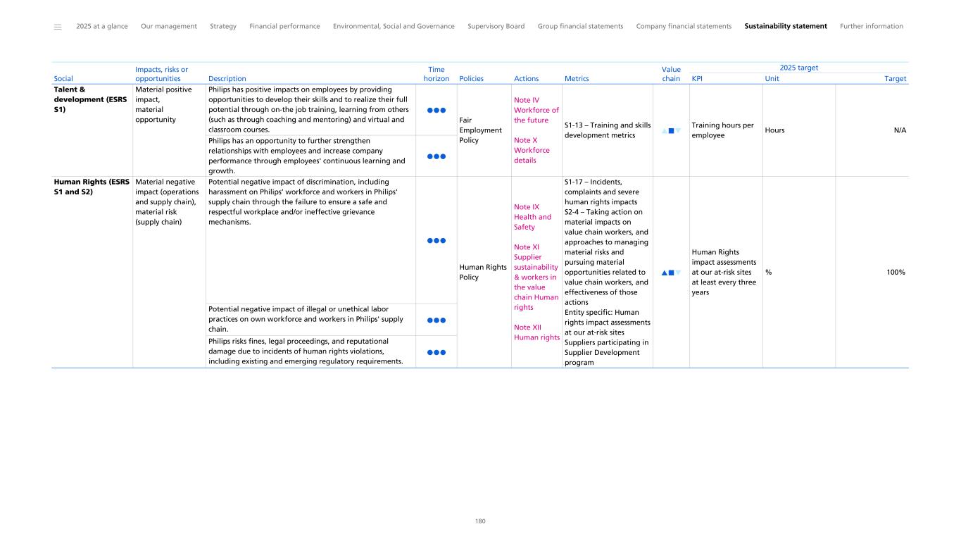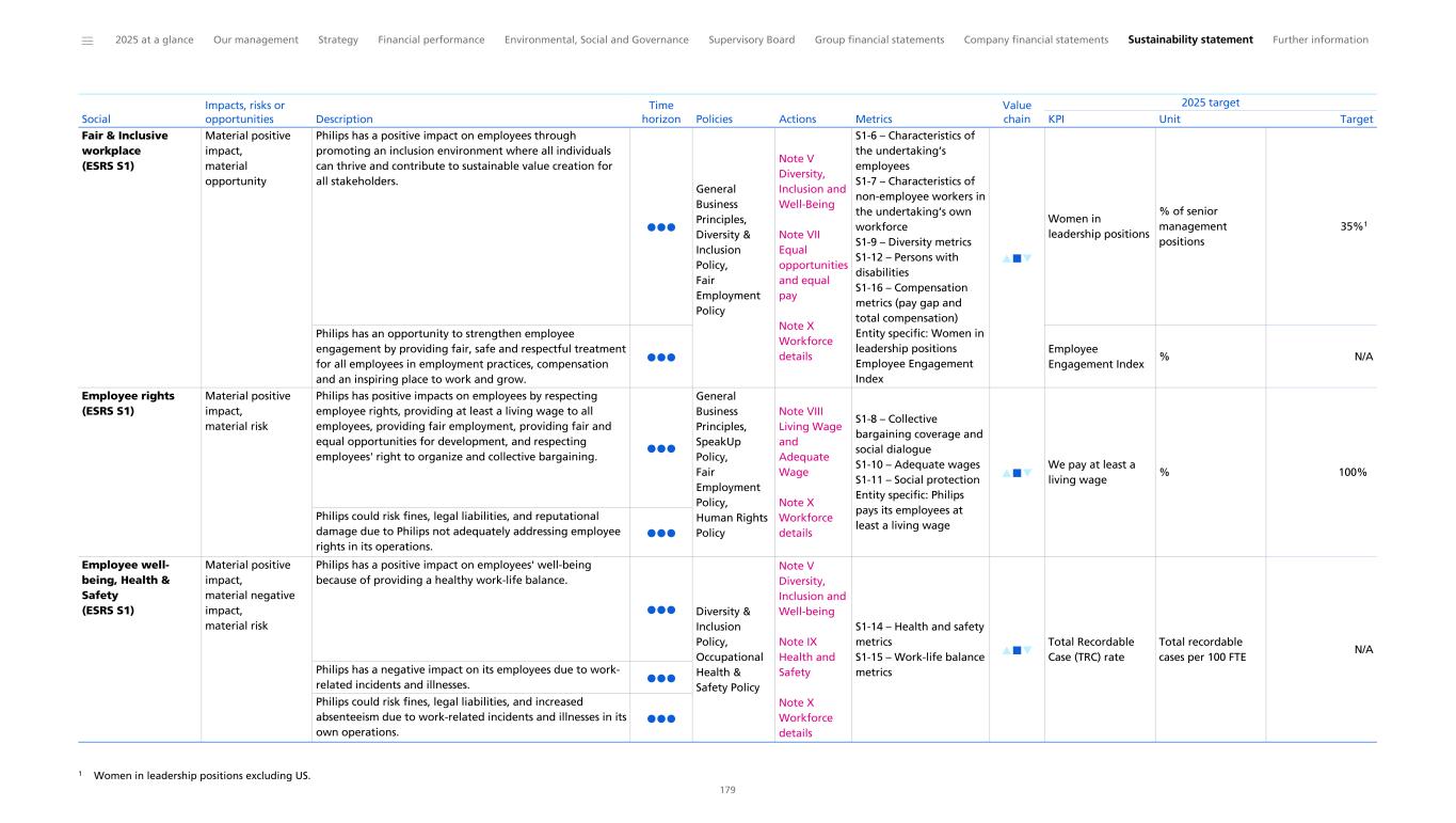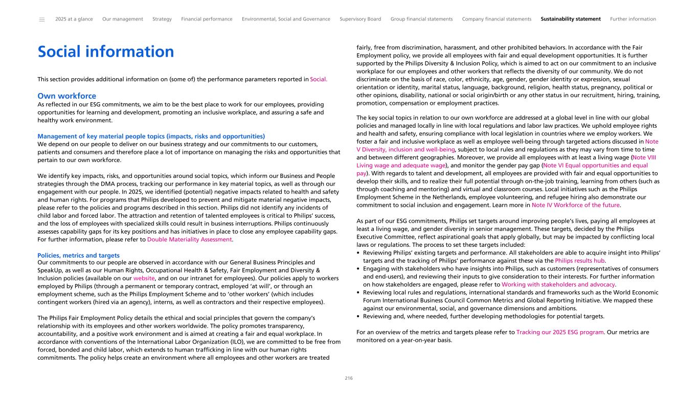 Social information This section provides additional information on (some of) the performance parameters reported in Social. Own workforce As reflected in our ESG commitments, we aim to be the best place to work for our employees, providing opportunities for learning and development, promoting an inclusive workplace, and assuring a safe and healthy work environment. Management of key material people topics (impacts, risks and opportunities) We depend on our people to deliver on our business strategy and our commitments to our customers, patients and consumers and therefore place a lot of importance on managing the risks and opportunities that pertain to our own workforce. We identify key impacts, risks, and opportunities around social topics, which inform our Business and People strategies through the DMA process, tracking our performance in key material topics, as well as through our engagement with our people. In 2025, we identified (potential) negative impacts related to health and safety and human rights. For programs that Philips developed to prevent and mitigate material negative impacts, please refer to the policies and programs described in this section. Philips did not identify any incidents of child labor and forced labor. The attraction and retention of talented employees is critical to Philips’ success, and the loss of employees with specialized skills could result in business interruptions. Philips continuously assesses capability gaps for its key positions and has initiatives in place to close any employee capability gaps. For further information, please refer to Double Materiality Assessment. Policies, metrics and targets Our commitments to our people are observed in accordance with our General Business Principles and SpeakUp, as well as our Human Rights, Occupational Health & Safety, Fair Employment and Diversity & Inclusion policies (available on our website, and on our intranet for employees). Our policies apply to workers employed by Philips (through a permanent or temporary contract, employed ‘at will’, or through an employment scheme, such as the Philips Employment Scheme and to ‘other workers’ (which includes contingent workers (hired via an agency), interns, as well as contractors and their respective employees). The Philips Fair Employment Policy details the ethical and social principles that govern the company’s relationship with its employees and other workers worldwide. The policy promotes transparency, accountability, and a positive work environment and is aimed at creating a fair and equal workplace. In accordance with conventions of the International Labor Organization (ILO), we are committed to be free from forced, bonded and child labor, which extends to human trafficking in line with our human rights commitments. The policy helps create an environment where all employees and other workers are treated fairly, free from discrimination, harassment, and other prohibited behaviors. In accordance with the Fair Employment policy, we provide all employees with fair and equal development opportunities. It is further supported by the Philips Diversity & Inclusion Policy, which is aimed to act on our commitment to an inclusive workplace for our employees and other workers that reflects the diversity of our community. We do not discriminate on the basis of race, color, ethnicity, age, gender, gender identity or expression, sexual orientation or identity, marital status, language, background, religion, health status, pregnancy, political or other opinions, disability, national or social origin/birth or any other status in our recruitment, hiring, training, promotion, compensation or employment practices. The key social topics in relation to our own workforce are addressed at a global level in line with our global policies and managed locally in line with local regulations and labor law practices. We uphold employee rights and health and safety, ensuring compliance with local legislation in countries where we employ workers. We foster a fair and inclusive workplace as well as employee well-being through targeted actions discussed in Note V Diversity, inclusion and well-being, subject to local rules and regulations as they may vary from time to time and between different geographies. Moreover, we provide all employees with at least a living wage (Note VIII Living wage and adequate wage), and monitor the gender pay gap (Note VI Equal opportunities and equal pay). With regards to talent and development, all employees are provided with fair and equal opportunities to develop their skills, and to realize their full potential through on-the-job training, learning from others (such as through coaching and mentoring) and virtual and classroom courses. Local initiatives such as the Philips Employment Scheme in the Netherlands, employee volunteering, and refugee hiring also demonstrate our commitment to social inclusion and engagement. Learn more in Note IV Workforce of the future. As part of our ESG commitments, Philips set targets around improving people’s lives, paying all employees at least a living wage, and gender diversity in senior management. These targets, decided by the Philips Executive Committee, reflect aspirational goals that apply globally, but may be impacted by conflicting local laws or regulations. The process to set these targets included: • Reviewing Philips’ existing targets and performance. All stakeholders are able to acquire insight into Philips’ targets and the tracking of Philips’ performance against these via the Philips results hub. • Engaging with stakeholders who have insights into Philips, such as customers (representatives of consumers and end-users), and reviewing their inputs to give consideration to their interests. For further information on how stakeholders are engaged, please refer to Working with stakeholders and advocacy. • Reviewing local rules and regulations, international standards and frameworks such as the W