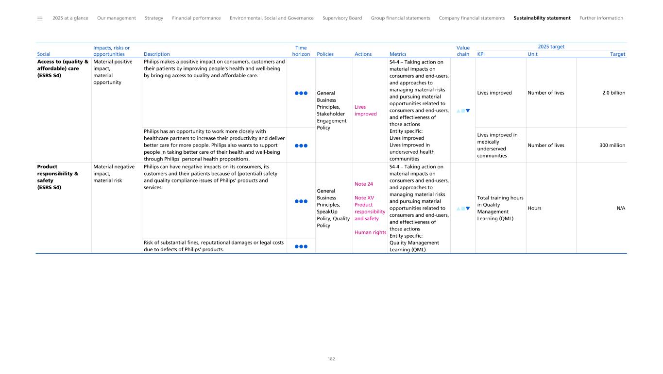 ESRS S4 Consumers and end-users Disclosure Requirement related to ESRS 2 SBM-2 – Interests and views of stakeholders Social: Improving people's lives Governance: Working with stakeholders and advocacy ESG governance, strategy and policies: Strategy 48 58 173 Limited Assurance Disclosure Requirement related to ESRS 2 SBM-3 – Material impacts, risks and opportunities and their interaction with strategy and business mode Social: Improving people's lives Governance: Patient safety, quality and regulatory and the Medical Office Governance: Working with stakeholders and advocacy ESG governance, strategy and policies: Strategy 48 54 58 173 177 Reasonable Assurance Disclosure Requirement S4-1 – Policies related to consumers and end-users SFDR/BRR Governance: General Business Principles (GBP) Double Materiality Assessment: Policy Overview Governance information: Philips SpeakUp (Ethics Line) 55 185 236 Reasonable Assurance Disclosure Requirement S4-2 – Processes for engaging with consumers and end-users about impacts Social: Improving people's lives Governance: General Business Principles (GBP) Governance: Working with stakeholders and advocacy Governance information: Philips SpeakUp (Ethics Line) 48 55 58 236 Limited Assurance Disclosure Requirement S4-3 – Processes to remediate negative impacts and channels for consumers and end-users to raise concerns Social: Improving people's lives Governance: Patient safety, quality and regulatory and the Medical Office Governance: General Business Principles (GBP) 48 54 55 236 Limited Assurance Disclosure Requirement S4-4 – Taking action on material impacts on consumers and end-users, and approaches to managing material risks and pursuing material opportunities related to consumers and end-users, and effectiveness of those actions SFDR Social: Improving people's lives Governance: Patient safety, quality and regulatory and the Medical Office 48 54 235 Limited Assurance Disclosure Requirement S4-5 – Targets related to managing material negative impacts, advancing positive impacts, and managing material risks and opportunities 1,2,3,4 Social: Improving people's lives Sustainability statement: Tracking our 2025 ESG program Sustainability statement: Double Materiality Assessment 48 169 175 Limited Assurance CSRD Topic 1 CSRD Disclosure requirement Other EU legislation 2 Reference Pages 3 Assurance level 4 ______ 2025 at a glance Our management Strategy Financial performance Environmental, Social and Governance Supervisory Board Group financial statements Company financial statements Sustainability statement Further information 247 1 Disclosure requirements and related datapoints derived from other EU legislation listed in Appendix B of ESRS 2 which Philips deems material have been included in the cross-reference table. 2 EU Climate Law (EUCL), Sustainable Finance Disclosure Regulation (SFDR), Climate Benchmark Standards Regulation (BRR), EBA Pillar 3 Disclosure Requirements (P3) 3 The page references a specific element of information which addresses the relevant datapoint prescribed by the corresponding Disclosure Requirement. 4 For the level of assurance PwC provides for each element of MDR, we refer to the topical sections the MDRs are related to for the applicable assurance level.