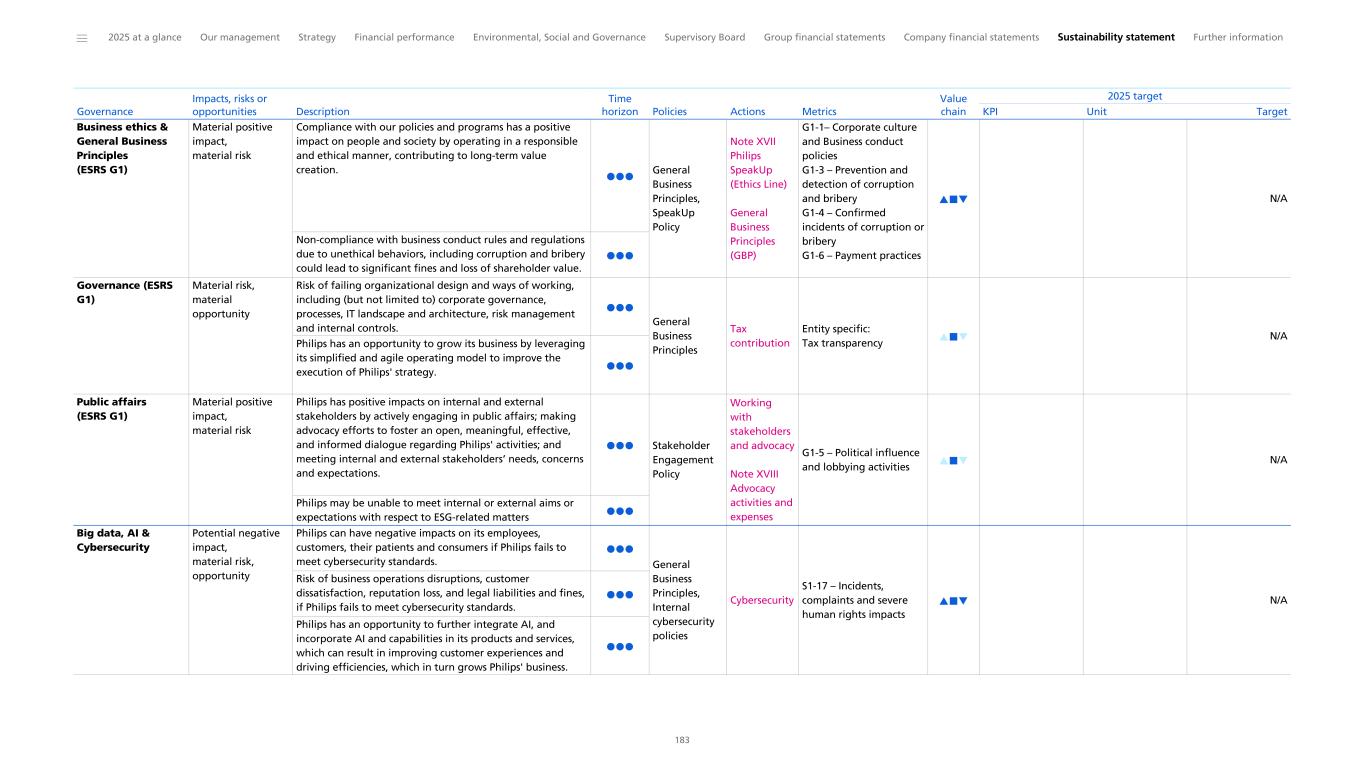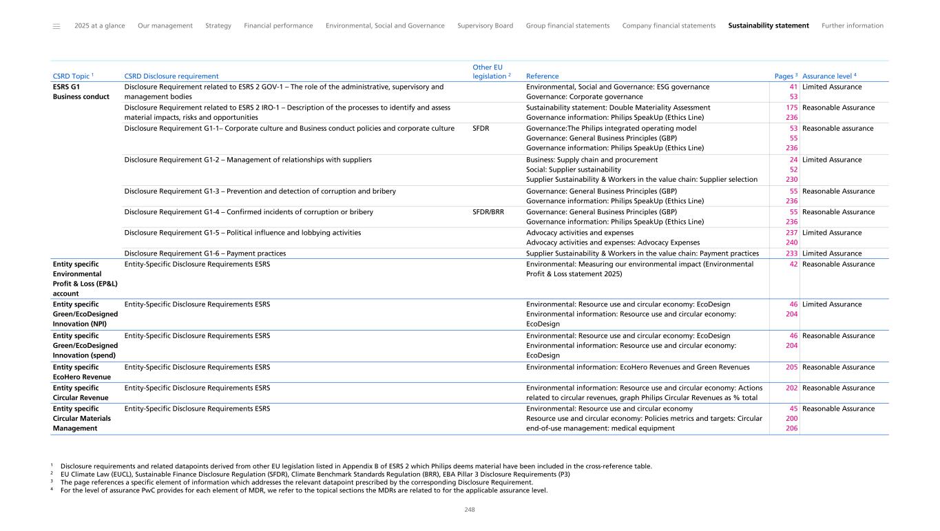 ESRS G1 Business conduct Disclosure Requirement related to ESRS 2 GOV-1 – The role of the administrative, supervisory and management bodies Environmental, Social and Governance: ESG governance Governance: Corporate governance 41 53 Limited Assurance Disclosure Requirement related to ESRS 2 IRO-1 – Description of the processes to identify and assess material impacts, risks and opportunities Sustainability statement: Double Materiality Assessment Governance information: Philips SpeakUp (Ethics Line) 175 236 Reasonable Assurance Disclosure Requirement G1-1– Corporate culture and Business conduct policies and corporate culture SFDR Governance:The Philips integrated operating model Governance: General Business Principles (GBP) Governance information: Philips SpeakUp (Ethics Line) 53 55 236 Reasonable assurance Disclosure Requirement G1-2 – Management of relationships with suppliers Business: Supply chain and procurement Social: Supplier sustainability Supplier Sustainability & Workers in the value chain: Supplier selection 24 52 230 Limited Assurance Disclosure Requirement G1-3 – Prevention and detection of corruption and bribery Governance: General Business Principles (GBP) Governance information: Philips SpeakUp (Ethics Line) 55 236 Reasonable Assurance Disclosure Requirement G1-4 – Confirmed incidents of corruption or bribery SFDR/BRR Governance: General Business Principles (GBP) Governance information: Philips SpeakUp (Ethics Line) 55 236 Reasonable Assurance Disclosure Requirement G1-5 – Political influence and lobbying activities Advocacy activities and expenses Advocacy activities and expenses: Advocacy Expenses 237 240 Limited Assurance Disclosure Requirement G1-6 – Payment practices Supplier Sustainability & Workers in the value chain: Payment practices 233 Limited Assurance Entity specific Environmental Profit & Loss (EP&L) account Entity-Specific Disclosure Requirements ESRS Environmental: Measuring our environmental impact (Environmental Profit & Loss statement 2025) 42 Reasonable Assurance Entity specific Green/EcoDesigned Innovation (NPI) Entity-Specific Disclosure Requirements ESRS Environmental: Resource use and circular economy: EcoDesign Environmental information: Resource use and circular economy: EcoDesign 46 204 Limited Assurance Entity specific Green/EcoDesigned Innovation (spend) Entity-Specific Disclosure Requirements ESRS Environmental: Resource use and circular economy: EcoDesign Environmental information: Resource use and circular economy: EcoDesign 46 204 Reasonable Assurance Entity specific EcoHero Revenue Entity-Specific Disclosure Requirements ESRS Environmental information: EcoHero Revenues and Green Revenues 205 Reasonable Assurance Entity specific Circular Revenue Entity-Specific Disclosure Requirements ESRS Environmental information: Resource use and circular economy: Actions related to circular revenues, graph Philips Circular Revenues as % total 202 Reasonable Assurance Entity specific Circular Materials Management Entity-Specific Disclosure Requirements ESRS 1,2,3,4 Environmental: Resource use and circular economy Resource use and circular economy: Policies metrics and targets: Circular end-of-use management: medical equipment 45 200 206 Reasonable Assurance CSRD Topic 1 CSRD Disclosure requirement Other EU legislation 2 Reference Pages 3 Assurance level 4 ______ 2025 at a glance Our management Strategy Financial performance Environmental, Social and Governance Supervisory Board Group financial statements Company financial statements Sustainability statement Further information 248 1 Disclosure requirements and related datapoints derived from other EU legislation listed in Appendix B of ESRS 2 which Philips deems material have been included in the cross-reference table. 2 EU Climate Law (EUCL), Sustainable Finance Disclosure Regulation (SFDR), Climate Benchmark Standards Regulation (BRR), EBA Pillar 3 Disclosure Requirements (P3) 3 The page references a specific element of information which addresses the relevant datapoint prescribed by the corresponding Disclosure Requirement. 4 For the level of assurance PwC provides for each element of MDR, we refer to the topical sections the MDRs are related to for the applicable assurance level.