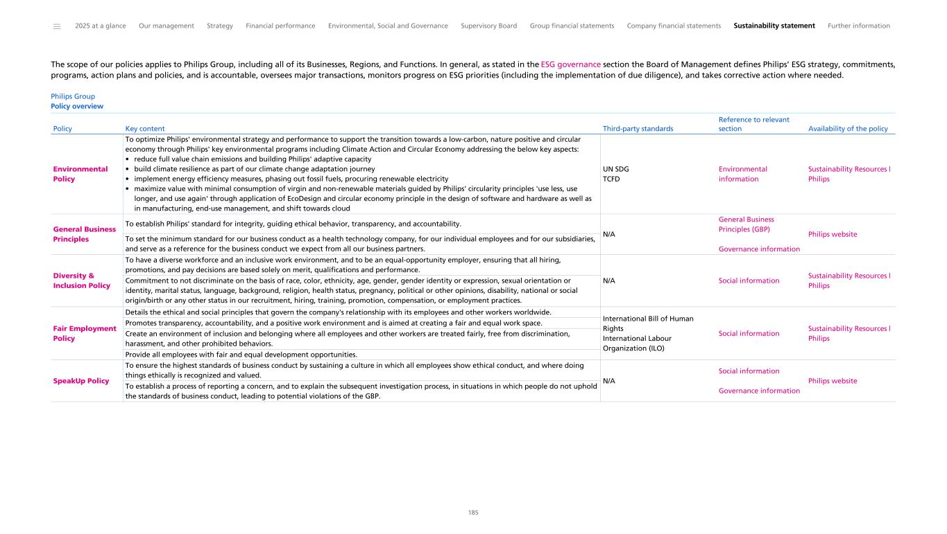 ESRS cross-reference table ESRS 2 General disclosures Disclosure Requirement BP-1 – General basis for preparation of sustainability Sustainability statement: General basis for preparation 172 Limited Assurance Disclosure Requirement BP-2 – Disclosures in relation to specific circumstances Sustainability statement: General basis for preparation 172 Limited Assurance Disclosure Requirement GOV-1 – The role of the administrative, management and supervisory bodies SFDR/BRR Environmental, Social and Governance: ESG governance Governance: Financial reporting and sustainability reporting Supervisory Board report: composition, diversity and self-evaluation Corporate governance report: Supervisory Board - Introduction Other Board-related matters: Diversity 41 62 69 271 274 Limited Assurance Disclosure Requirement GOV-2 – Information provided to and sustainability matters addressed by the undertaking’s administrative, management and supervisory bodies Environmental, Social and Governance: ESG governance 41 Limited Assurance Disclosure Requirement GOV-3 - Integration of sustainability-related performance in incentive schemes Remuneration Report, Non-financial element (30% weighting) Remuneration Report, Sustainability objectives (10% weighting) 80 84 Limited Assurance Disclosure Requirement GOV-4 - Statement on due diligence SFDR ESG governance, strategy and policies: Governance 173 Limited Assurance Disclosure Requirement GOV-5 - Risk management and internal controls over sustainability reporting Environmental, Social and Governance: ESG governance Governance: Financial reporting and sustainability reporting 41 62 Limited Assurance Disclosure Requirement SBM-1 – Strategy, business model and value chain SFDR/P3/BRR Governance: Working with stakeholders and advocacy ESG governance, strategy and policies: Strategy 58 173 Limited Assurance Disclosure Requirement SBM-2 – Interests and views of stakeholders Governance: Working with stakeholders and advocacy ESG governance, strategy and policies: Strategy 58 173 Limited Assurance Disclosure Requirement SBM-3 - Material impacts, risks and opportunities and their interaction with strategy and business model Governance: Working with stakeholders and advocacy ESG governance, strategy and policies: Strategy Sustainability statement: IRO table 58 173 177 Reasonable Assurance Disclosure Requirement IRO-1 - Description of the processes to identify and assess material impacts, risks and opportunities Sustainability statement: Double Materiality Assessment 175 Reasonable Assurance Disclosure Requirement IRO-2 – Disclosure requirements in ESRS covered by the undertaking’s sustainability statement Sustainability statement: Double Materiality Assessment 175 Limited Assurance Minimum disclosure requirement - Policies MDR-P – Policies adopted to manage material sustainability matters ESG governance, strategy and policies: Policies Double Materiality Assessment: Policy Overview 174 185 ⁴ Minimum disclosure requirement - Actions MDR-A – Actions and resources in relation to material sustainability matters ESG governance, strategy and policies: Actions 174 ⁴ CSRD Topic 1 CSRD Disclosure requirement Other EU legislation 2 Reference Pages 3 Assurance level 4 ______ 2025 at a glance Our management Strategy Financial performance Environmental, Social and Governance Supervisory Board Group financial statements Company financial statements Sustainability statement Further information 242 1 Disclosure requirements and related datapoints derived from other EU legislation listed in Appendix B of ESRS 2 which Philips deems material have been included in the cross-reference table. 2 EU Climate Law (EUCL), Sustainable Finance Disclosure Regulation (SFDR), Climate Benchmark Standards Regulation (BRR), EBA Pillar 3 Disclosure Requirements (P3). 3 The page references a specific element of information which addresses the relevant datapoint prescribed by the corresponding Disclosure Requirement. 4 For the level of assurance PwC provides for each element of MDR, we refer to the topical sections where the MDRs are related to for the applicable assurance level.